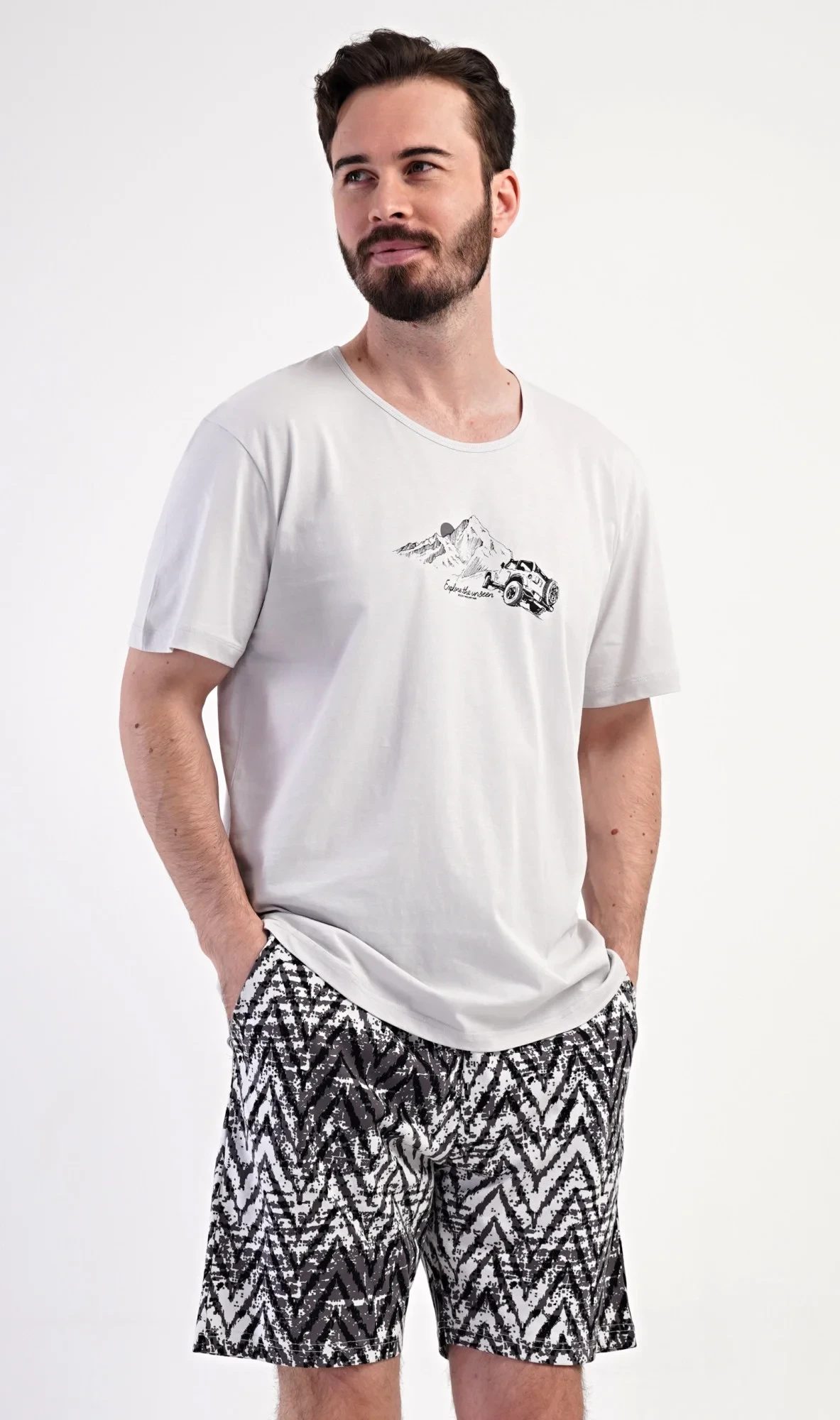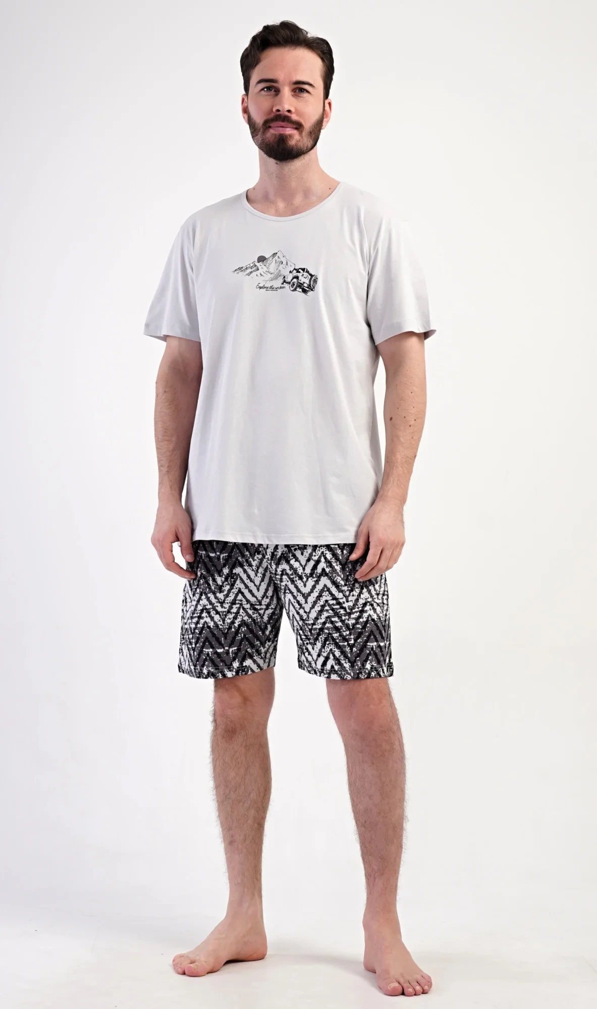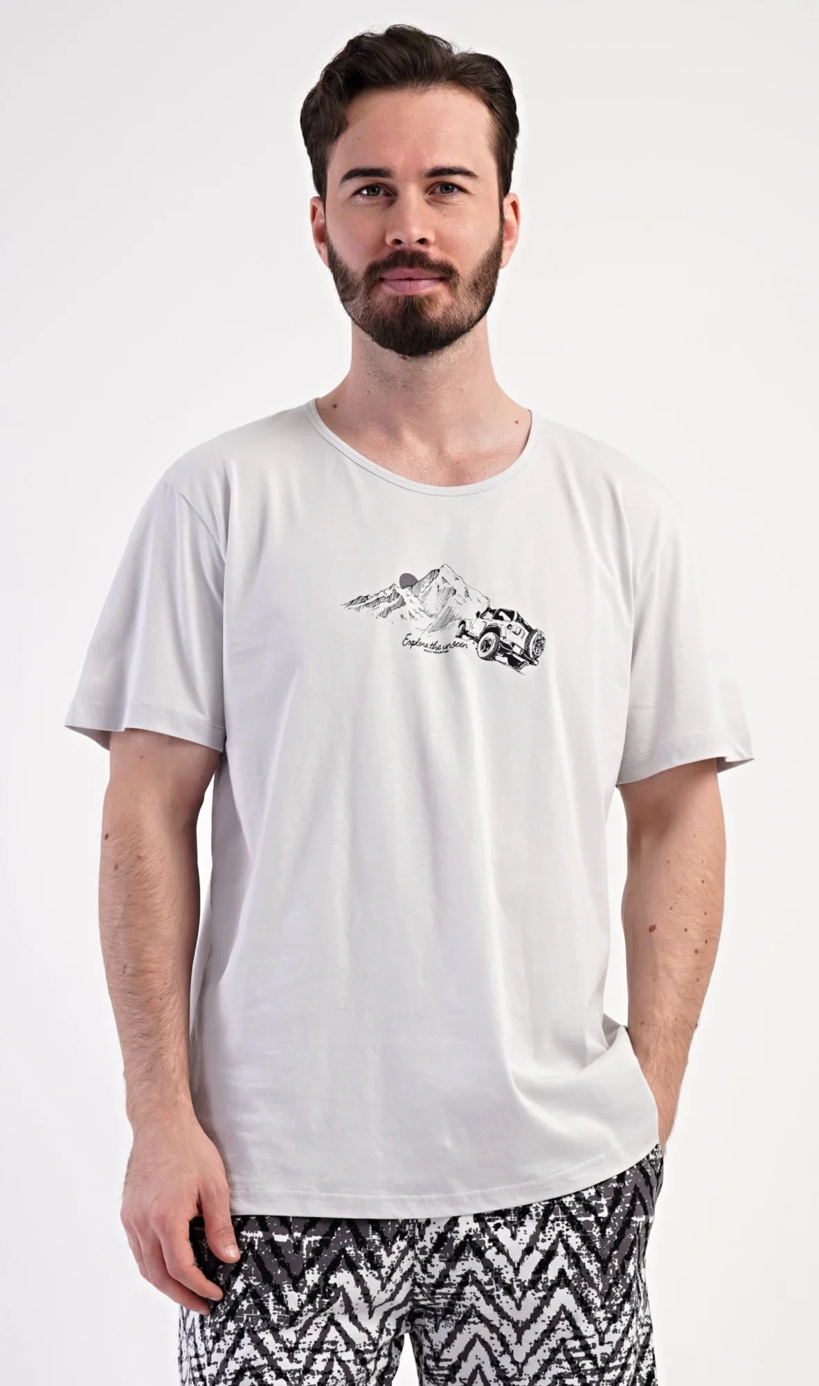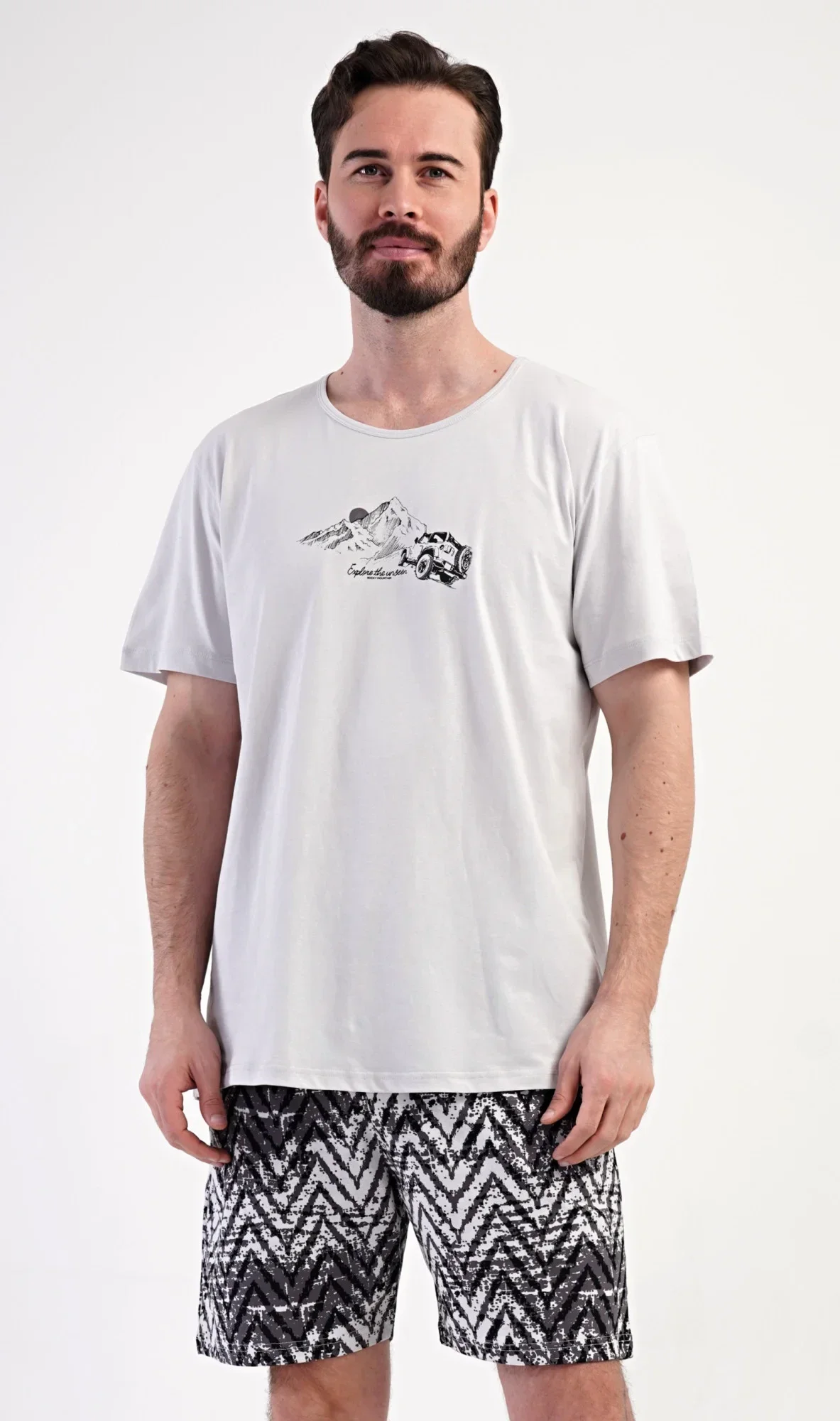 Pánské bavlněné šortkové pyžamo Explorer. Pánské pyžamo se skládá z trička s krátkým rukávem a krátkých šortkových kalhot. Jednobarevné tričko s kulatým výstřihem zdobí na hrudi obázek terénního auta, které jede do hor. Tričko doplňují šortky, které mají v pase gumu, šňůrku na stažení a praktické kapsy. Použitý materiál s obsahem bavlny 100% je příjemný a poddajný na dotek.