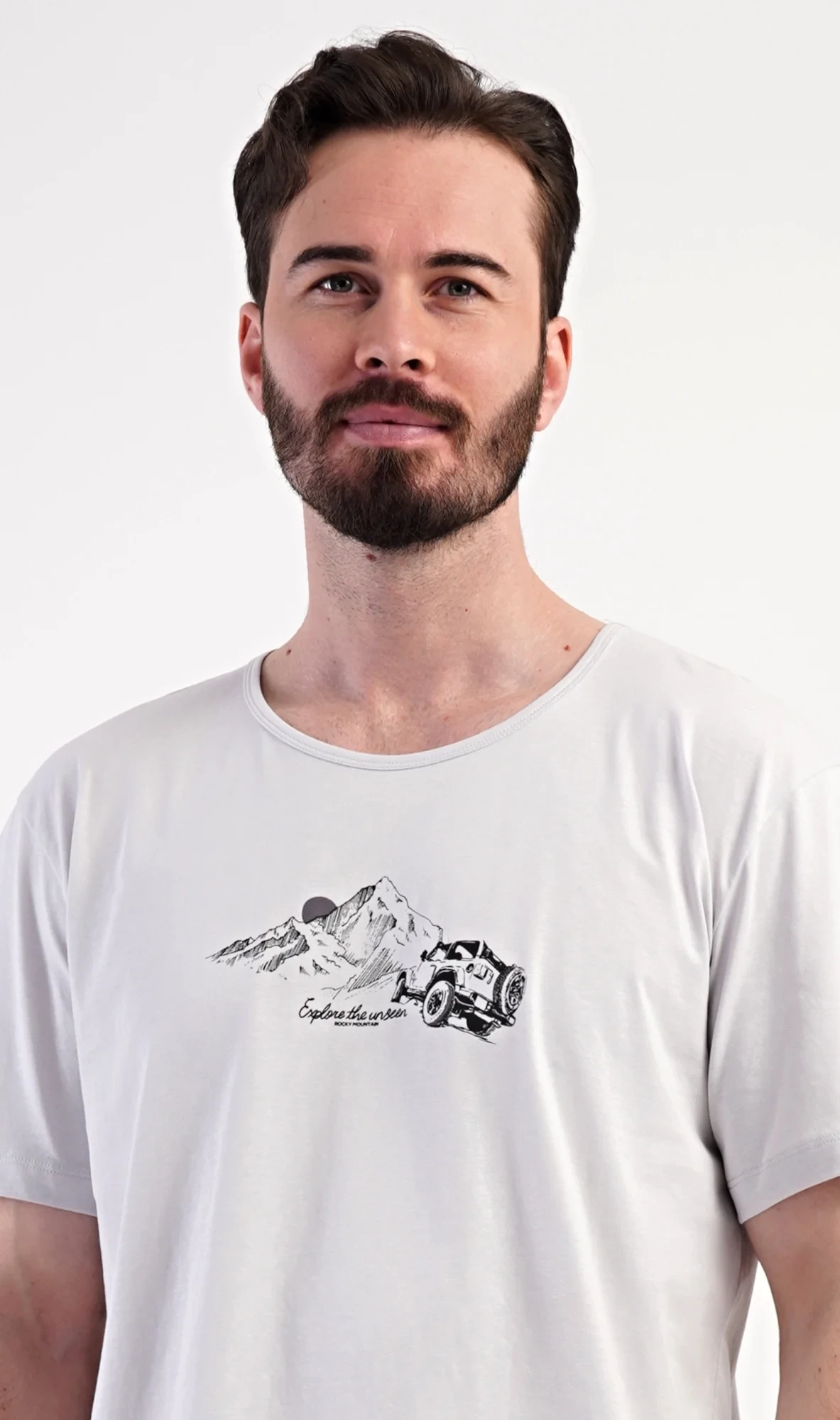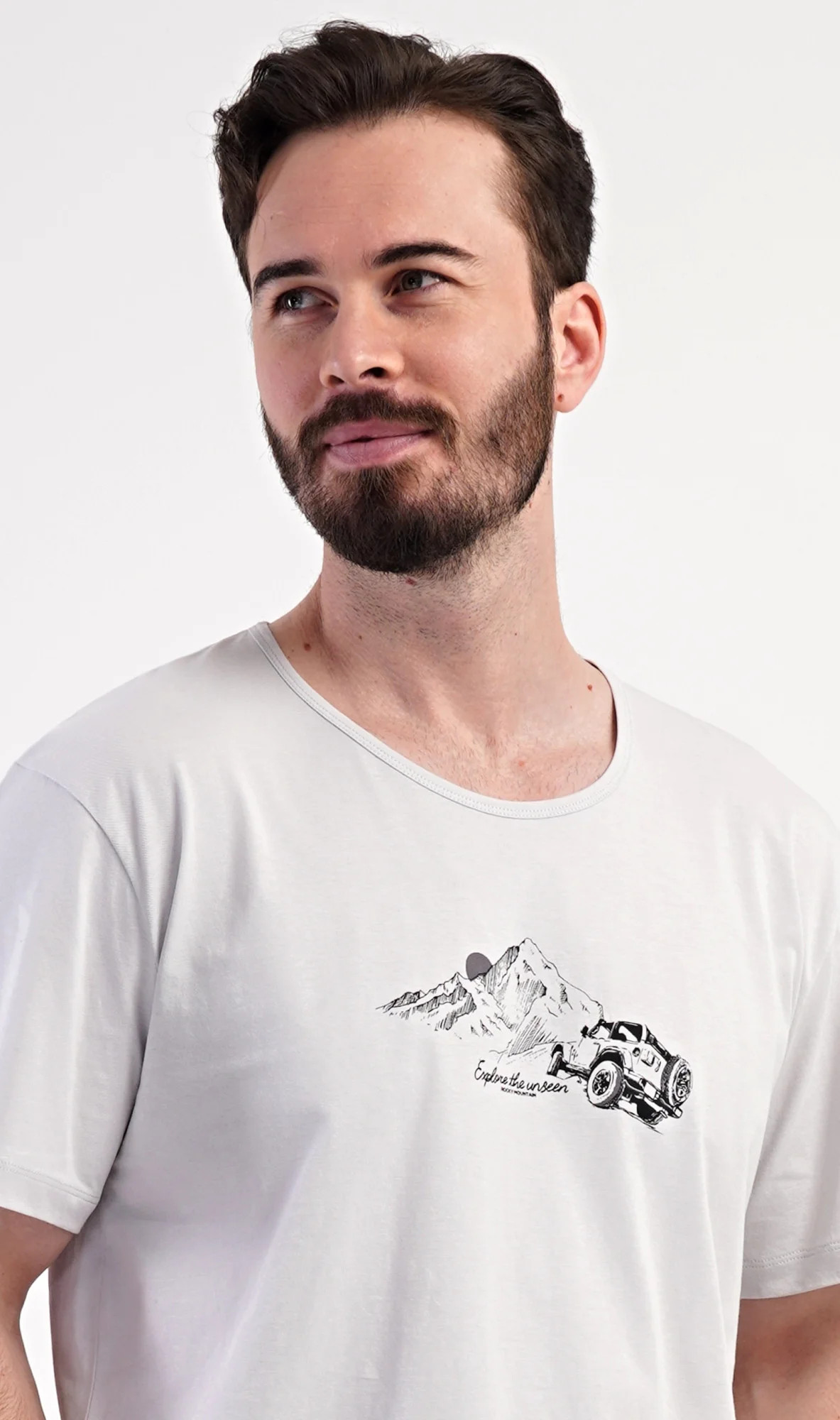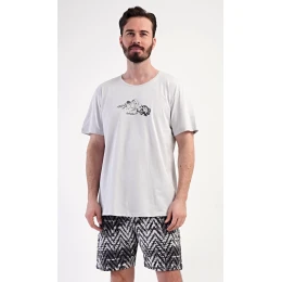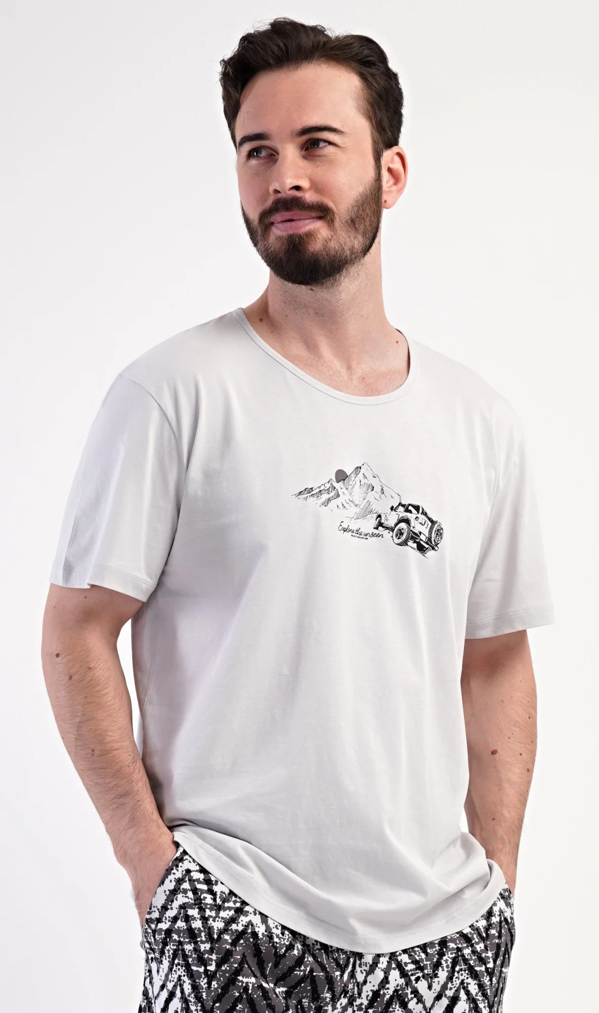 Pánské bavlněné šortkové pyžamo Explorer. Pánské pyžamo se skládá z trička s krátkým rukávem a krátkých šortkových kalhot. Jednobarevné tričko s kulatým výstřihem zdobí na hrudi obázek terénního auta, které jede do hor. Tričko doplňují šortky, které mají v pase gumu, šňůrku na stažení a praktické kapsy. Použitý materiál s obsahem bavlny 100% je příjemný a poddajný na dotek.