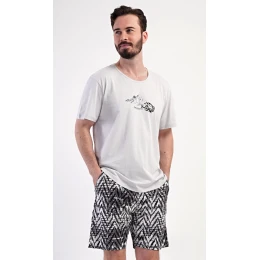 Pánské bavlněné šortkové pyžamo Explorer. Pánské pyžamo se skládá z trička s krátkým rukávem a krátkých šortkových kalhot. Jednobarevné tričko s kulatým výstřihem zdobí na hrudi obázek terénního auta, které jede do hor. Tričko doplňují šortky, které mají v pase gumu, šňůrku na stažení a praktické kapsy. Použitý materiál s obsahem bavlny 100% je příjemný a poddajný na dotek.