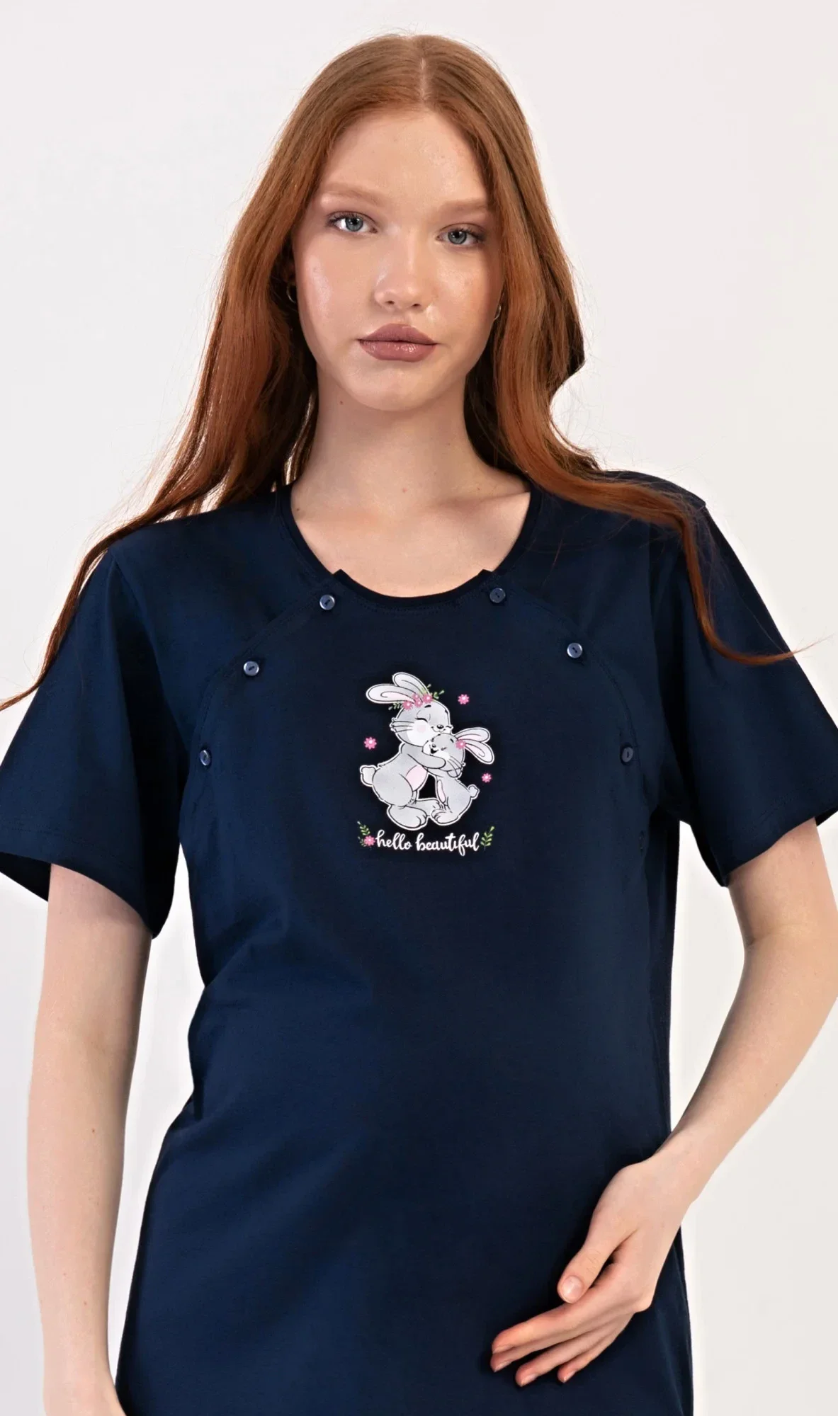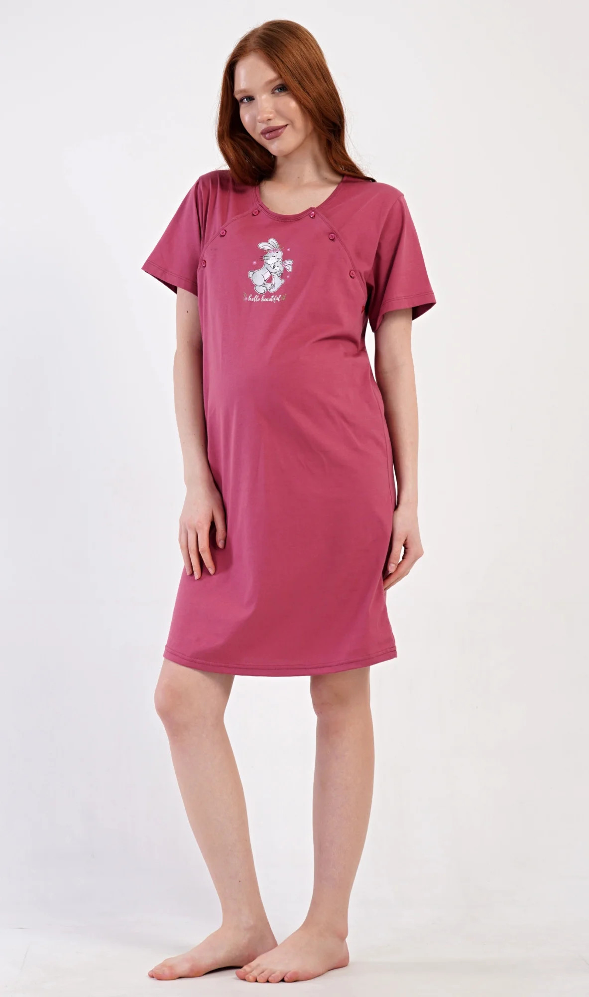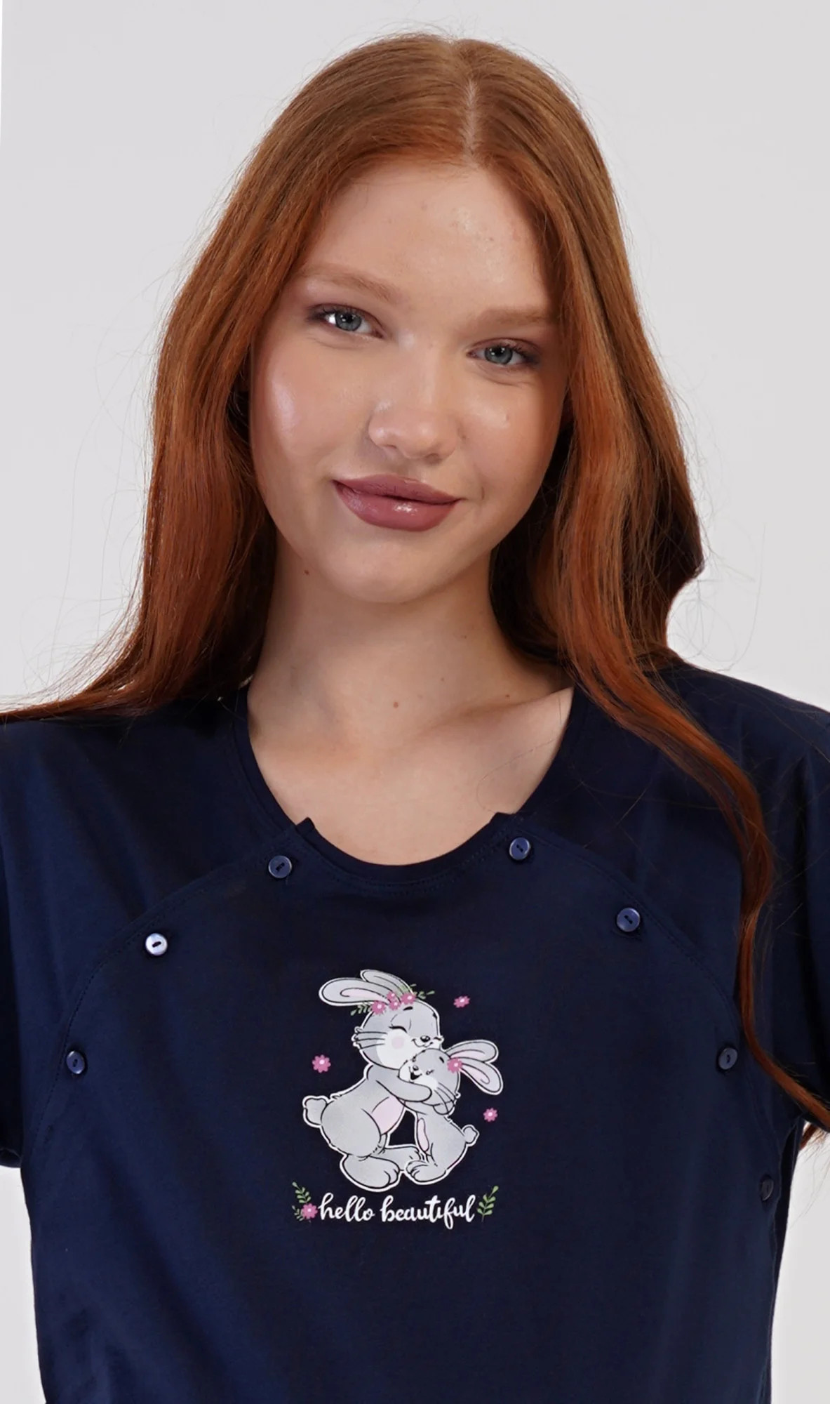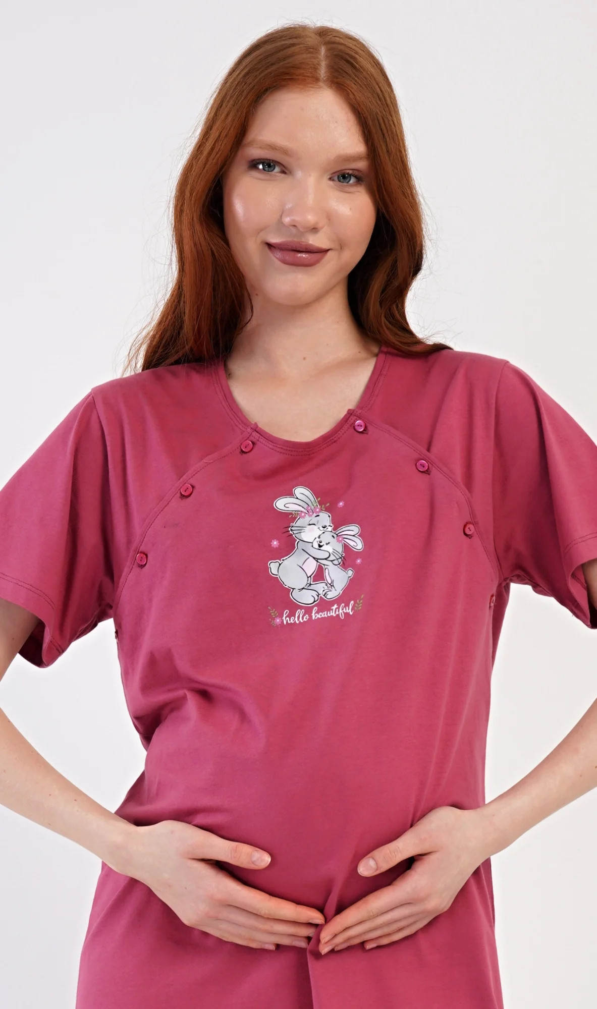 Dámská bavlněná mateřská noční košile Zajíčci. Noční košile je svým střihem určená na dobu těhotenství, do porodnice i ke kojení. Ke kojení slouží průstřihy po stranách košile, které jsou uzavíratelné na knoflíky. Přední díl košile zdobí obrázek veselých zajíčků. Použitý materiál s podílem bavlny 100% je příjemný a poddajný na dotek.
