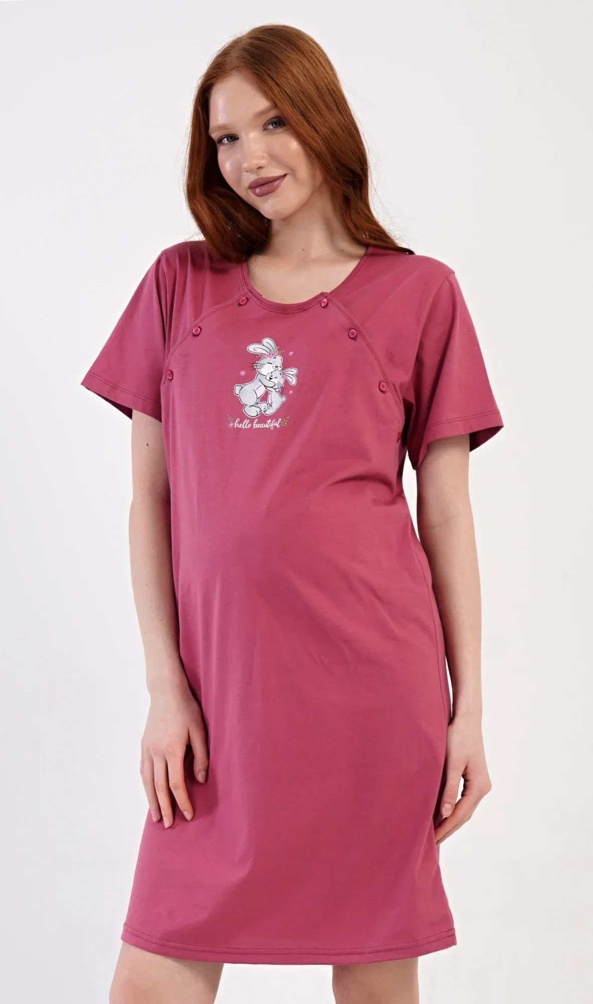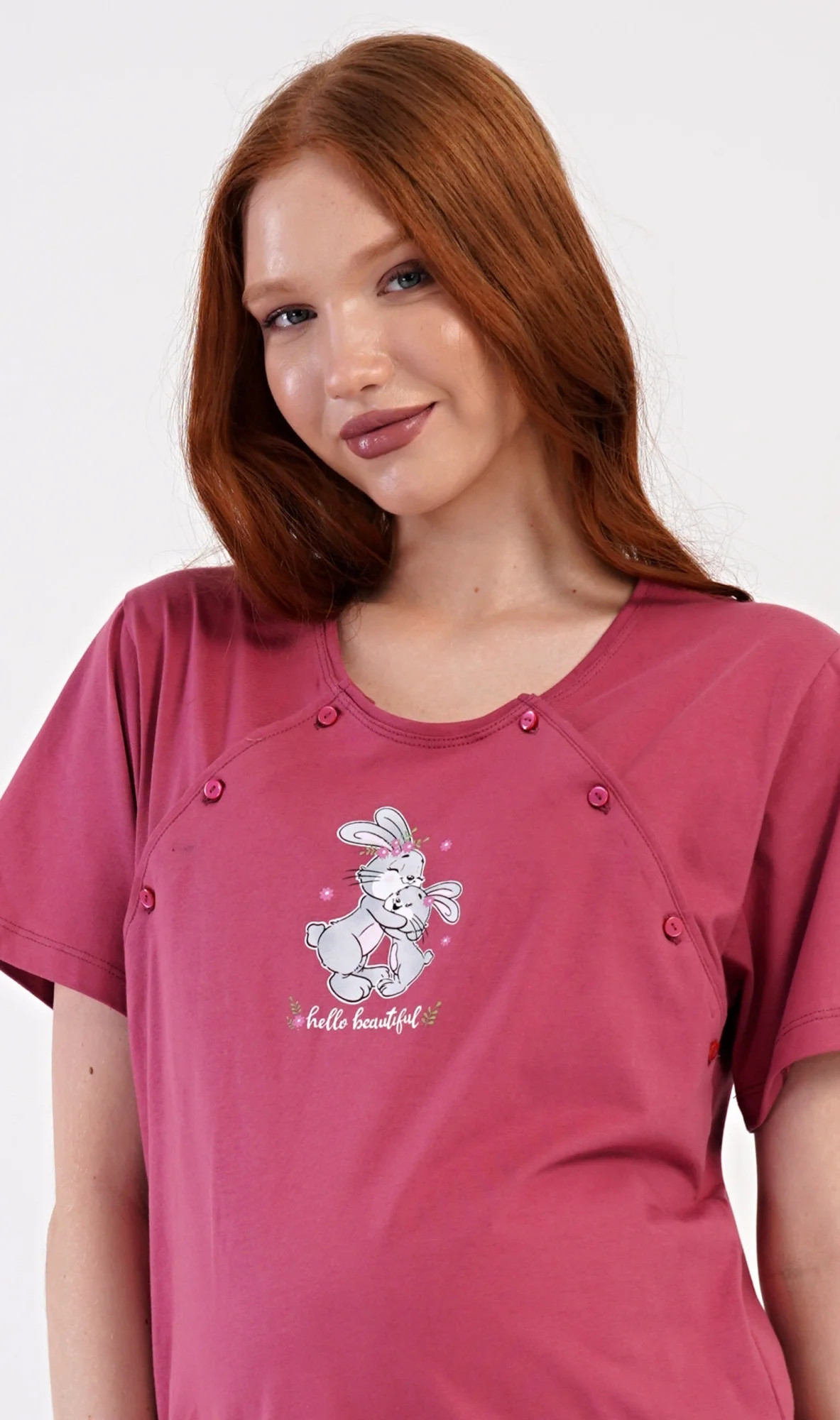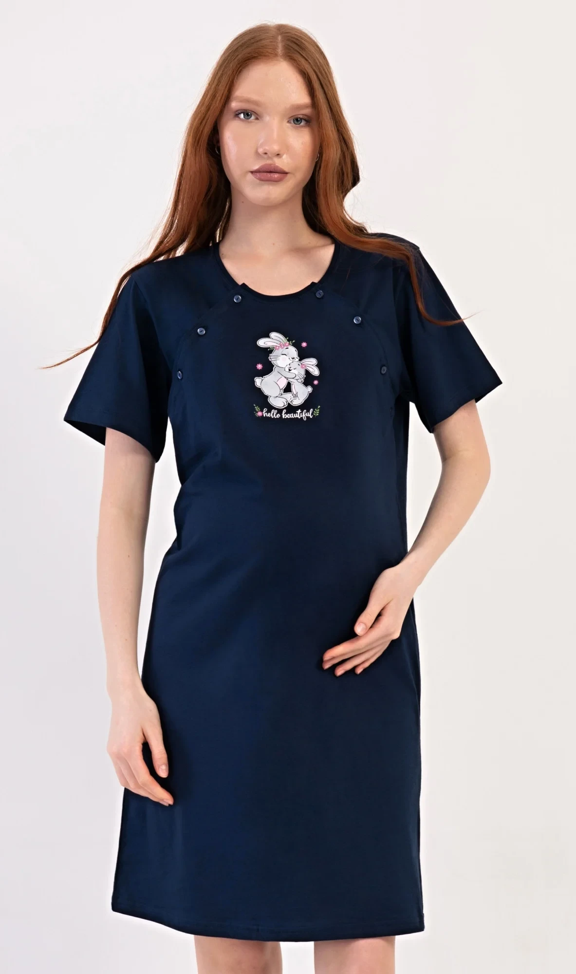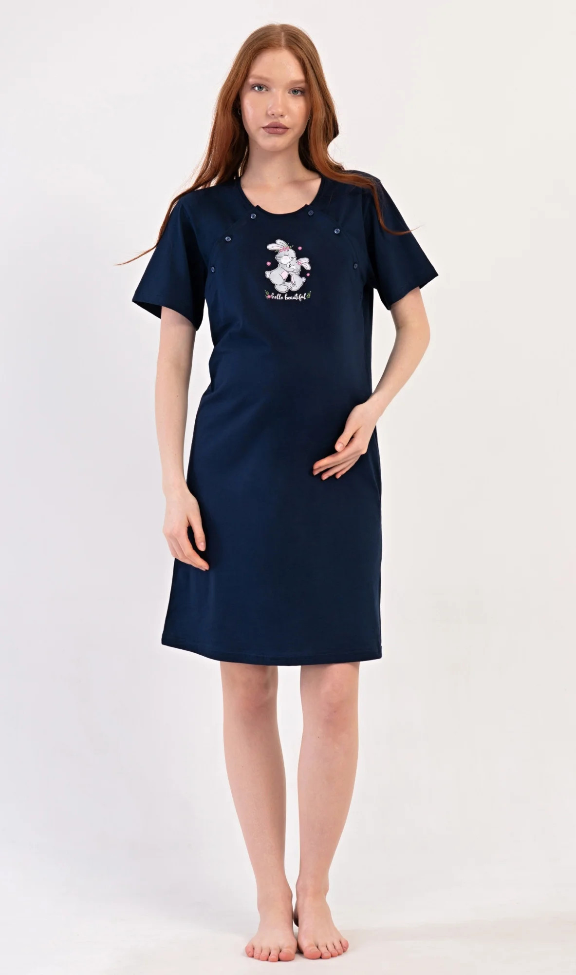 Dámská bavlněná mateřská noční košile Zajíčci. Noční košile je svým střihem určená na dobu těhotenství, do porodnice i ke kojení. Ke kojení slouží průstřihy po stranách košile, které jsou uzavíratelné na knoflíky. Přední díl košile zdobí obrázek veselých zajíčků. Použitý materiál s podílem bavlny 100% je příjemný a poddajný na dotek.