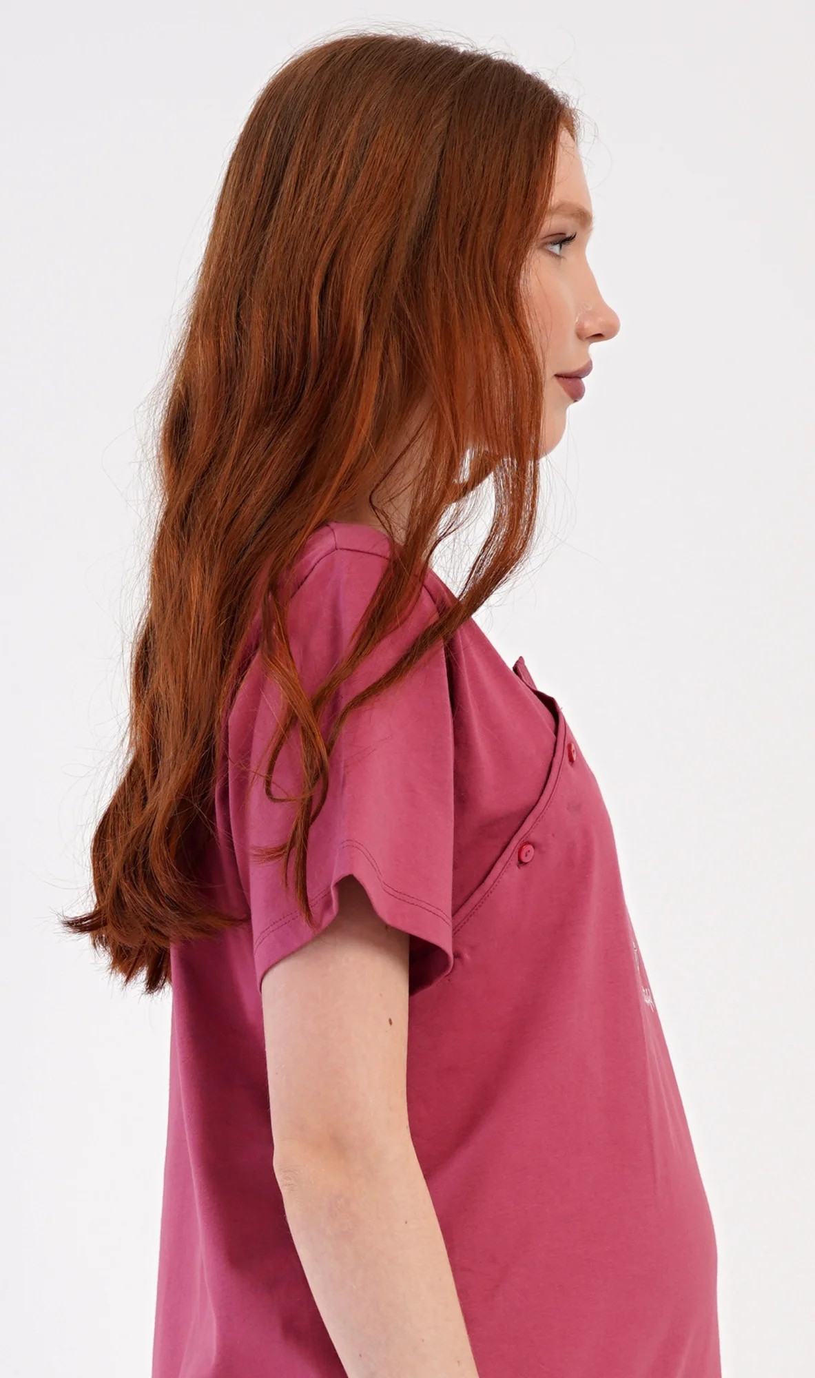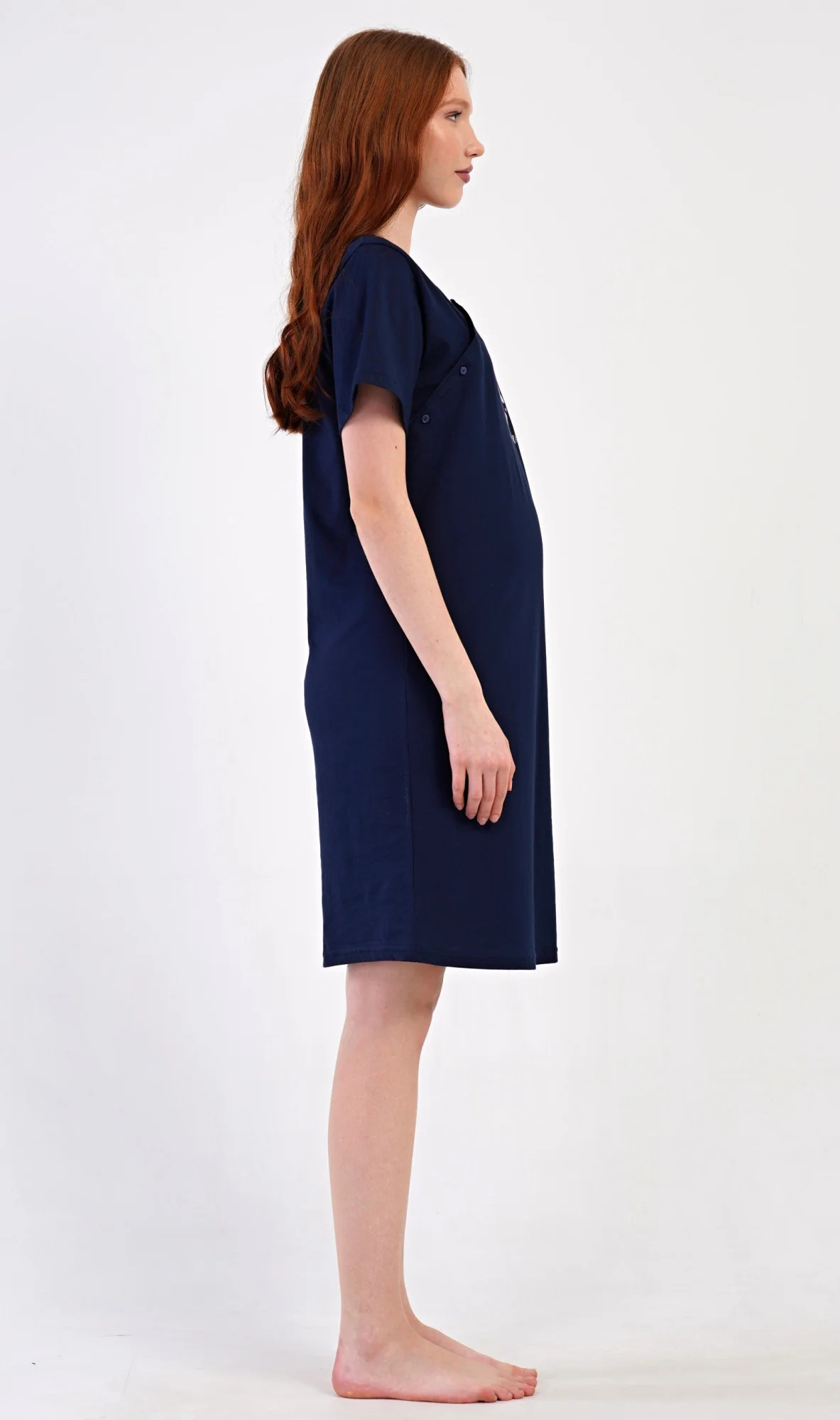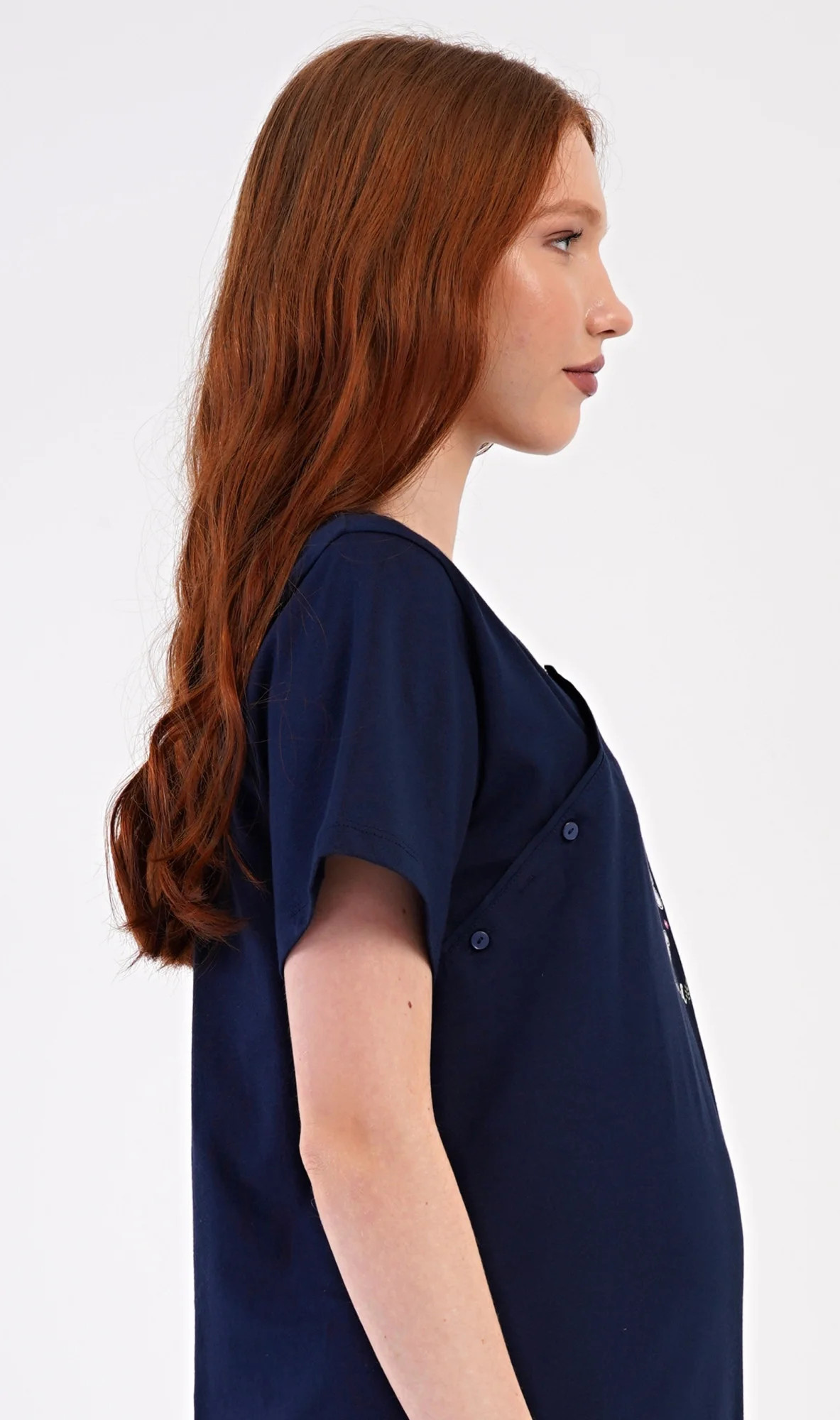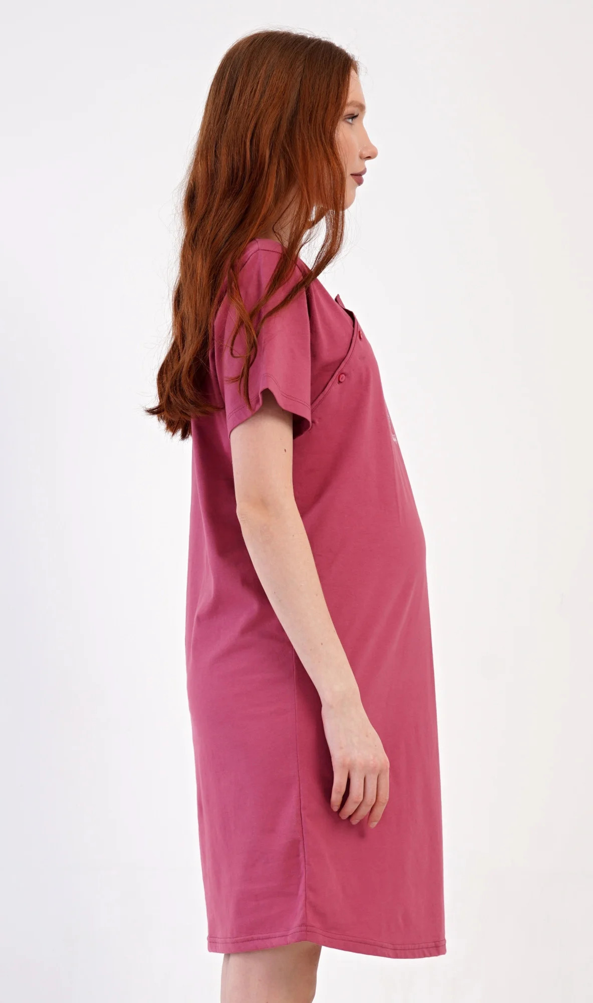 Dámská bavlněná mateřská noční košile Zajíčci. Noční košile je svým střihem určená na dobu těhotenství, do porodnice i ke kojení. Ke kojení slouží průstřihy po stranách košile, které jsou uzavíratelné na knoflíky. Přední díl košile zdobí obrázek veselých zajíčků. Použitý materiál s podílem bavlny 100% je příjemný a poddajný na dotek.