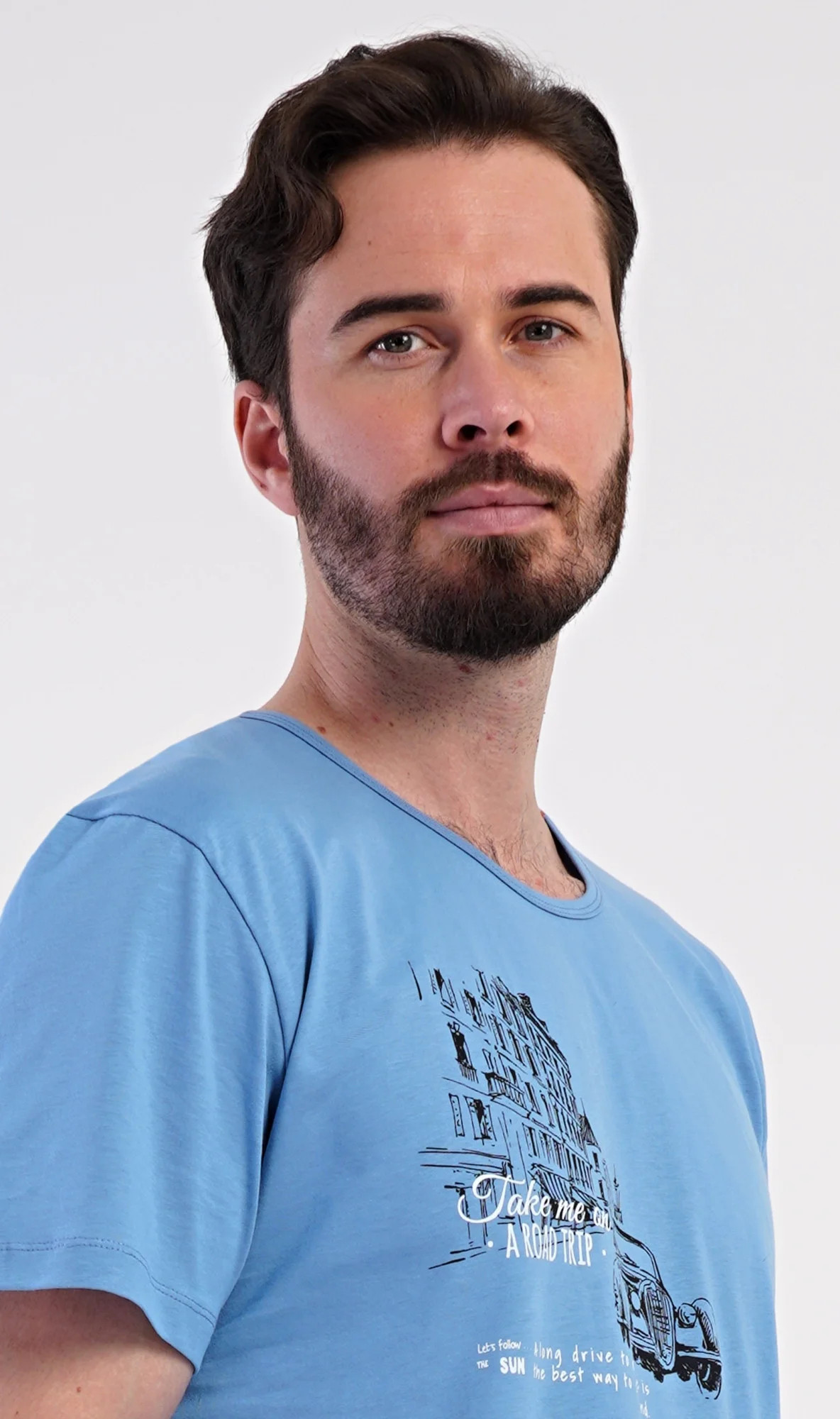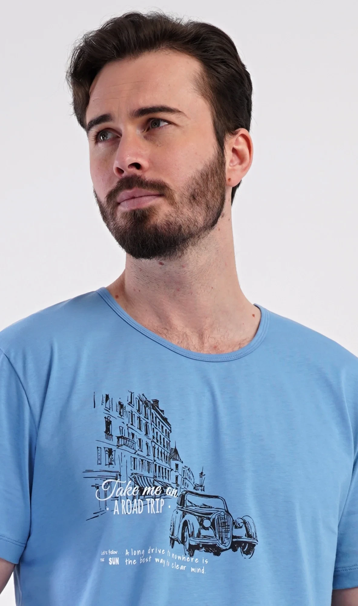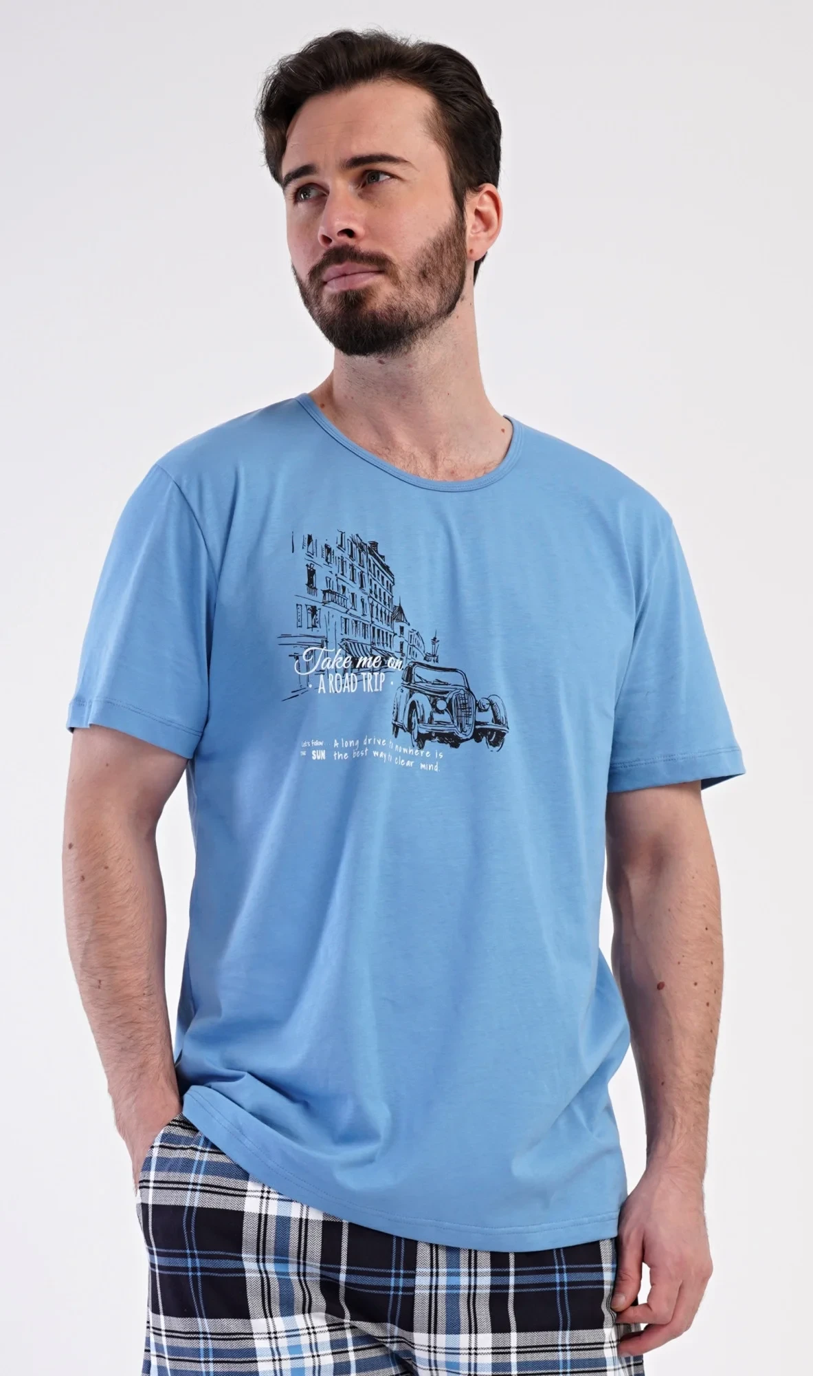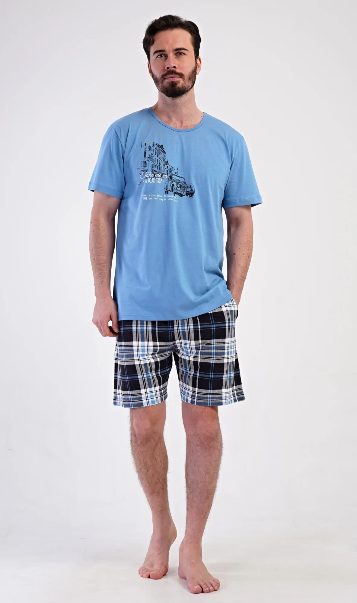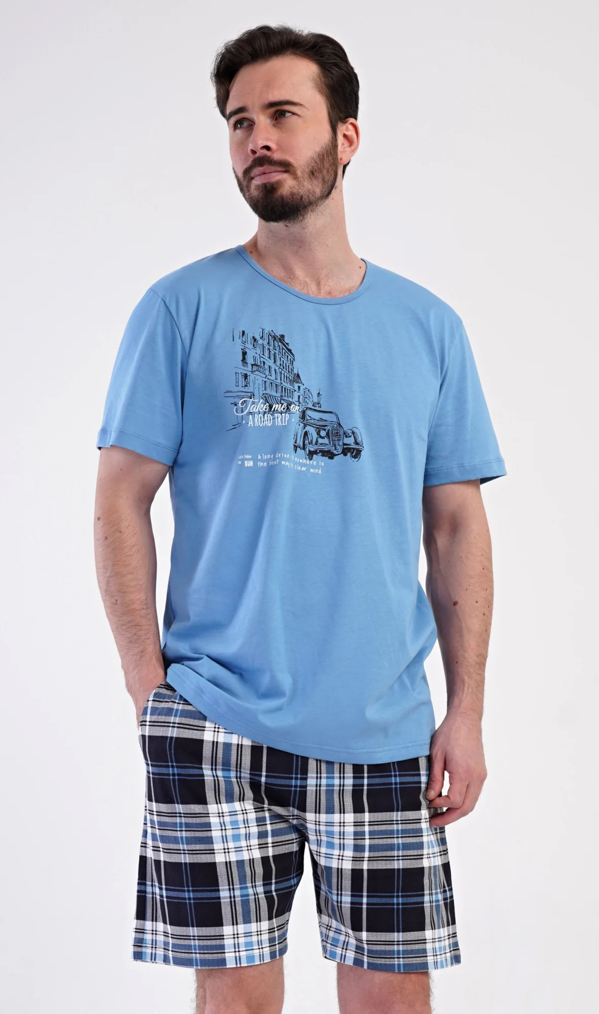 Pánské bavlněné šortkové pyžamo Felix. Pánské pyžamo se skládá z trička s krátkým rukávem a krátkých šortkových kalhot. Tričko s kulatým výstřihem zdobí na hrudi obrázek historického auta. Tričko doplňují kárované šortky, které mají v pase gumu, šňůrku na stažení a praktické kapsy. Použitý materiál s obsahem bavlny 100% je příjemný a poddajný na dotek.