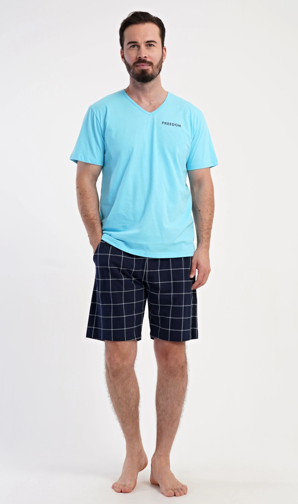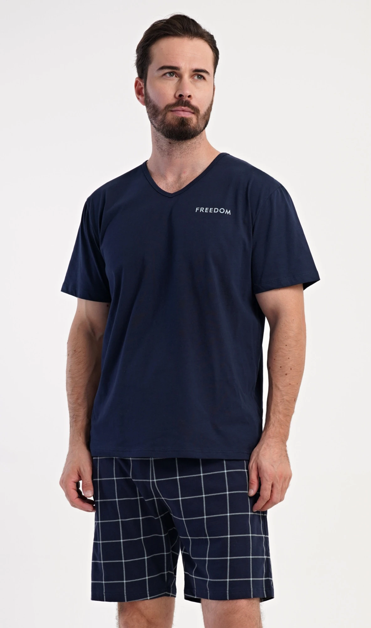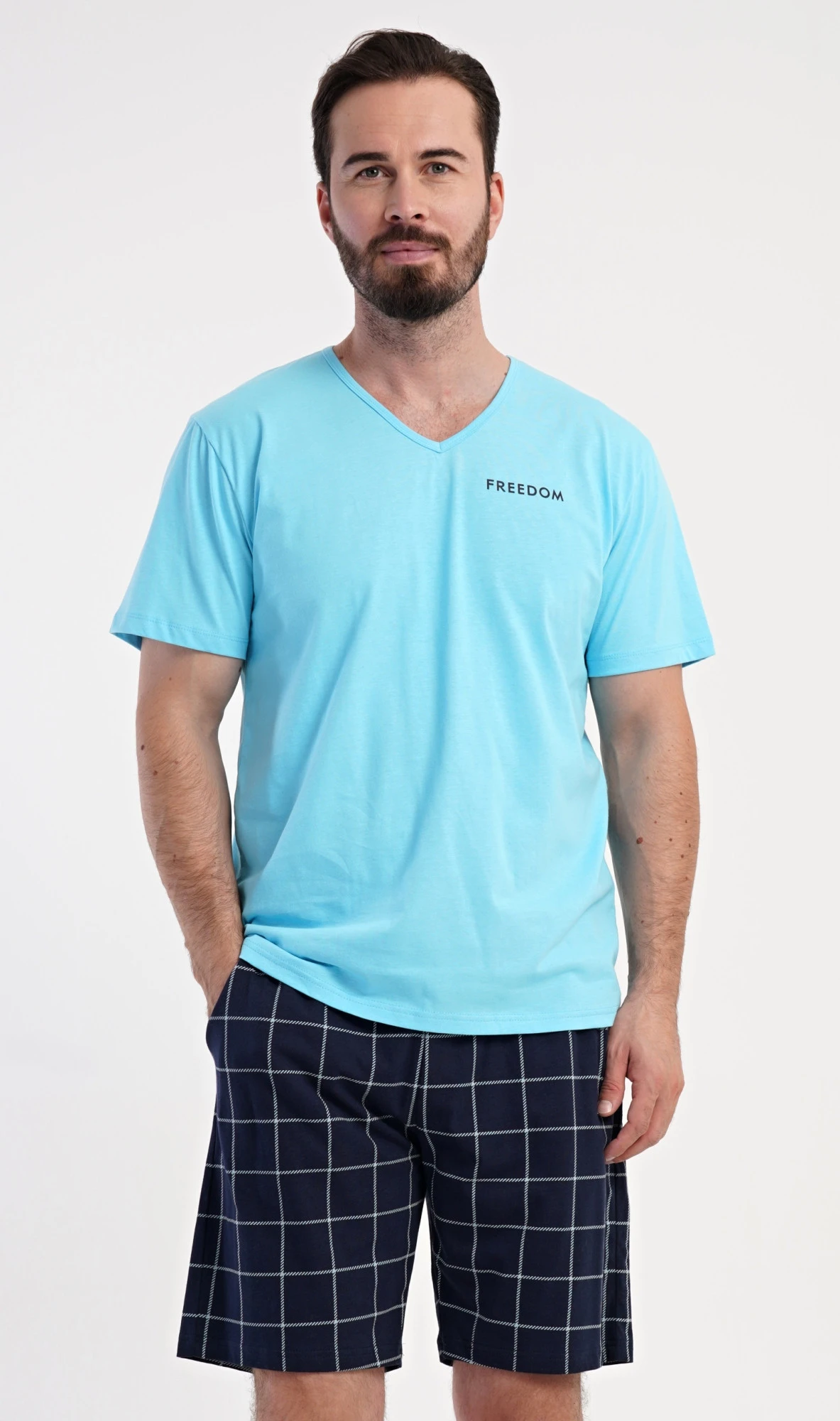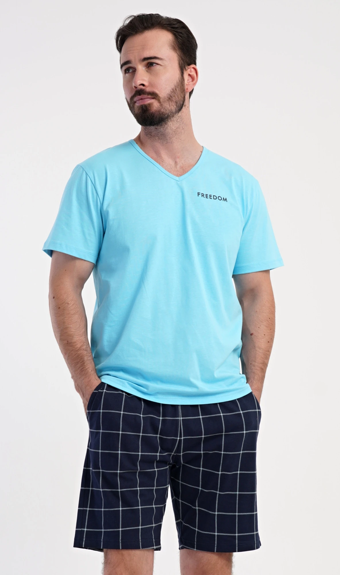 Pánské bavlněné šortkové pyžamo Freedom. Pánské pyžamo se skládá z trička s krátkým rukávem a krátkých šortkových kalhot. Tričko s kulatým výstřihem zdobí na hrudi drobný nápis FREEDOM. Tričko doplňují kárované šortky, které mají v pase gumu, šňůrku na stažení a praktické kapsy. Použitý materiál s obsahem bavlny 100% je příjemný a poddajný na dotek.