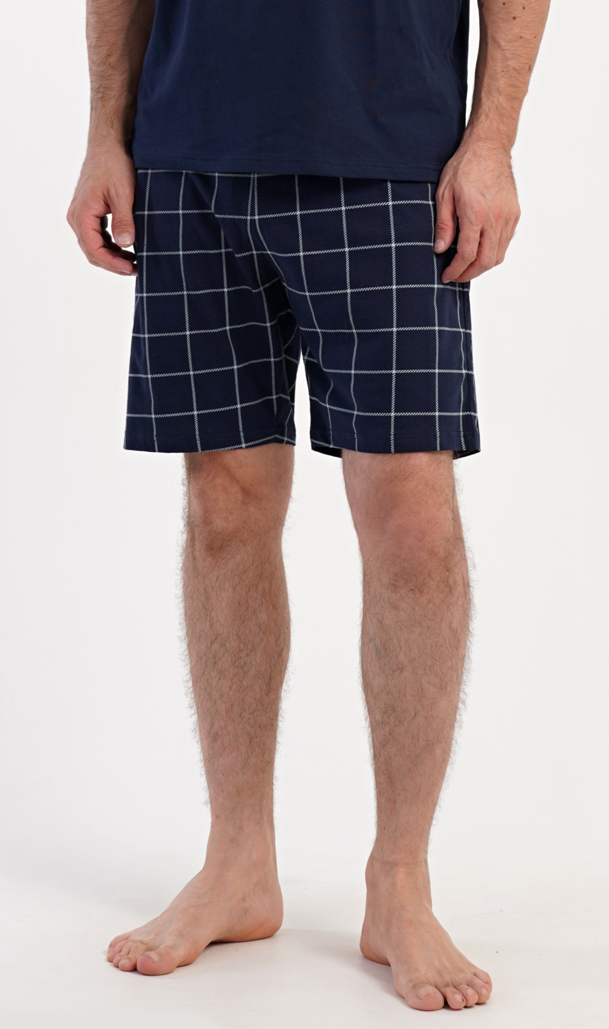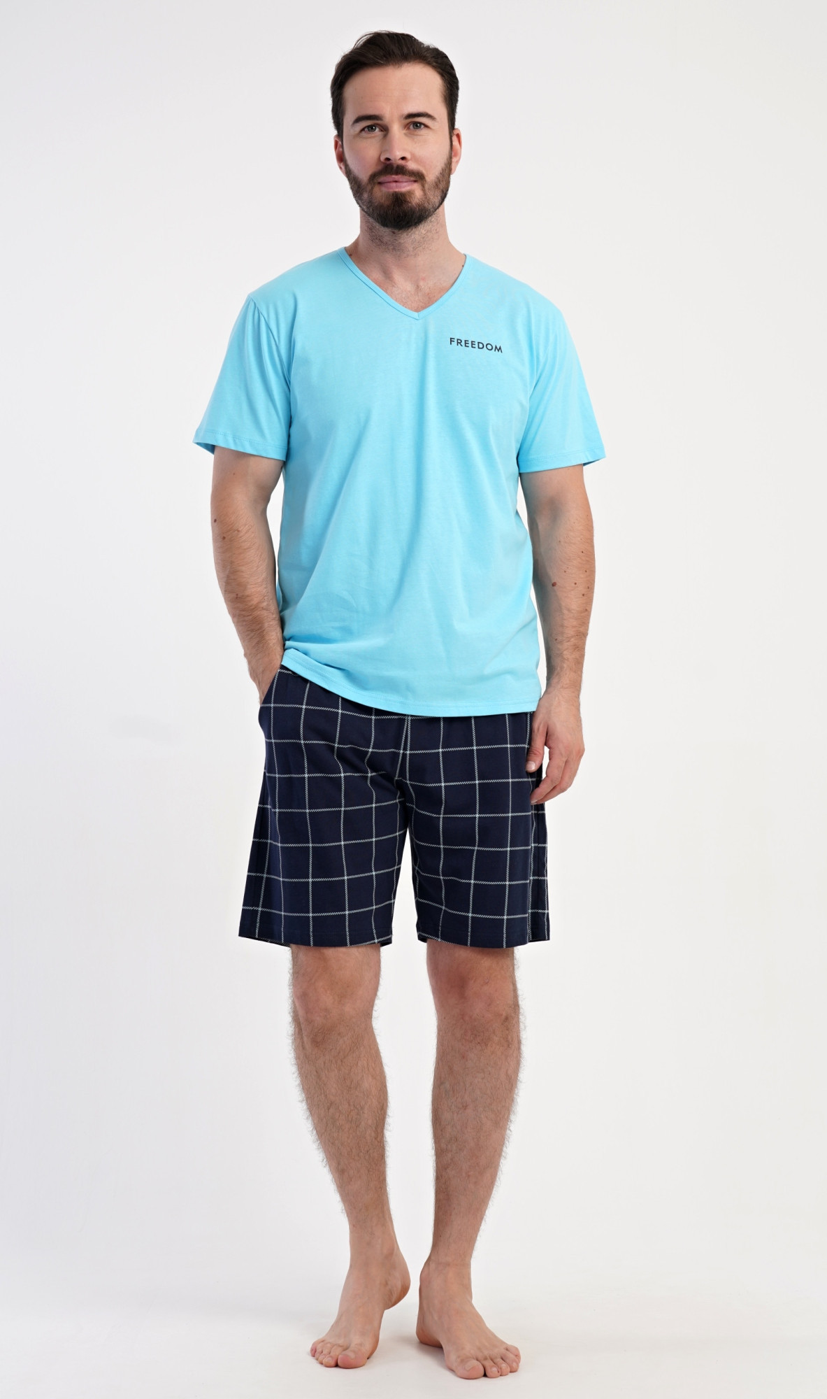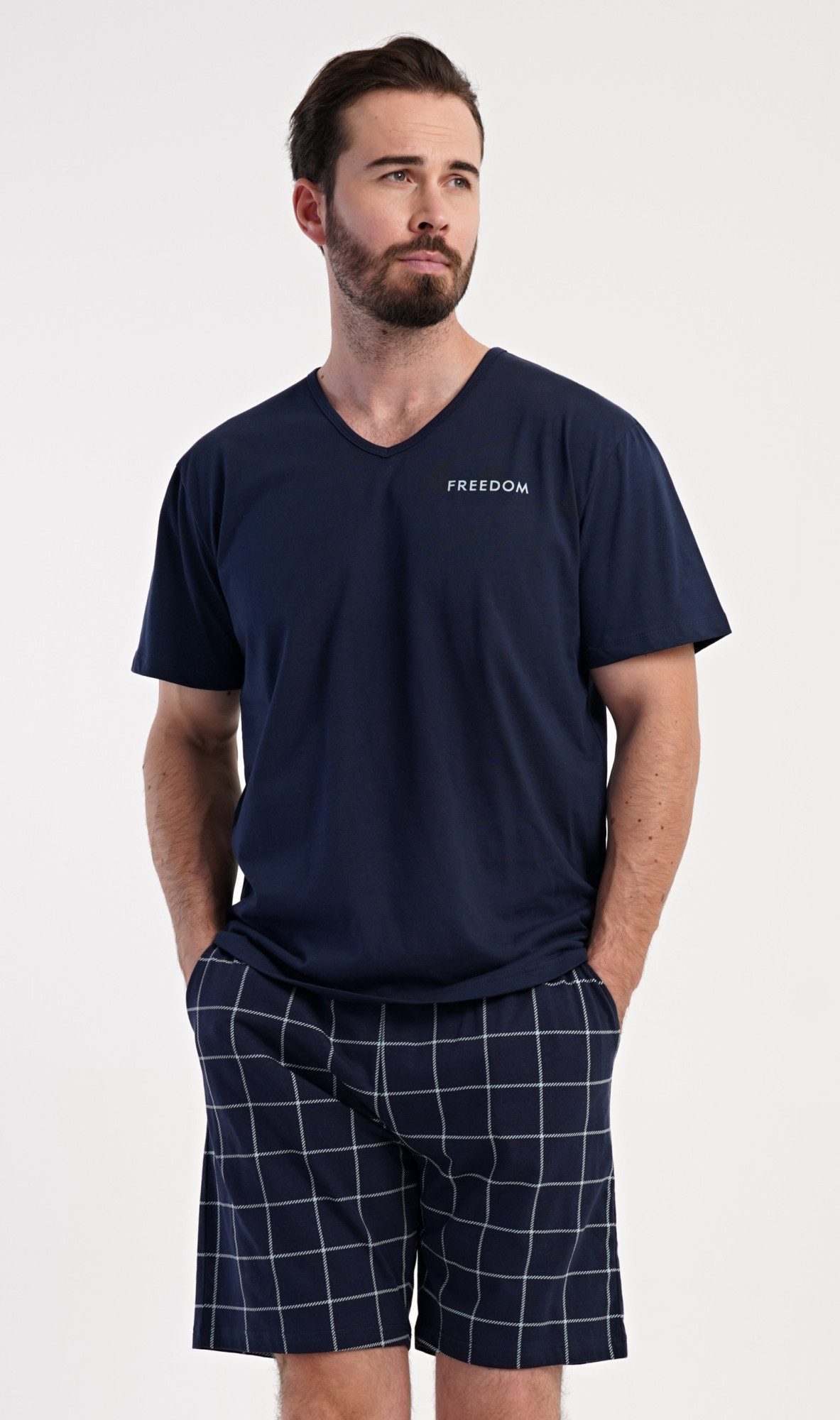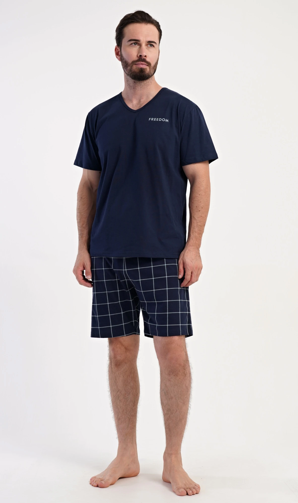 Pánské bavlněné šortkové pyžamo Freedom. Pánské pyžamo se skládá z trička s krátkým rukávem a krátkých šortkových kalhot. Tričko s kulatým výstřihem zdobí na hrudi drobný nápis FREEDOM. Tričko doplňují kárované šortky, které mají v pase gumu, šňůrku na stažení a praktické kapsy. Použitý materiál s obsahem bavlny 100% je příjemný a poddajný na dotek.