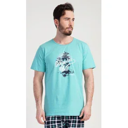 Pánské bavlněné pyžamo šortky Honolua bay. Pánské pyžamo se skládá z trička s krátkým rukávem a krátkých šortkových kalhot. Na tričku je obrázek malého ostrova a nápis 'Honolua bay'. Tričko doplňují kárované šortky, které mají v pase gumu a šňůrku na stažení, nemají kapsy. Použitý materiál s obsahem bavlny 100% je příjemný a poddajný na dotek.