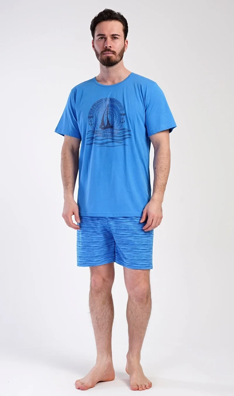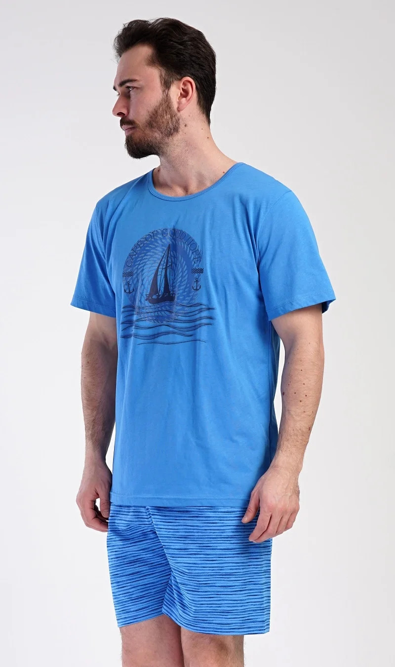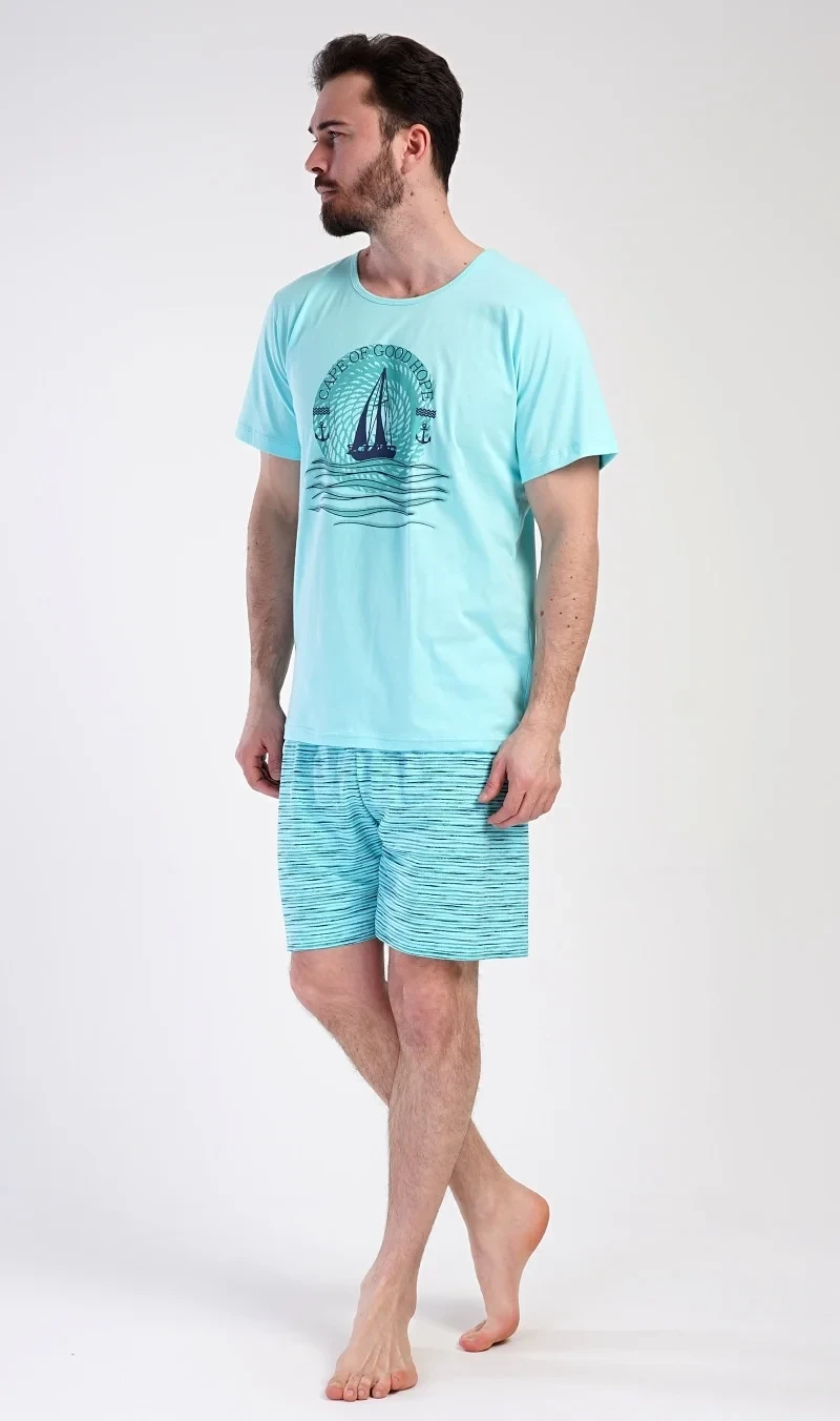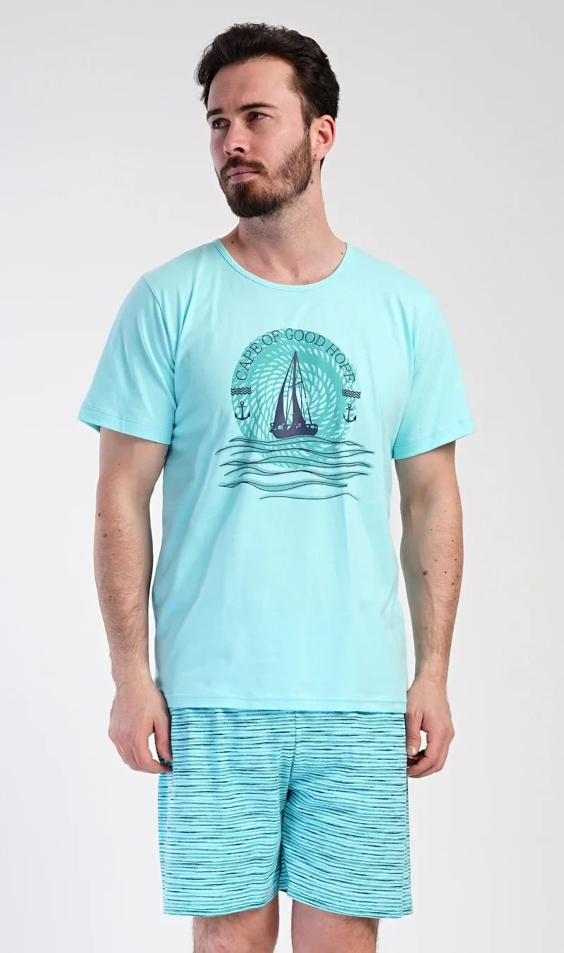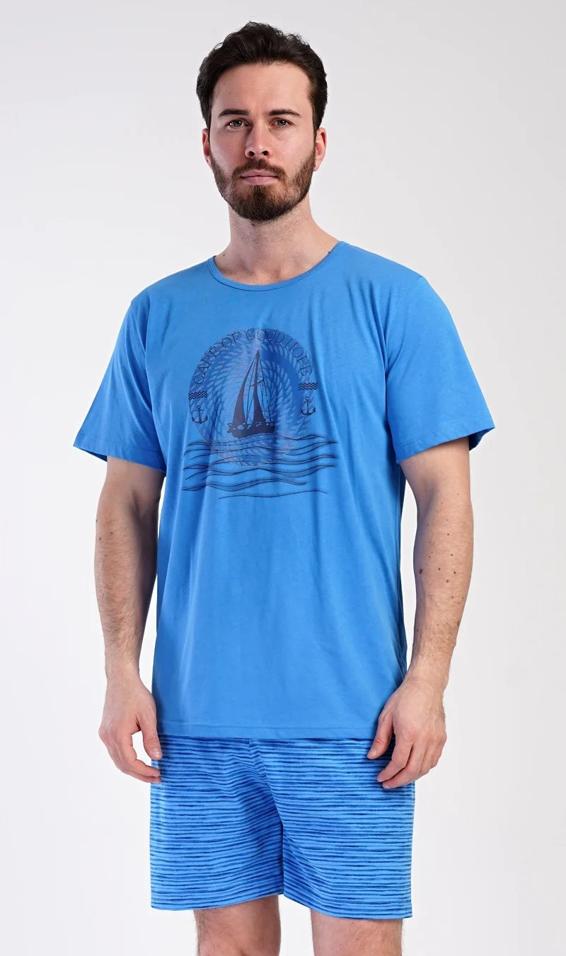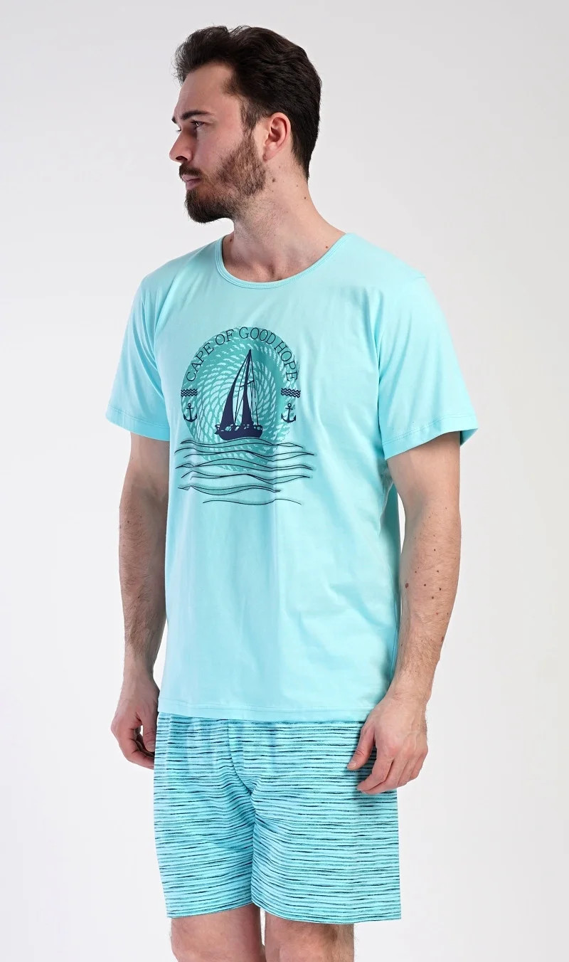 Pánské bavlněné šortkové pyžamo Jachting. Pánské pyžamo se skládá z trička s krátkým rukávem a krátkých šortkových kalhot. Jednobarevné tričko s kulatým výstřihem má na hrudi obrázek plachetnice a nápis 'Cape of good hope'. Tričko doplňují šortky s potiskem zvlněných proužků, které mají v pase gumu a šňůrku na stažení, nemají kapsy. Použitý materiál s obsahem bavlny 100% je příjemný a poddajný na dotek.