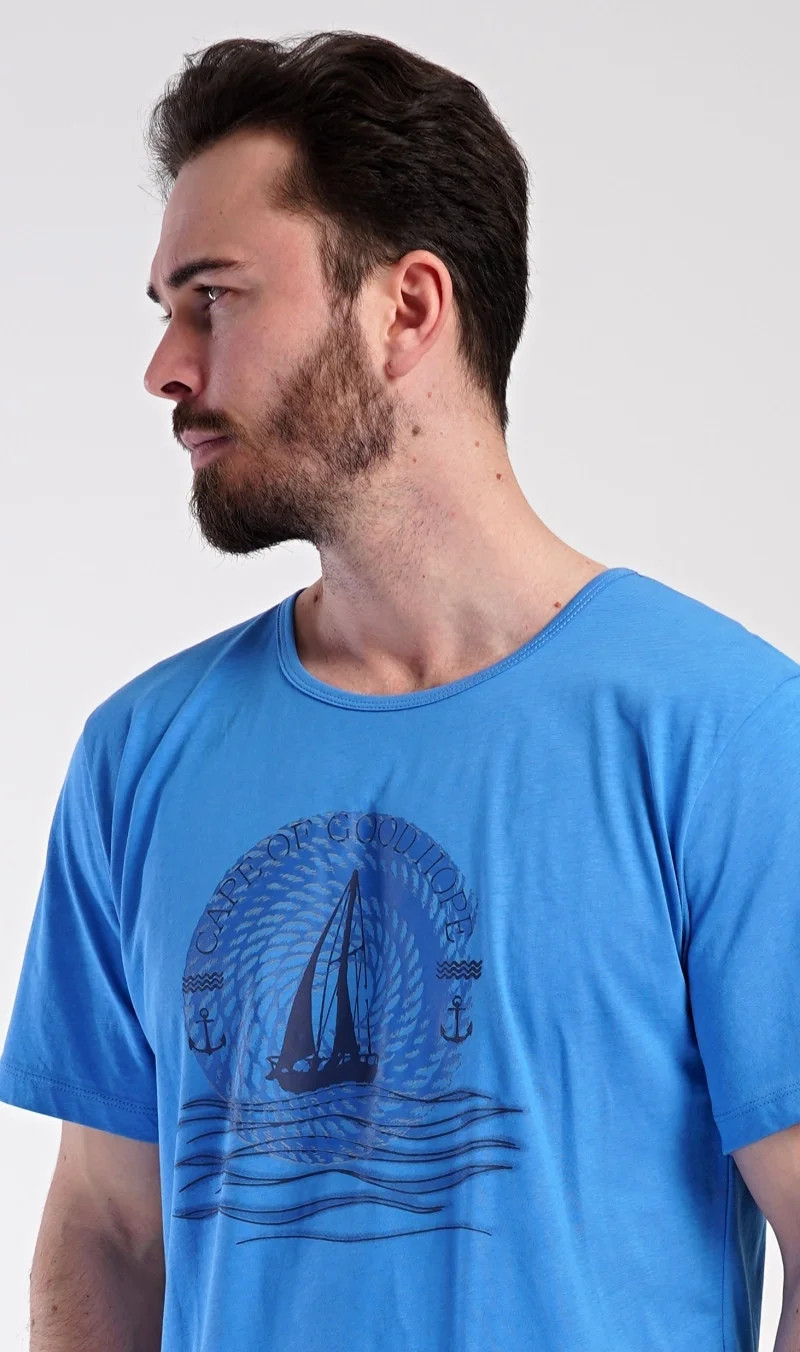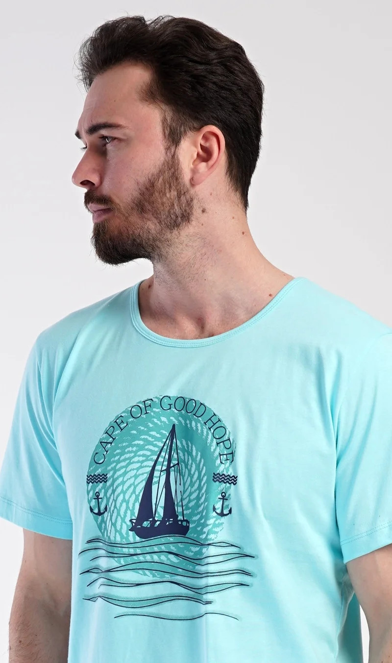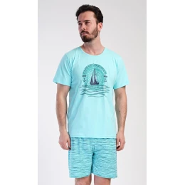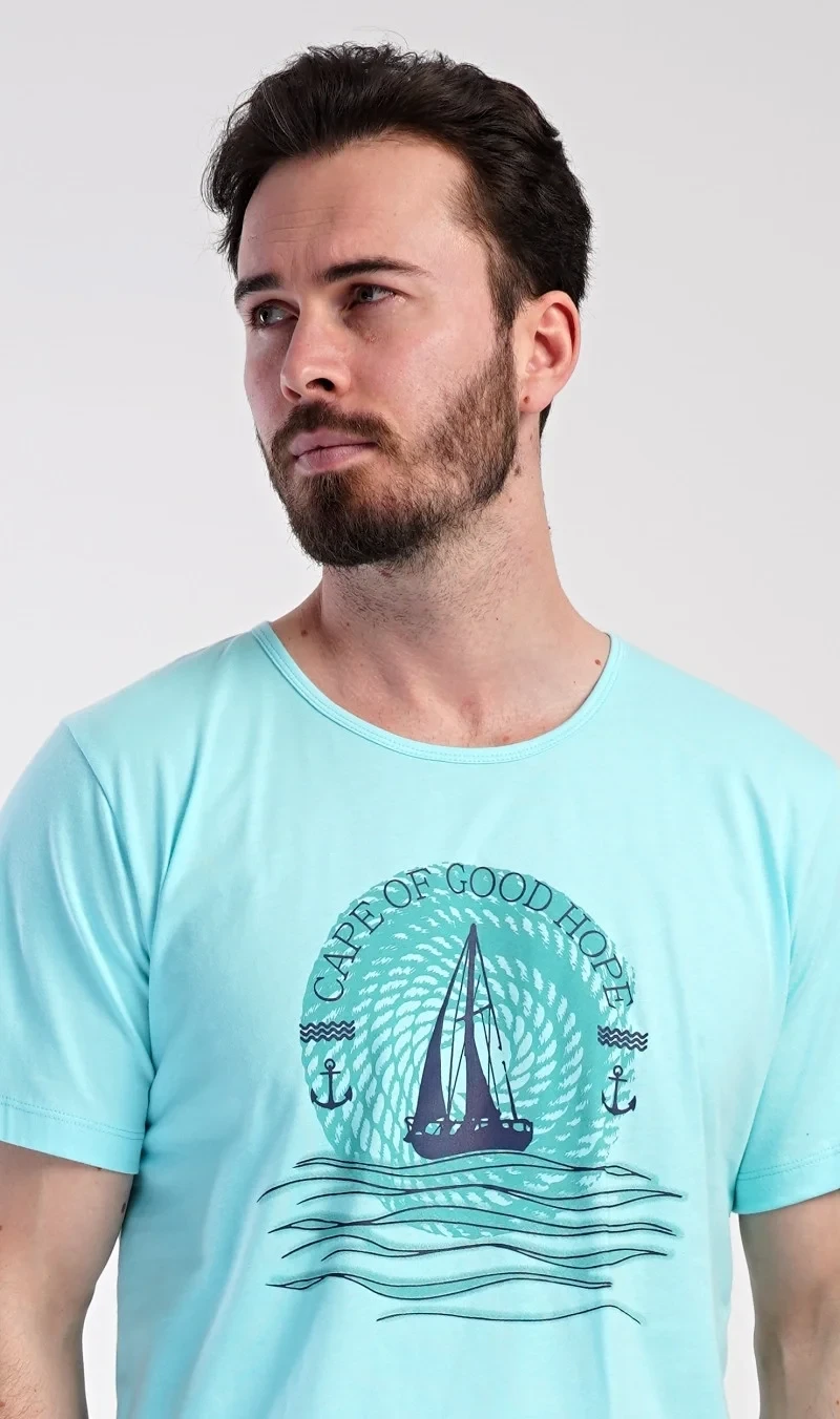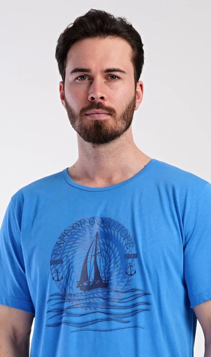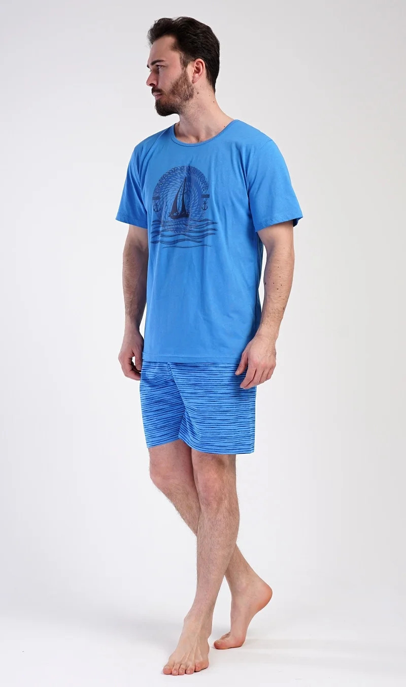 Pánské bavlněné šortkové pyžamo Jachting. Pánské pyžamo se skládá z trička s krátkým rukávem a krátkých šortkových kalhot. Jednobarevné tričko s kulatým výstřihem má na hrudi obrázek plachetnice a nápis 'Cape of good hope'. Tričko doplňují šortky s potiskem zvlněných proužků, které mají v pase gumu a šňůrku na stažení, nemají kapsy. Použitý materiál s obsahem bavlny 100% je příjemný a poddajný na dotek.