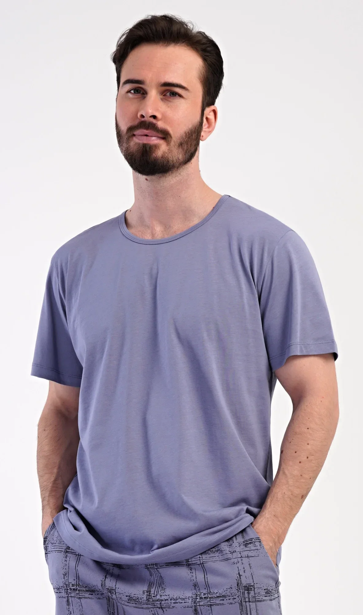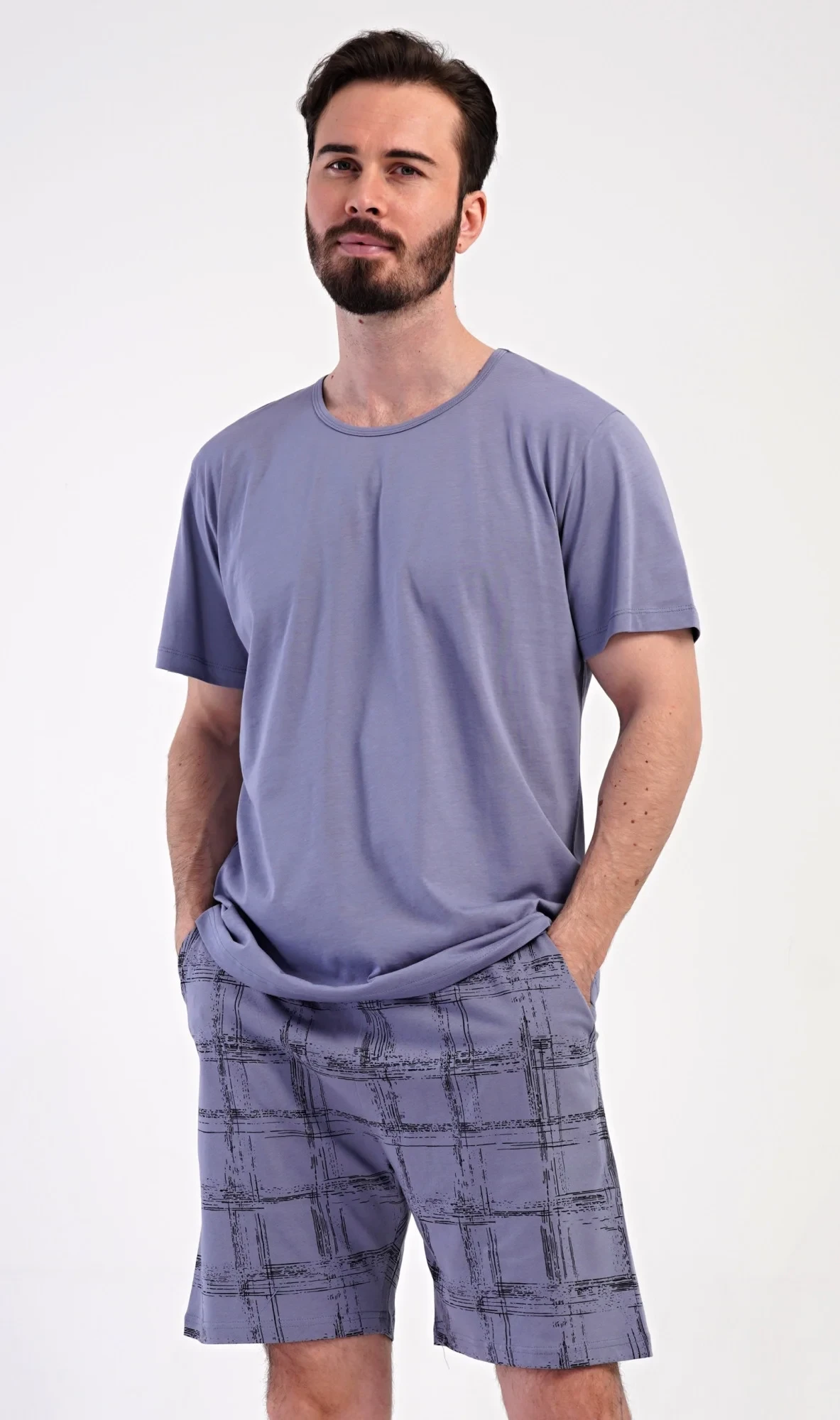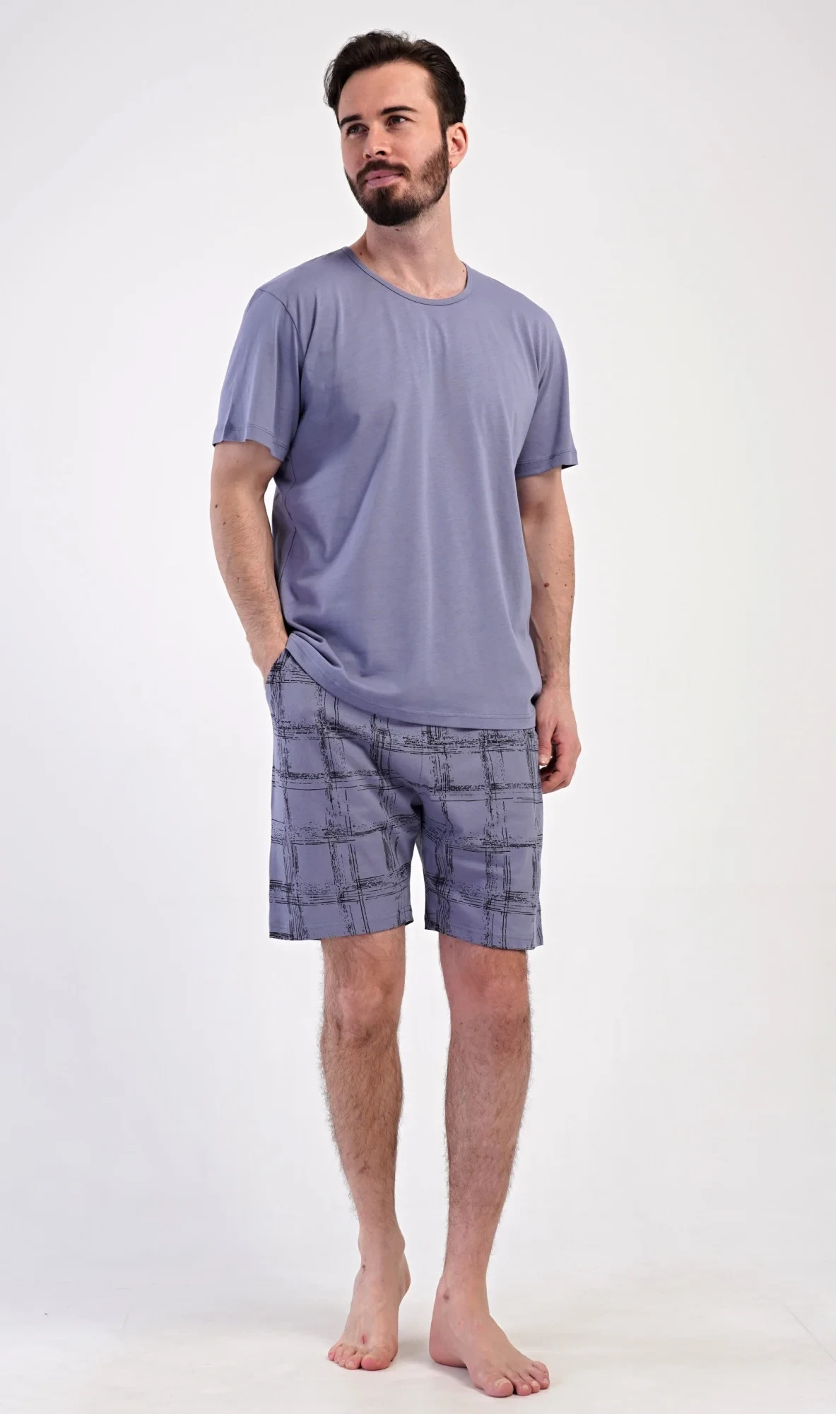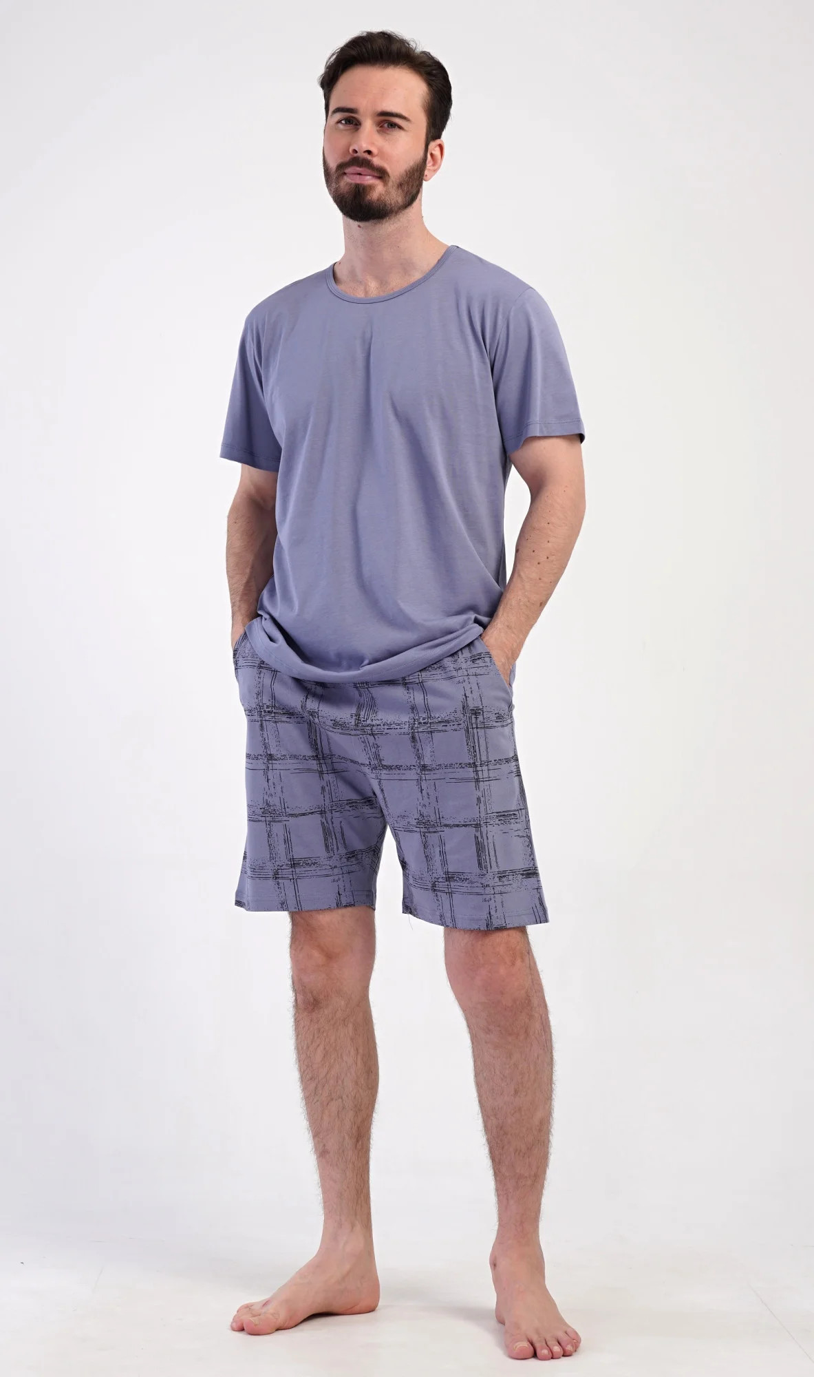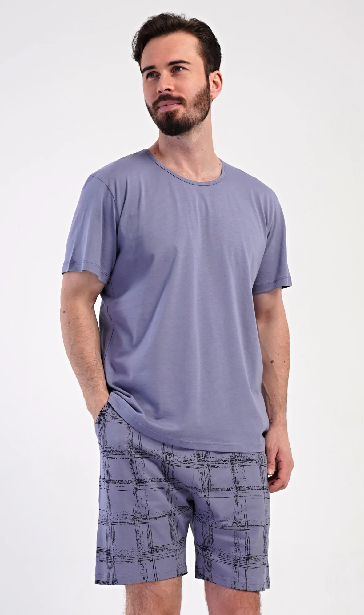 Pánské bavlněné šortkové pyžamo Jakub. Pánské pyžamo se skládá z trička s krátkým rukávem a krátkých šortkových kalhot. Jednobarevné tričko má kulatý výstřih a je vhodné pro všechny milovníky pohodlné módy bez potisku. Tričko doplňují kárované šortky, které mají v pase gumu, šňůrku na stažení a praktické kapsy. Použitý materiál s obsahem bavlny 100% je příjemný a poddajný na dotek.