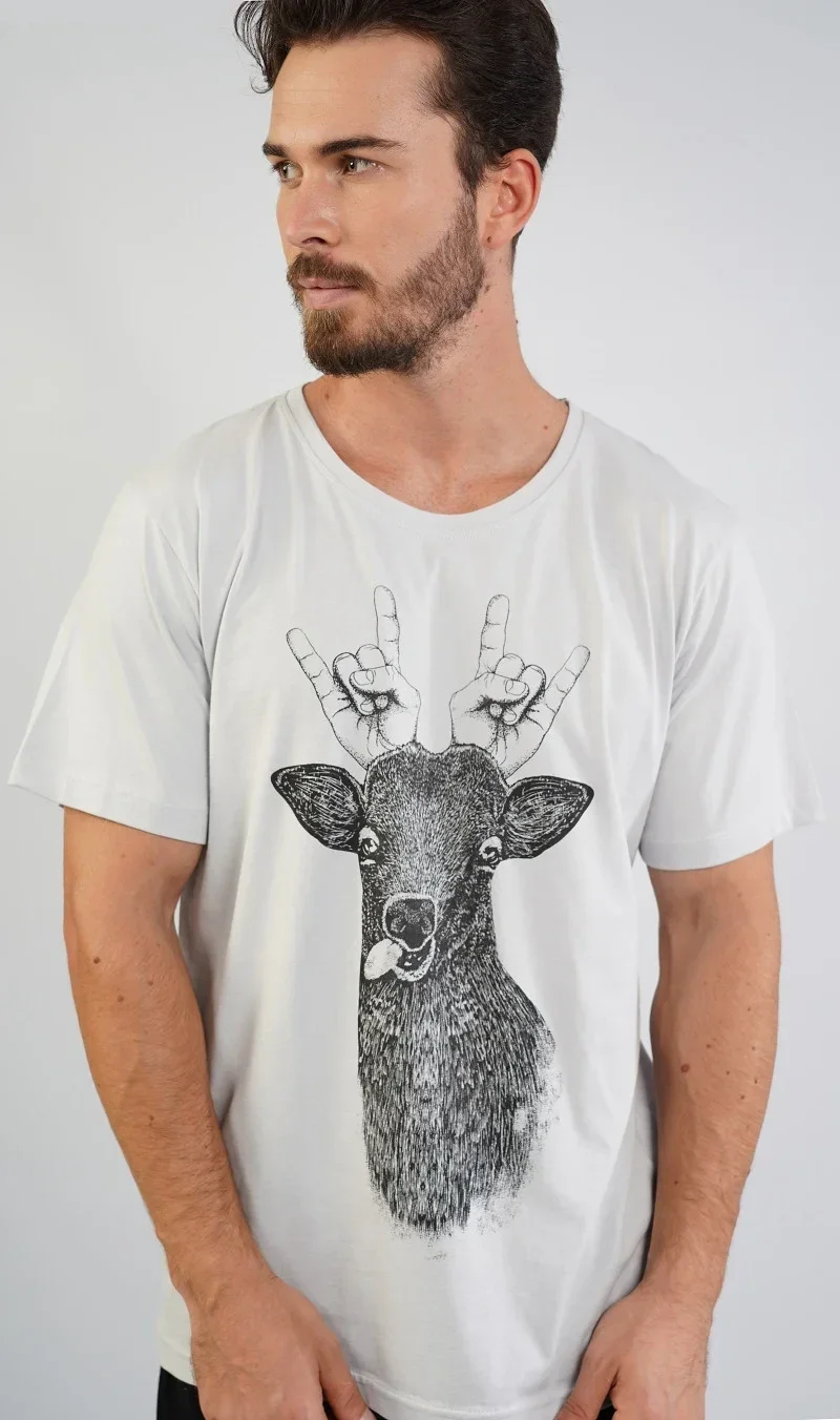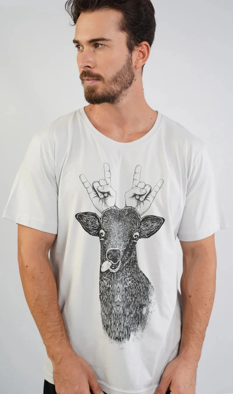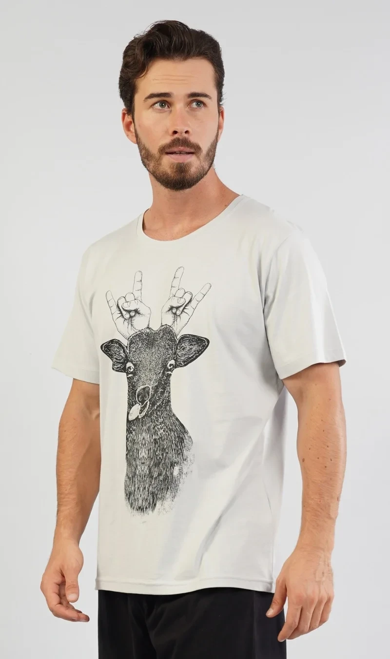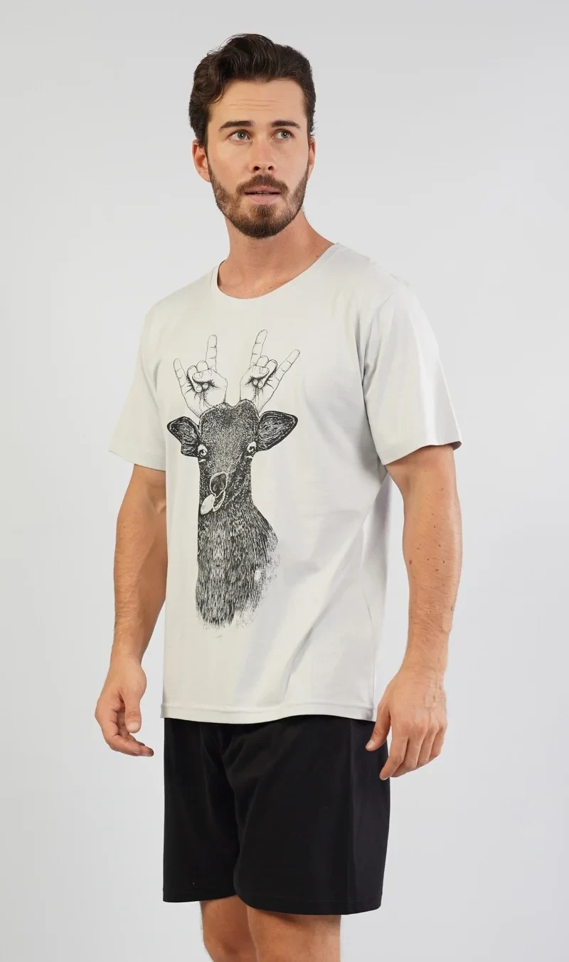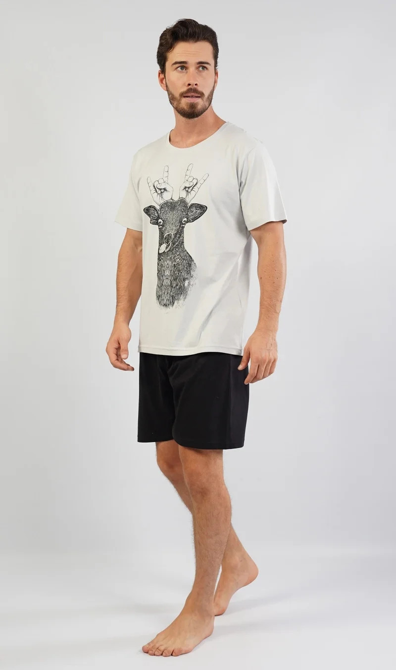 Pánské pyžamo šortky Jelen. Pánské pyžamo se skládá z trička s krátkým rukávem a krátkých šortkových kalhot. Na jednobarevném tričku je vtipný obrázek jelena s lidskýma rukama místo paroží. Výrazné tričko vhodně doplňují jednobarevné kraťasy. Použitý materiál je jemný a poddajný na dotek. Pyžamo je vhodná na denní nošení.