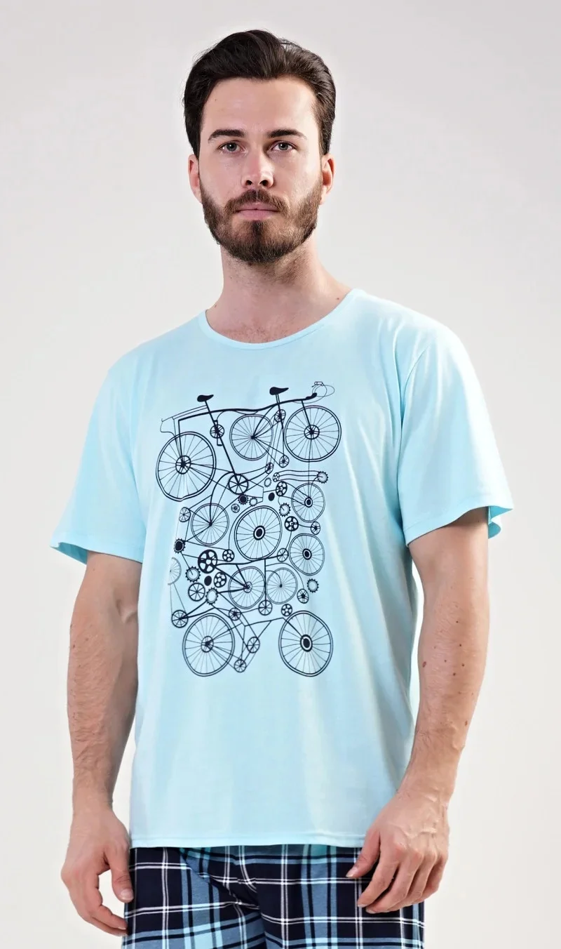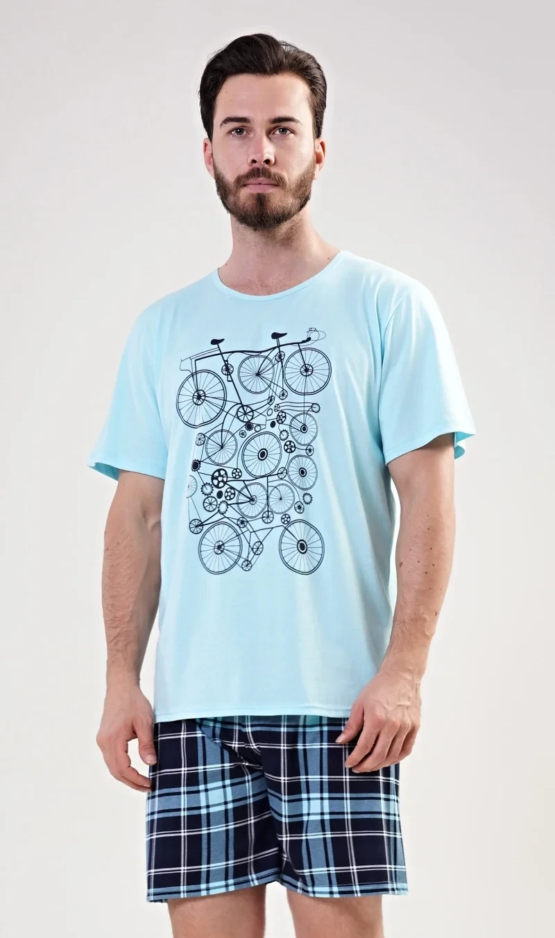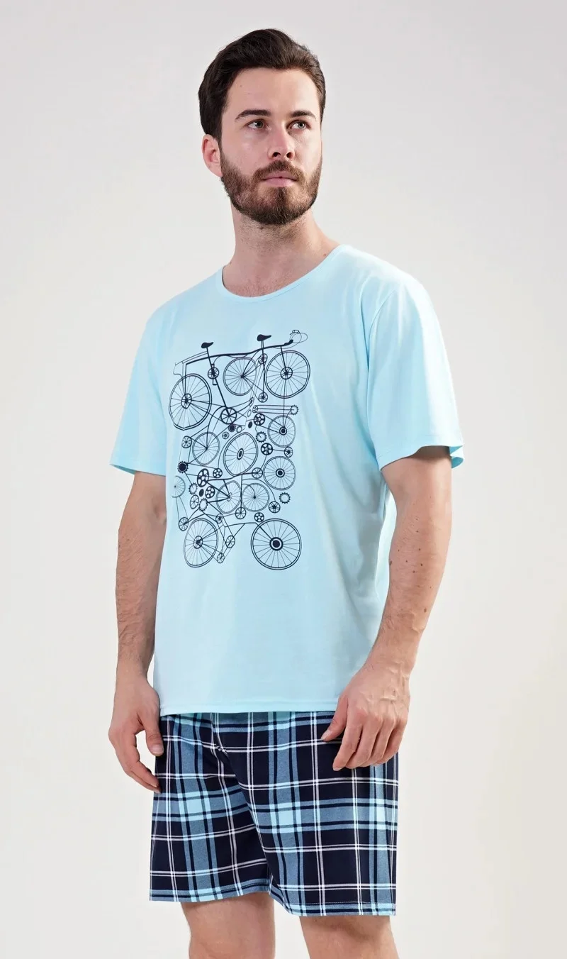 Pánské bavlněné pyžamo šortky Kolo. Pánské pyžamo se skládá z trička s krátkým rukávem a krátkých šortkových kalhot. Na tričku je obrázek kola v několika opakováních. Tričko doplňují kárované šortky, které mají v pase gumu a šňůrku na stažení. Nemají kapsy. Použitý materiál s obsahem bavlny 100% je příjemný a poddajný na dotek.