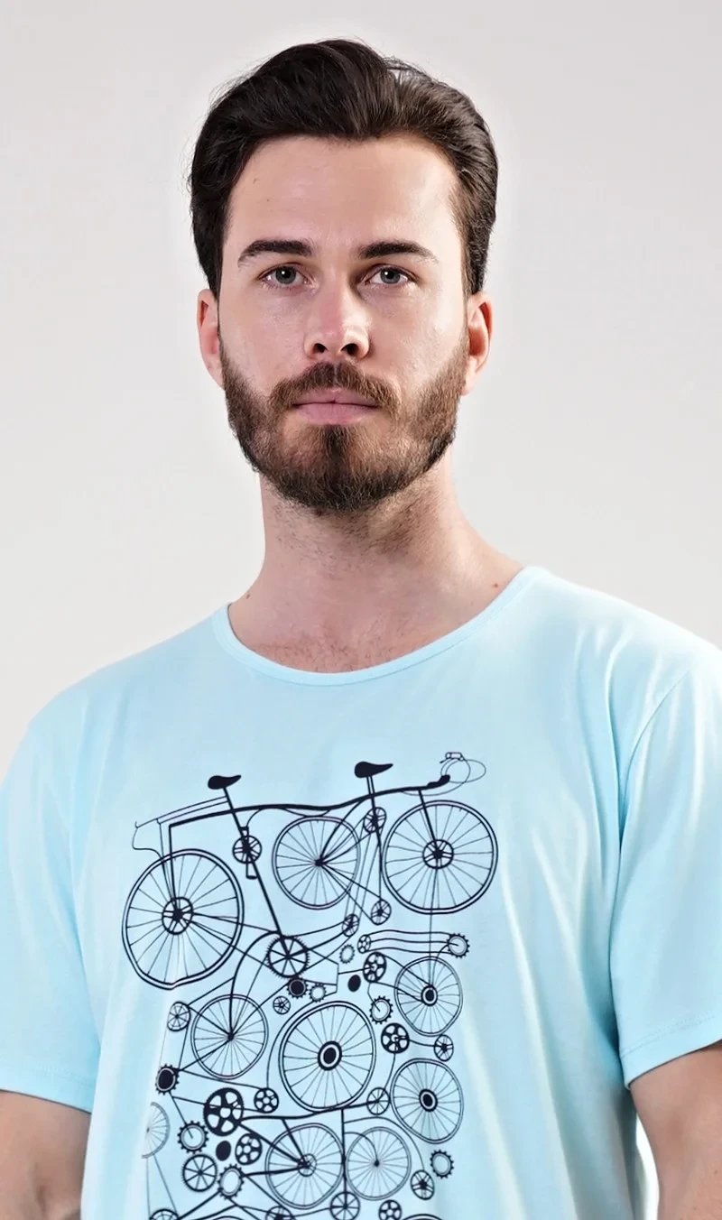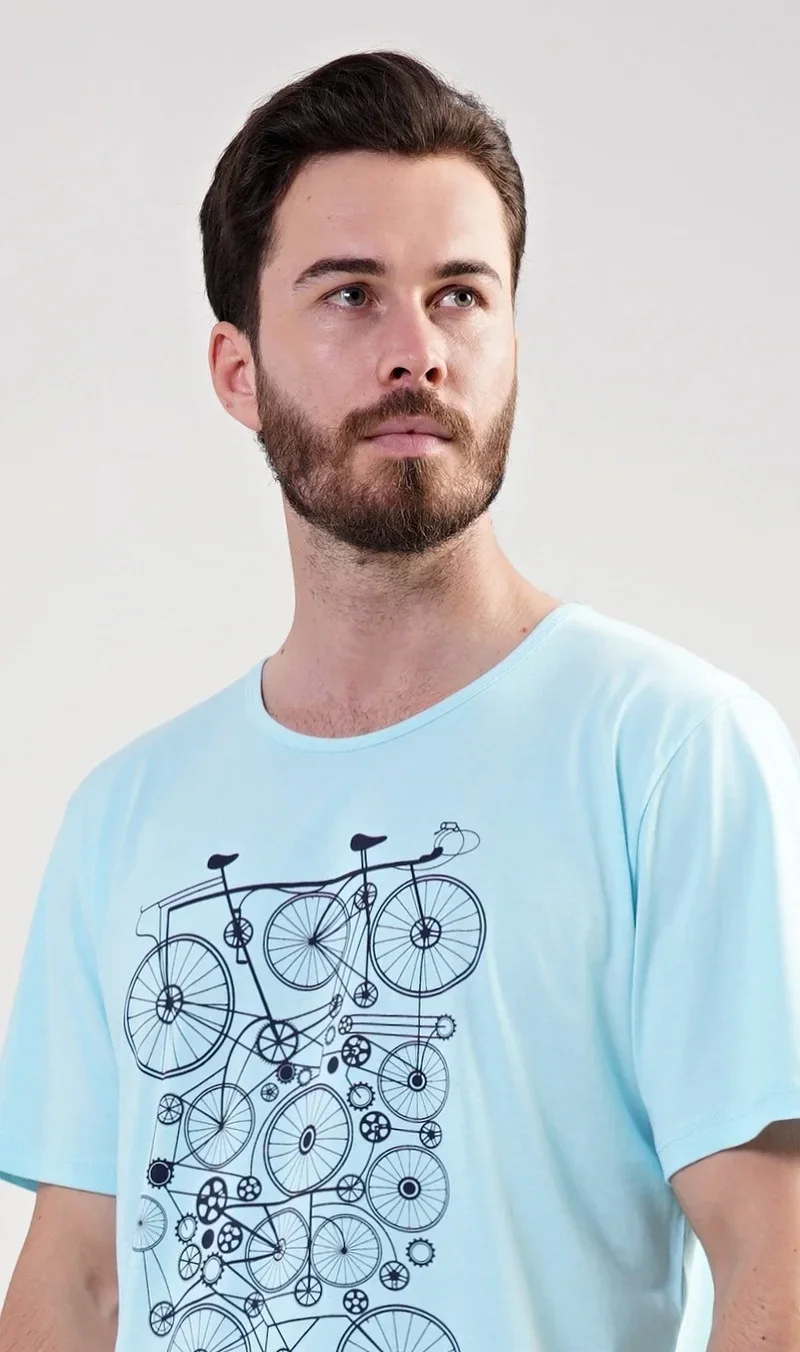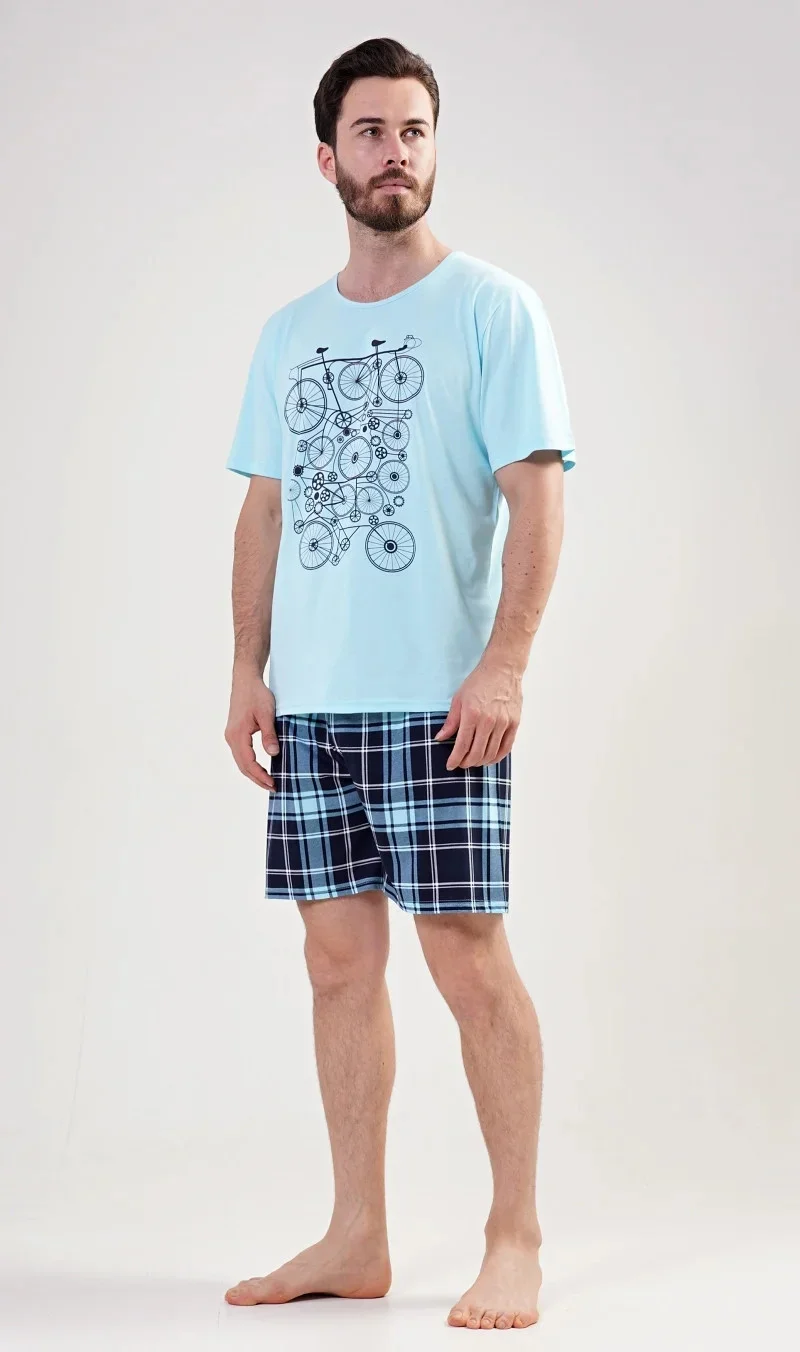 Pánské bavlněné pyžamo šortky Kolo. Pánské pyžamo se skládá z trička s krátkým rukávem a krátkých šortkových kalhot. Na tričku je obrázek kola v několika opakováních. Tričko doplňují kárované šortky, které mají v pase gumu a šňůrku na stažení. Nemají kapsy. Použitý materiál s obsahem bavlny 100% je příjemný a poddajný na dotek.