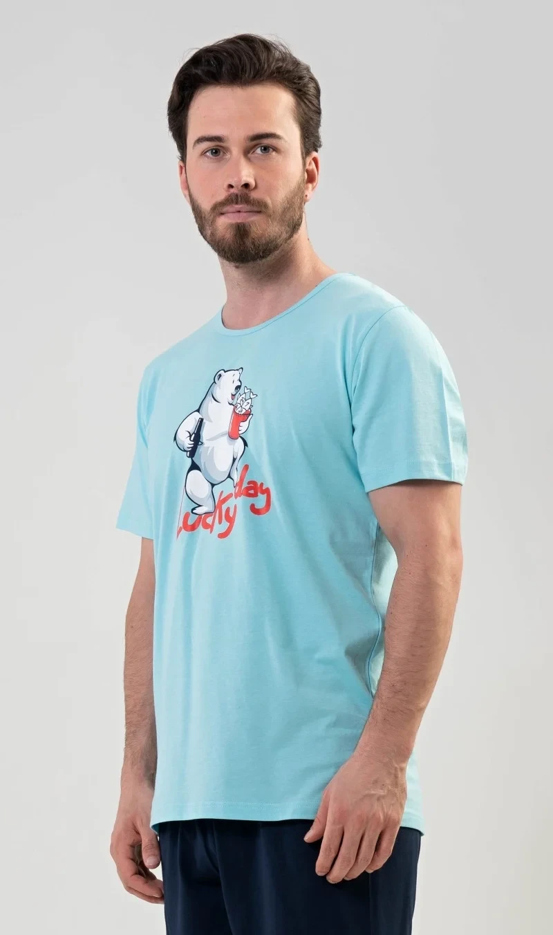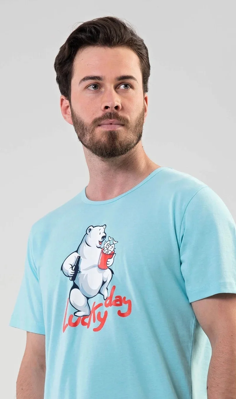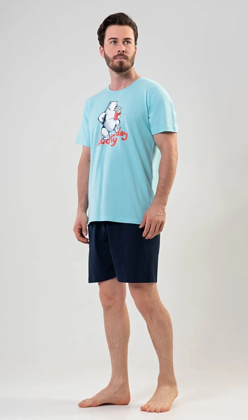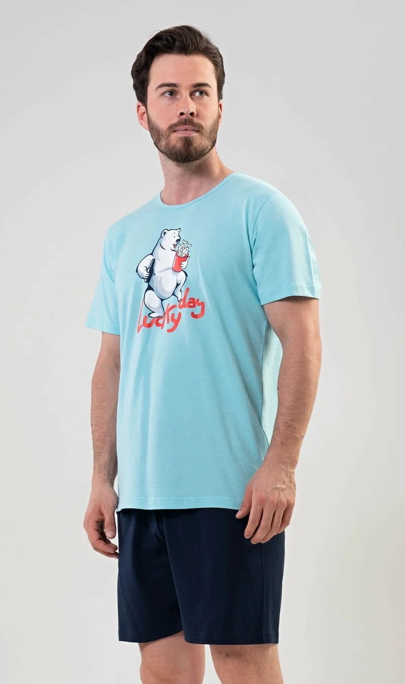 Pánské bavlněné pyžamo šortky Lucky day. Pánské pyžamo se skládá z trička s krátkým rukávem a krátkých šortkových kalhot. Na jednobarevném tričku s kulatým výstřihem je nápis LUCKY DAY a obrázek veselého ledního medvěda. Tričko doplňují jednobarevné šortky, které mají v pase gumu a šňůrku ke stažení. Nemají kapsy. Použitý materiál je příjemný a poddajný na dotek. Podíl bavlny u trička a šortek je 100%. Pyžamo je vhodné i na denní nošení.