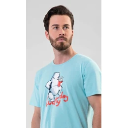 Pánské pyžamo šortky Lucky day. Pánské pyžamo šortky se skládá z trička s krátkým rukávem a krátkých šortkových kalhot. Na tričku je obázek roztomilého medvěda ss nápiem Lucky day. Výrazné tričko vhodně doplňují jednobarevné šortky. Použitý materiál je jejmný a poddajný na dotek. Pyžamo je vhodné na denní nošení.