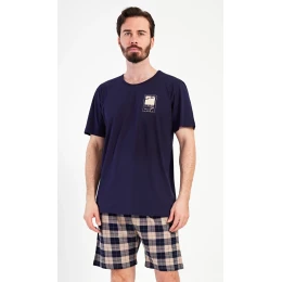 Pánské bavlněné šortkové pyžamo Marko. Pánské pyžamo se skládá z trička s krátkým rukávem a krátkých šortkových kalhot. Tričko s kulatým výstřihem zdobí menší obrázek a nápis 'Pantone'. Tričko doplňují kárované šortky, které mají v pase gumu, šňůrku na stažení a praktické kapsy. Použitý materiál s obsahem bavlny 100% je příjemný a poddajný na dotek.