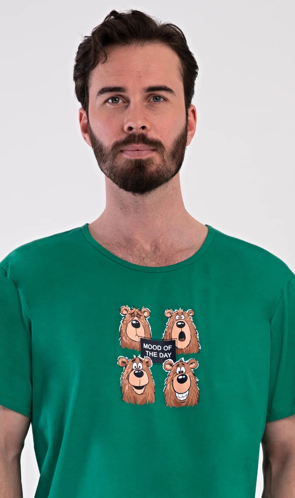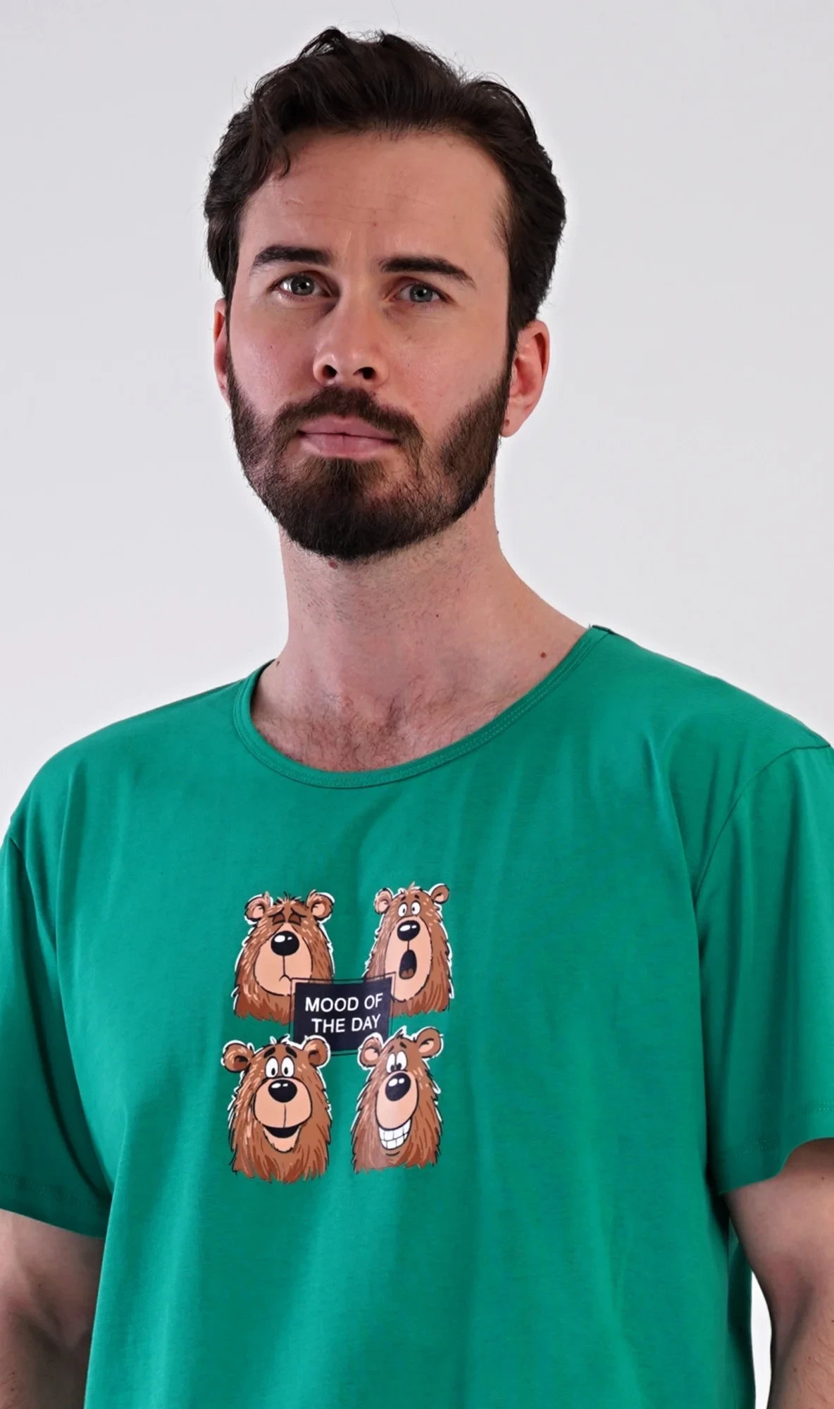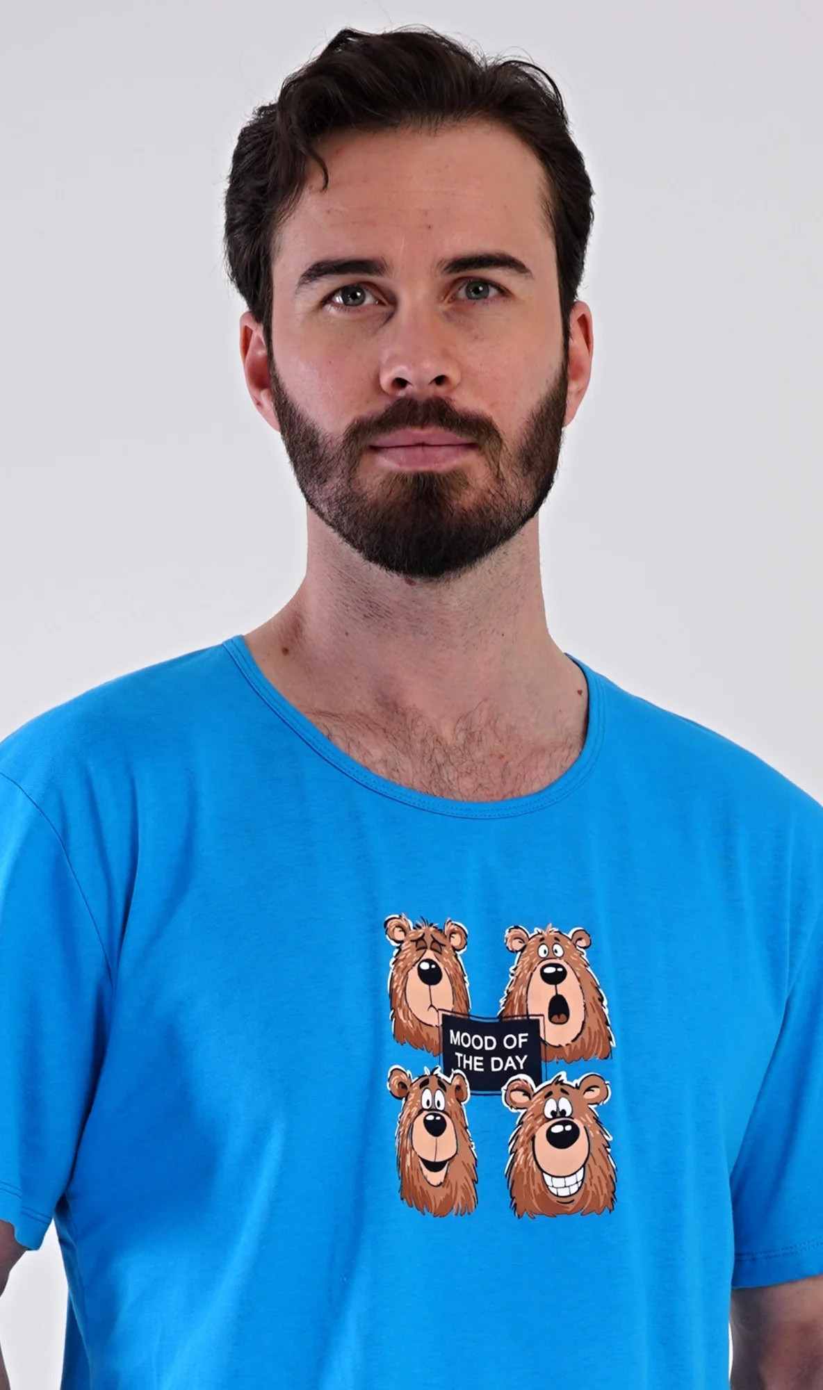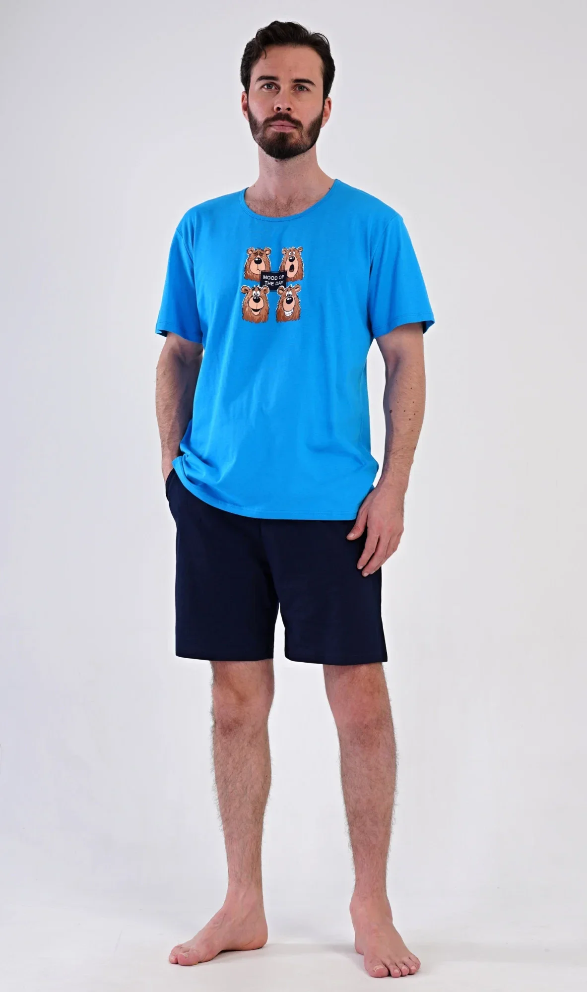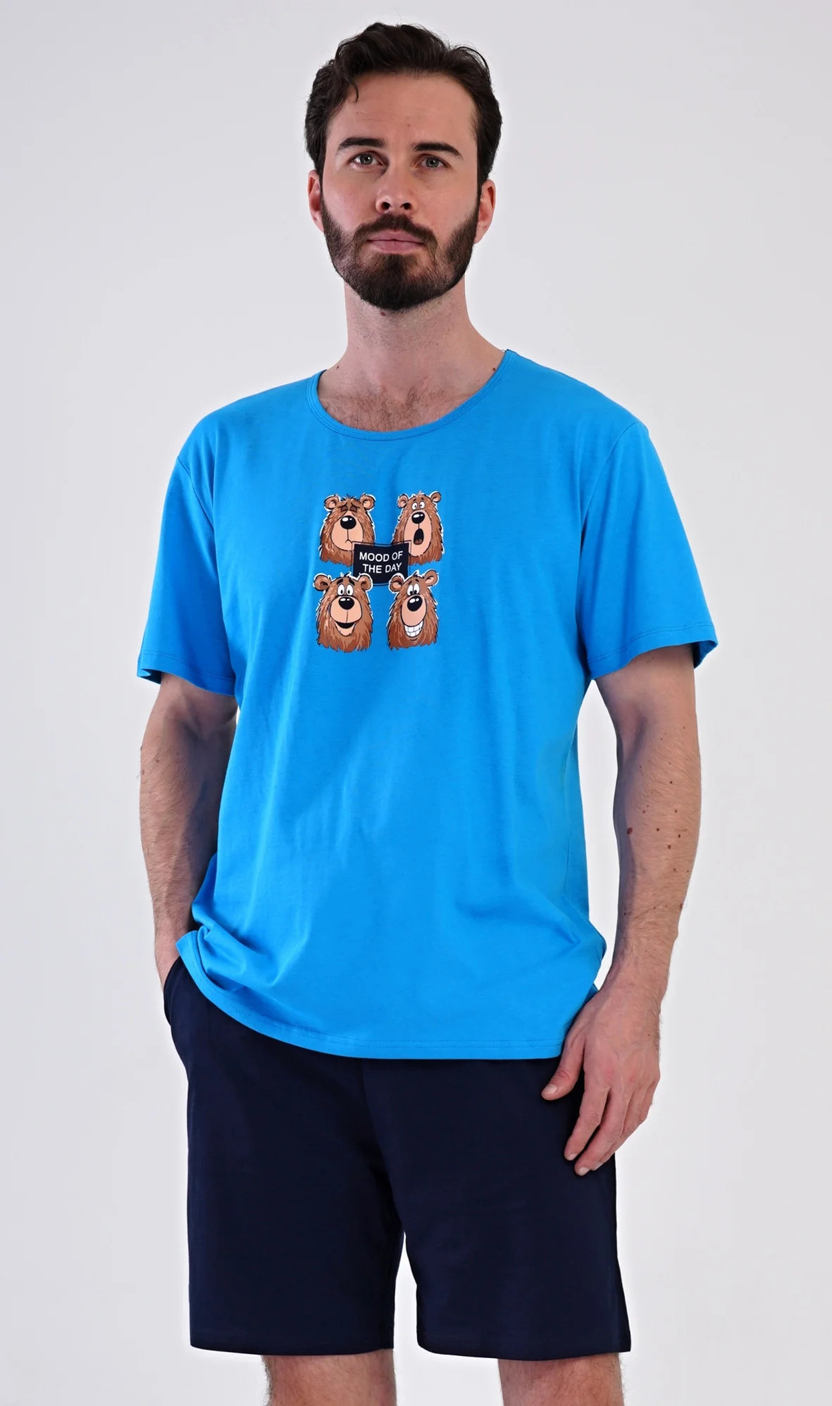 Pánské bavlněné šortkové pyžamo Méďa Happy. Pánské pyžamo se skládá z trička s krátkým rukávem a krátkých šortkových kalhot. Na jednobarevném tričku je obrázek medvěda, jehož výraz se mění v průběhu (pracovního) dne. Šortky mají praktické kapsy, v pase gumu a šňůrku na stáhnutí. Použitý materiál s podílem bavlny 100% je příjemný a poddaný na dotek. Pyžamo je vhodné i na denní nošení a oceníte ho obzvlášť v horkých letních dnech.