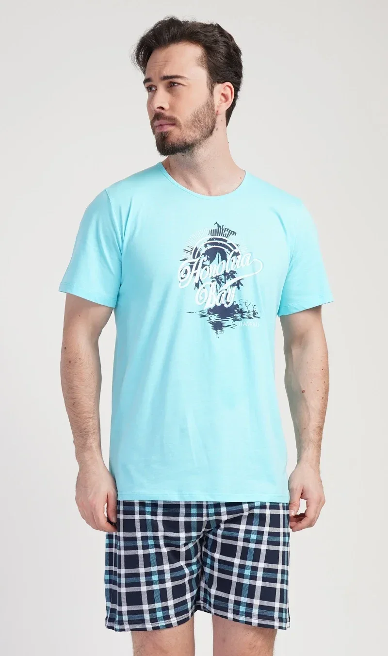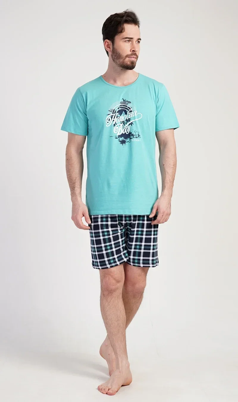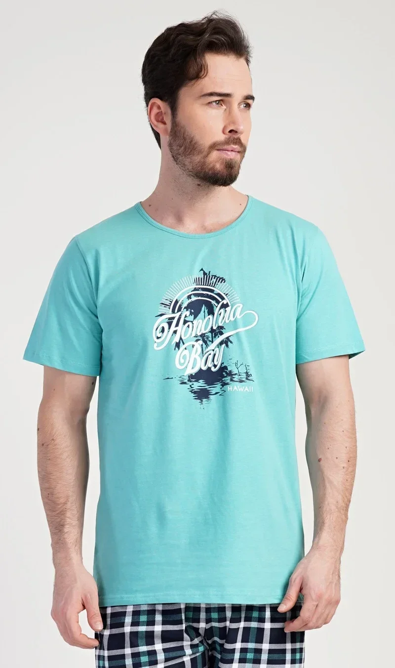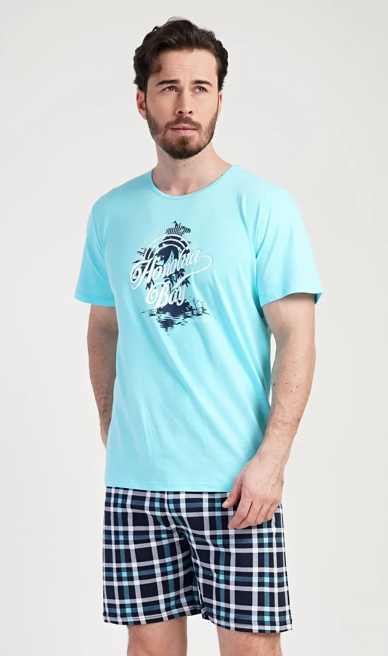 Pánské bavlněné pyžamo šortky Honolua bay. Pánské pyžamo se skládá z trička s krátkým rukávem a krátkých šortkových kalhot. Na tričku je obrázek malého ostrova a nápis 'Honolua bay'. Tričko doplňují kárované šortky, které mají v pase gumu a šňůrku na stažení, nemají kapsy. Použitý materiál s obsahem bavlny 100% je příjemný a poddajný na dotek.