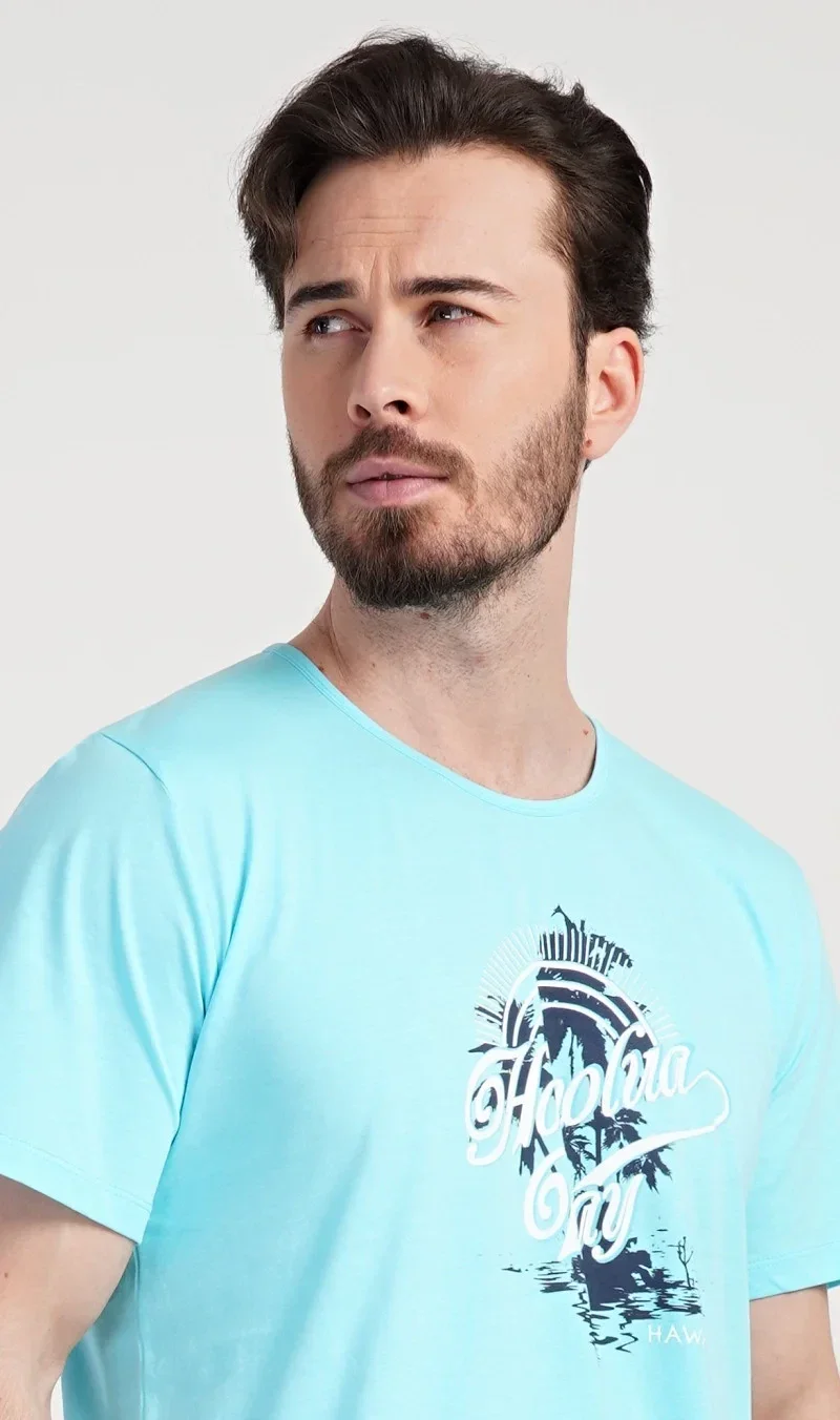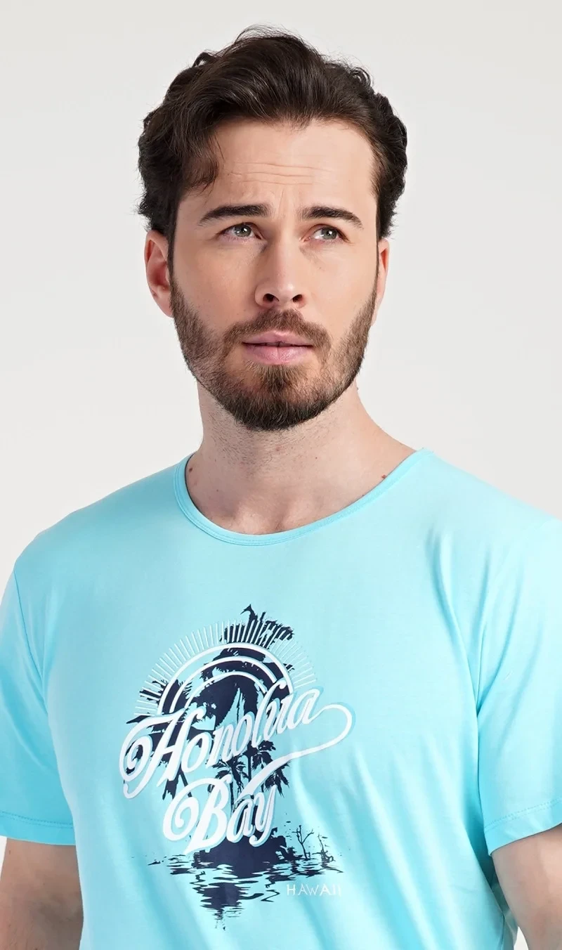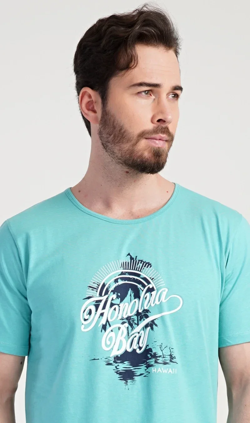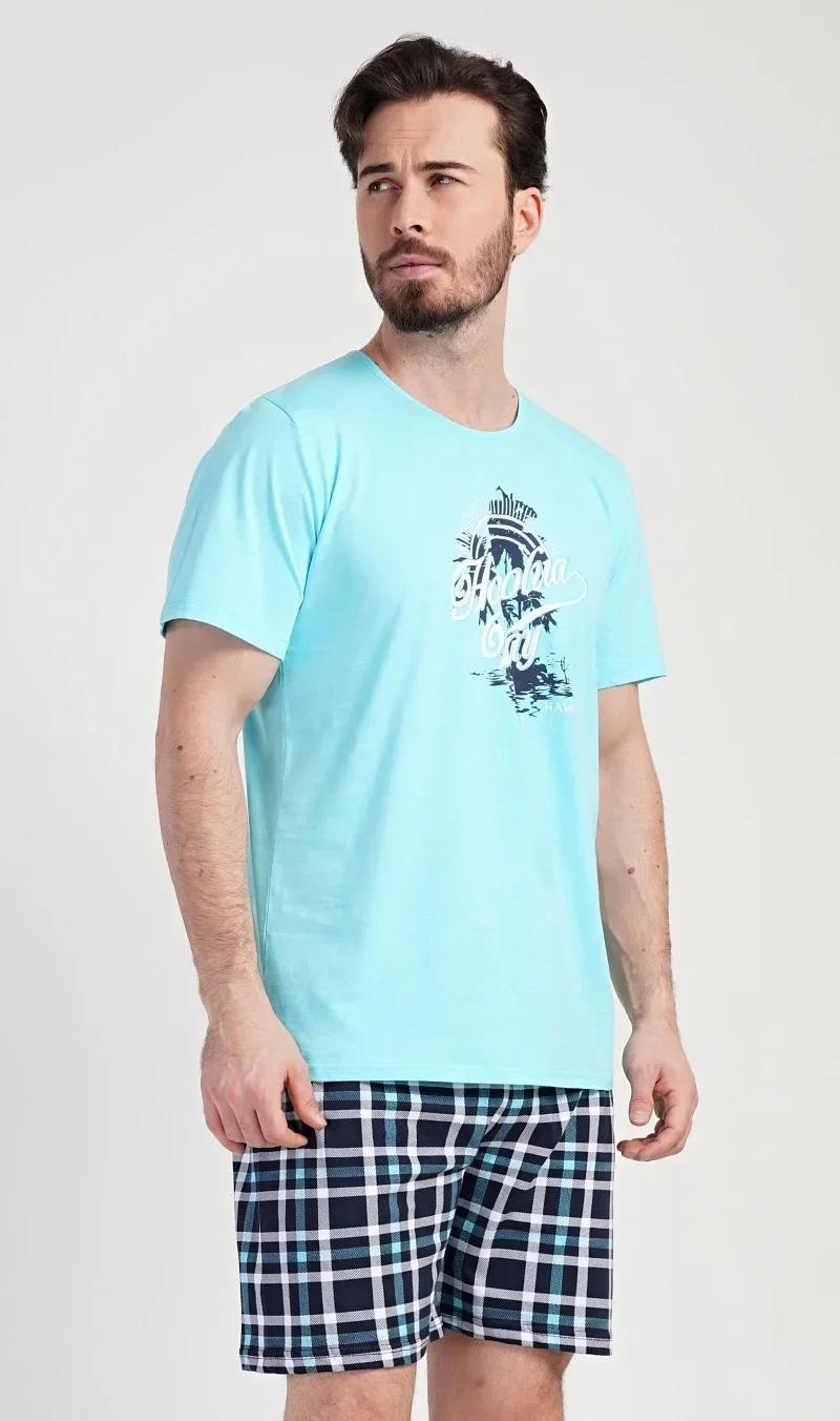 Pánské bavlněné pyžamo šortky Honolua bay. Pánské pyžamo se skládá z trička s krátkým rukávem a krátkých šortkových kalhot. Na tričku je obrázek malého ostrova a nápis 'Honolua bay'. Tričko doplňují kárované šortky, které mají v pase gumu a šňůrku na stažení, nemají kapsy. Použitý materiál s obsahem bavlny 100% je příjemný a poddajný na dotek.