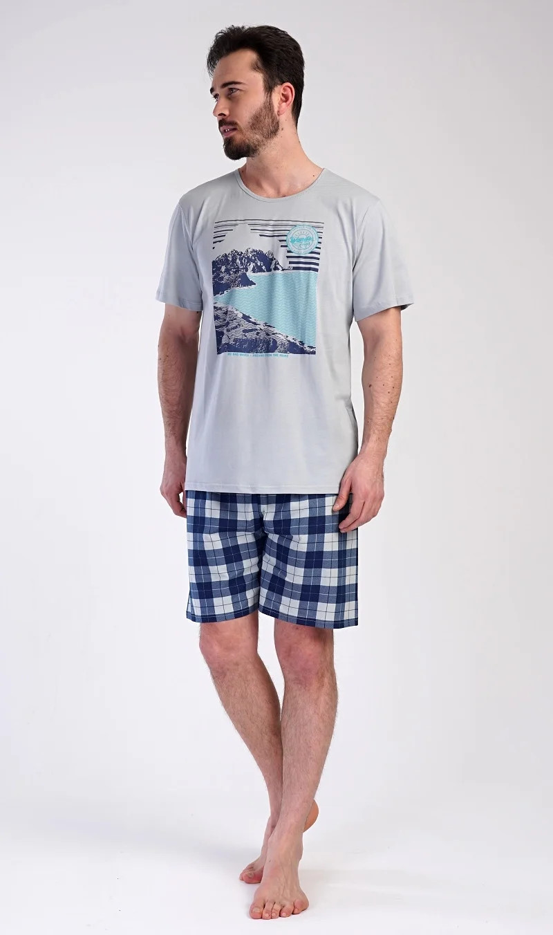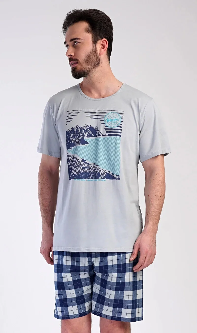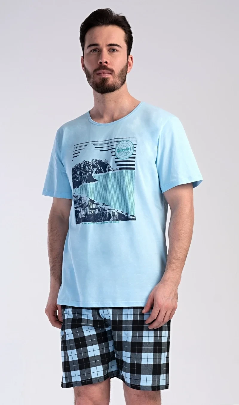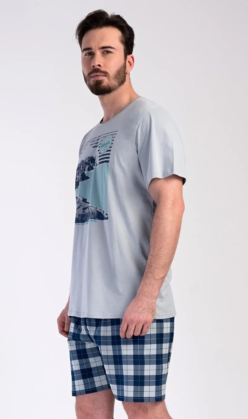 Pánské bavlněné pyžamo šortky Wander. Pánské pyžamo se skládá z trička s krátkým rukávem a krátkých šortkových kalhot. Na tričku je obrázek skalnatého pobřeží a drobný nápis 'Wander'. Tričko doplňují kárované šortky, které mají v pase gumu a šňůrku na stažení, nemají kapsy. Toto pyžamo je vhodným dárkem pro všechny milovníky moře, hor a cestování. Použitý materiál s obsahem bavlny 100% je příjemný a poddajný na dotek.