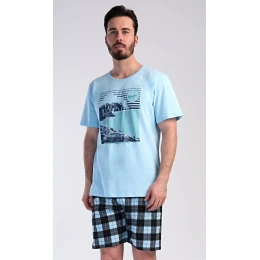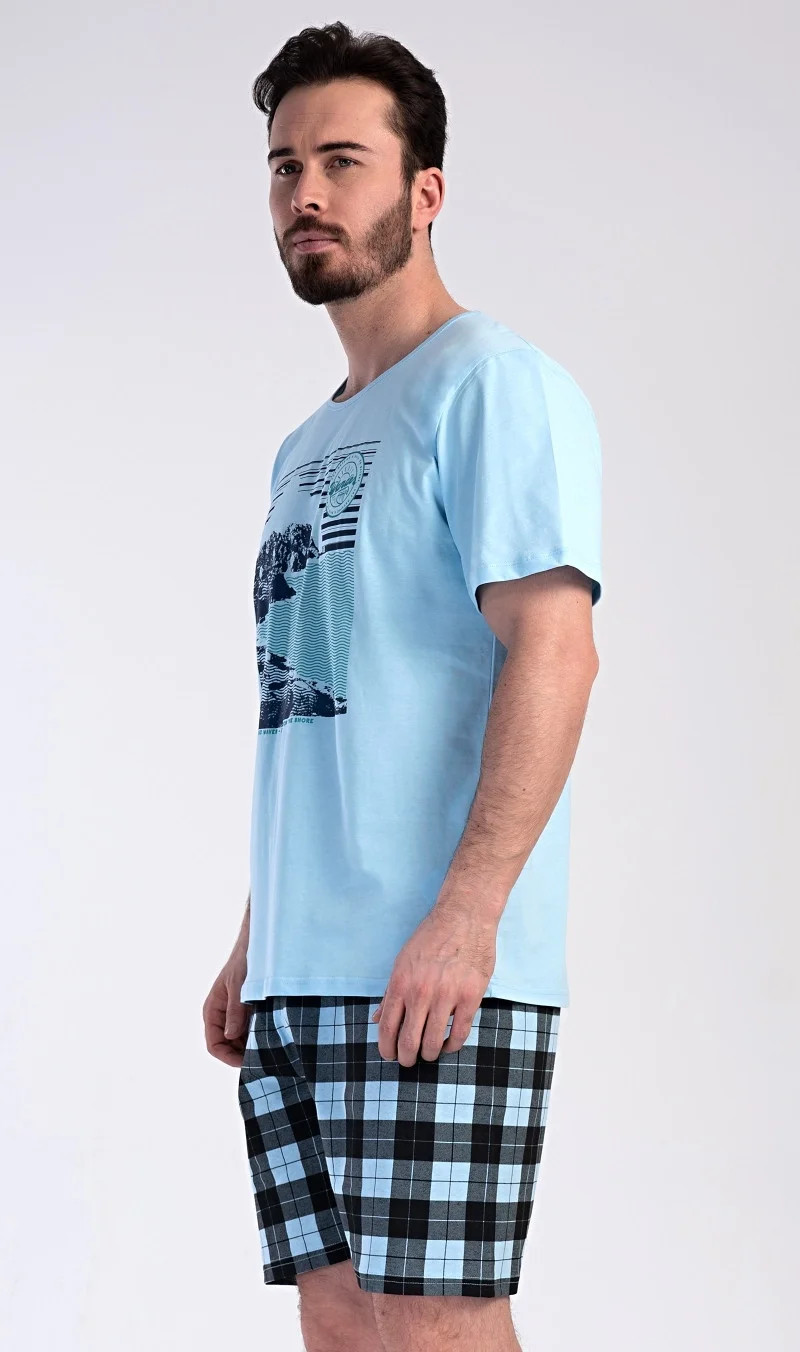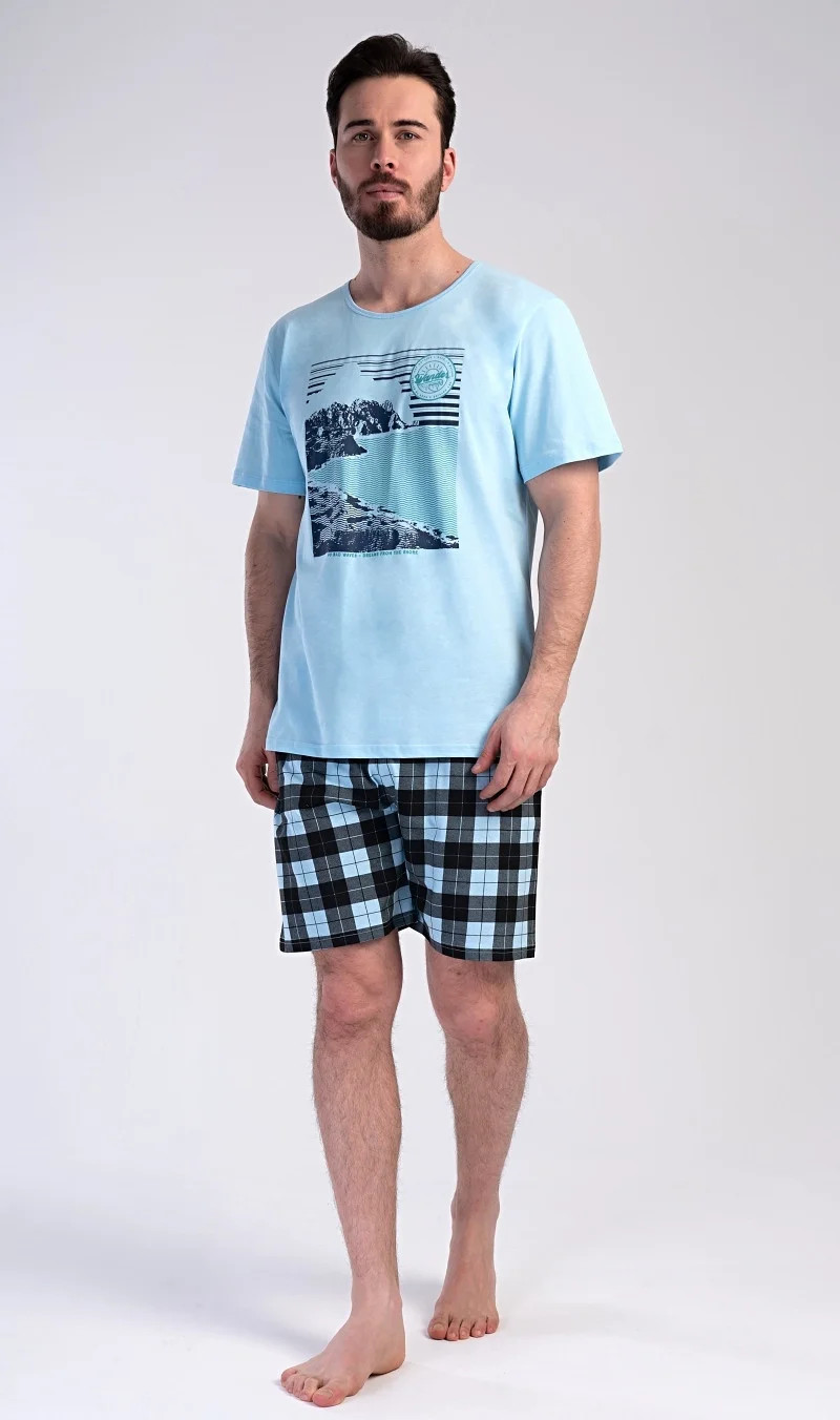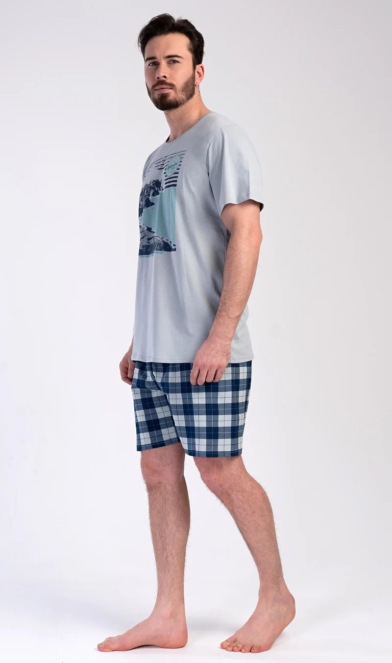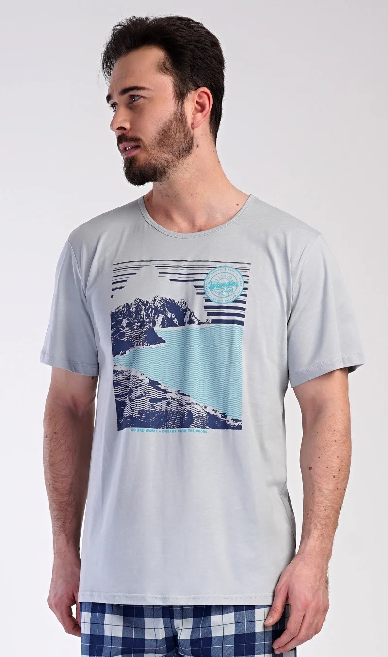Pánské bavlněné pyžamo šortky Wander. Pánské pyžamo se skládá z trička s krátkým rukávem a krátkých šortkových kalhot. Na tričku je obrázek skalnatého pobřeží a drobný nápis 'Wander'. Tričko doplňují kárované šortky, které mají v pase gumu a šňůrku na stažení, nemají kapsy. Toto pyžamo je vhodným dárkem pro všechny milovníky moře, hor a cestování. Použitý materiál s obsahem bavlny 100% je příjemný a poddajný na dotek.