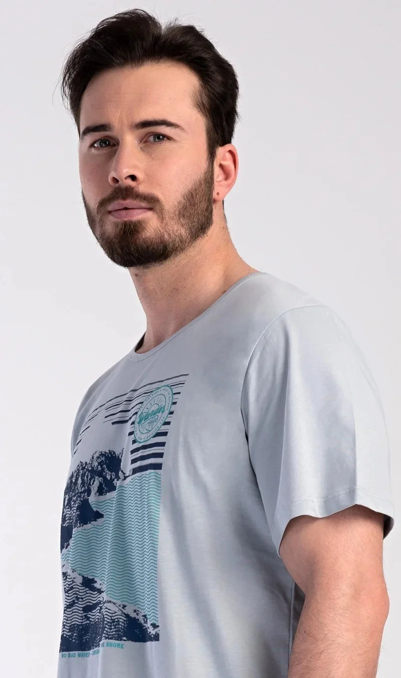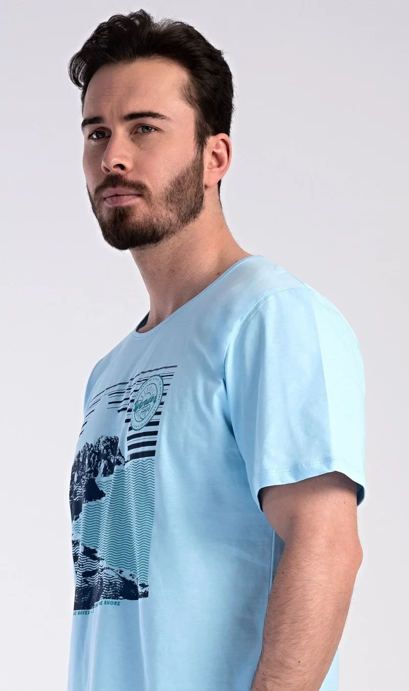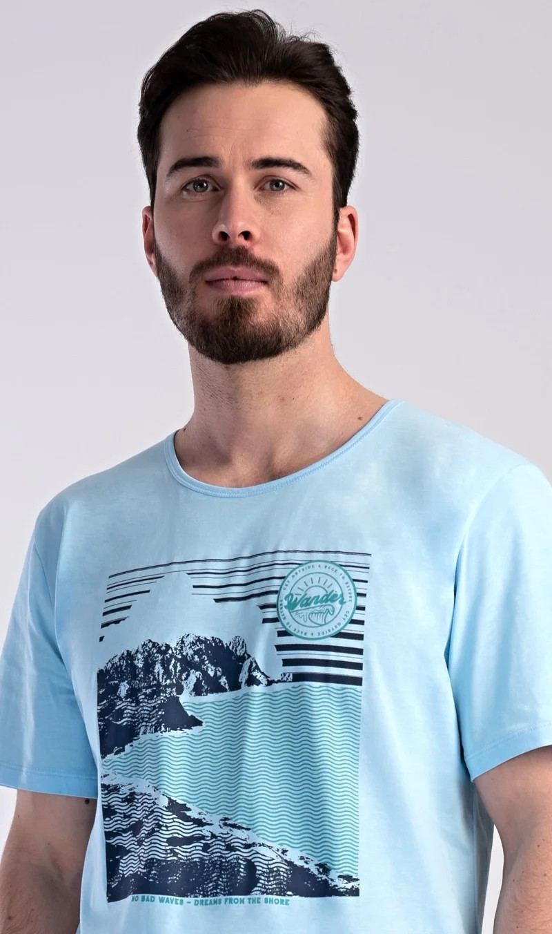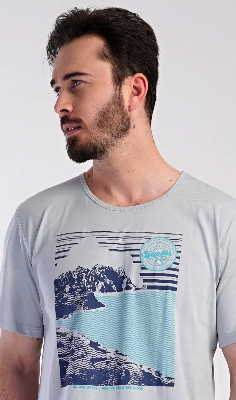 Pánské bavlněné pyžamo šortky Wander. Pánské pyžamo se skládá z trička s krátkým rukávem a krátkých šortkových kalhot. Na tričku je obrázek skalnatého pobřeží a drobný nápis 'Wander'. Tričko doplňují kárované šortky, které mají v pase gumu a šňůrku na stažení, nemají kapsy. Toto pyžamo je vhodným dárkem pro všechny milovníky moře, hor a cestování. Použitý materiál s obsahem bavlny 100% je příjemný a poddajný na dotek.