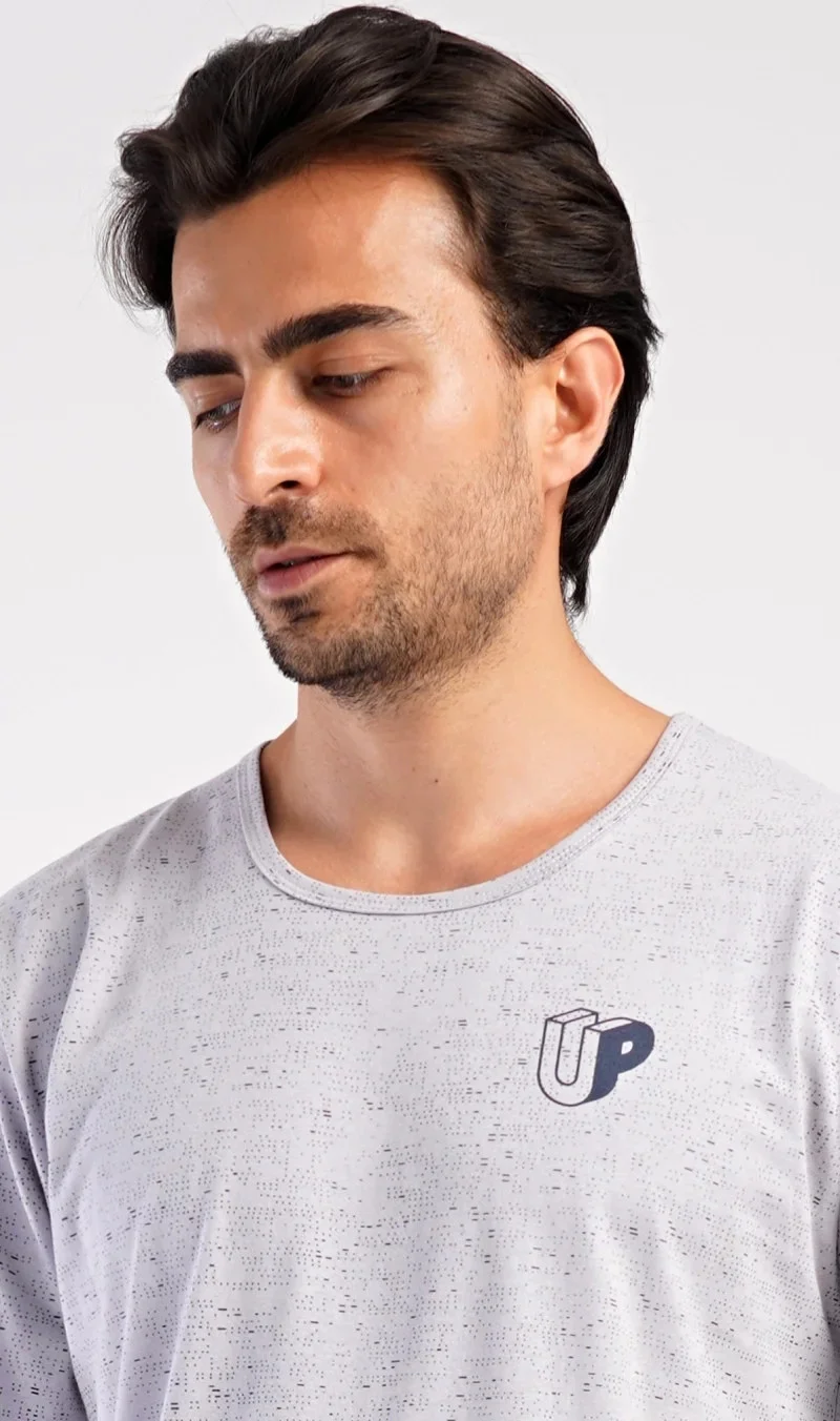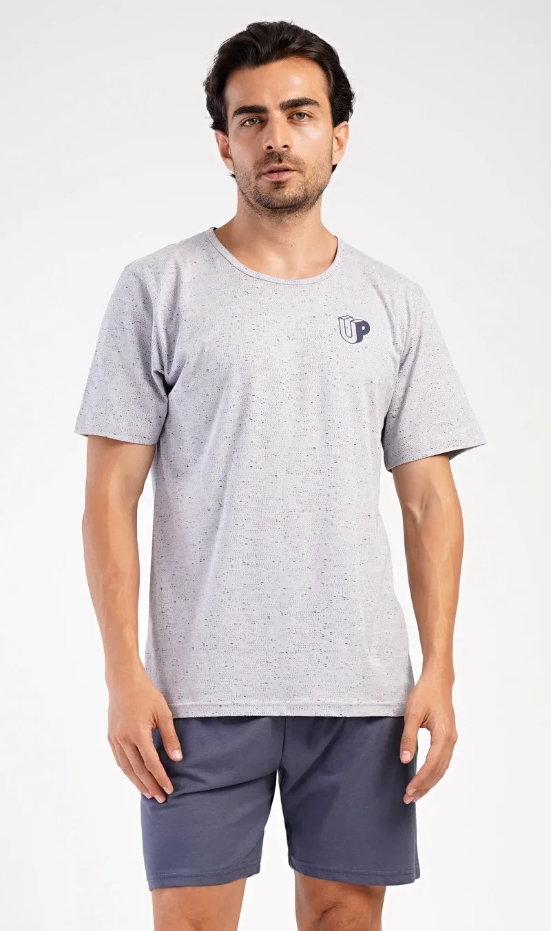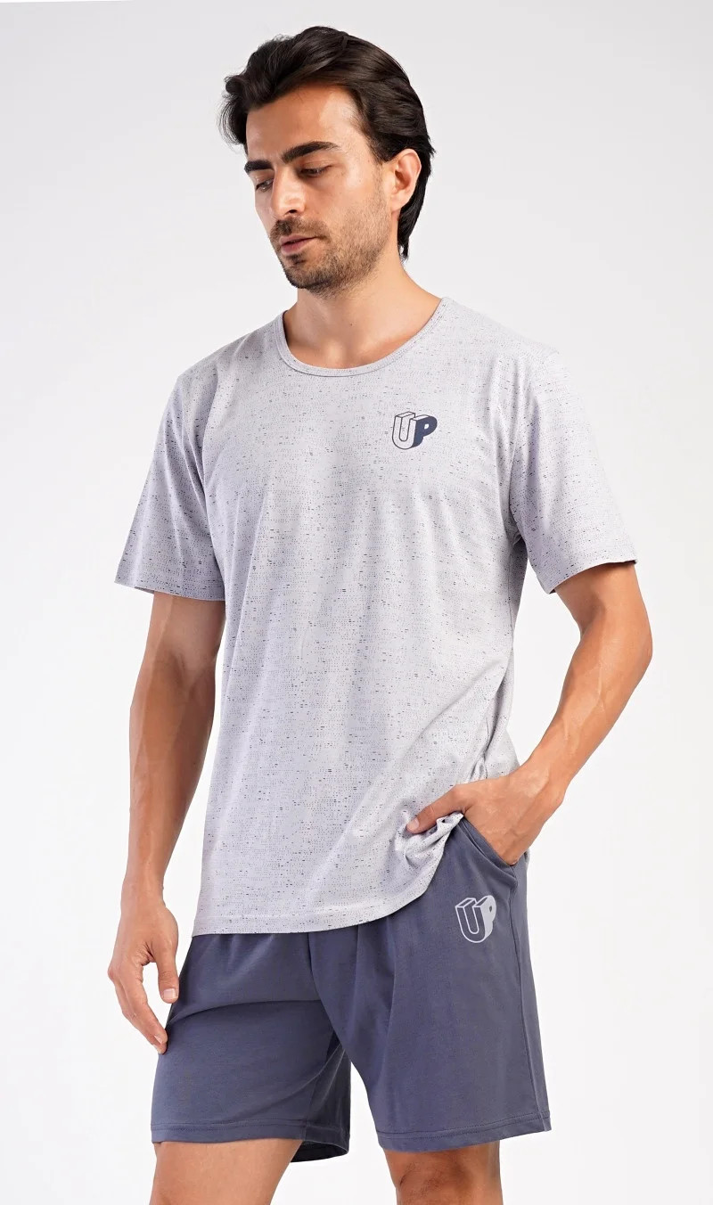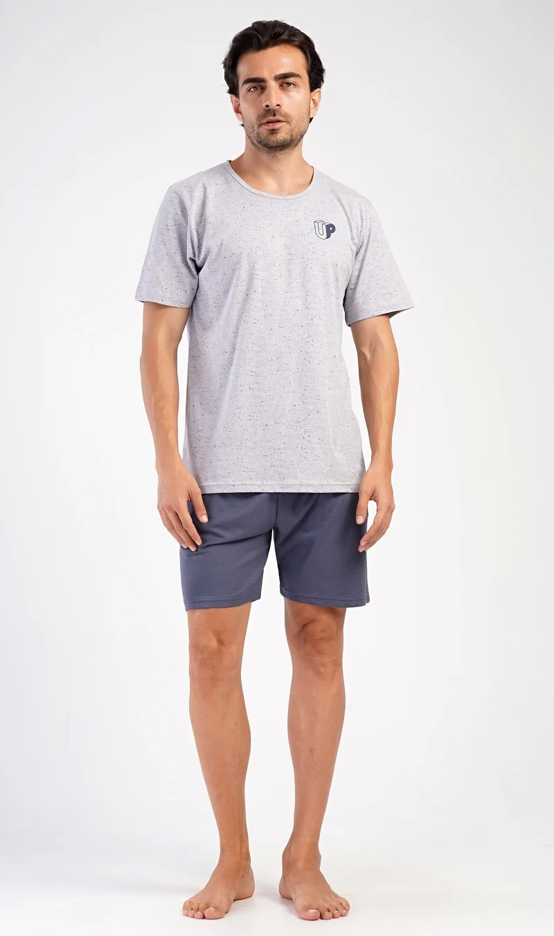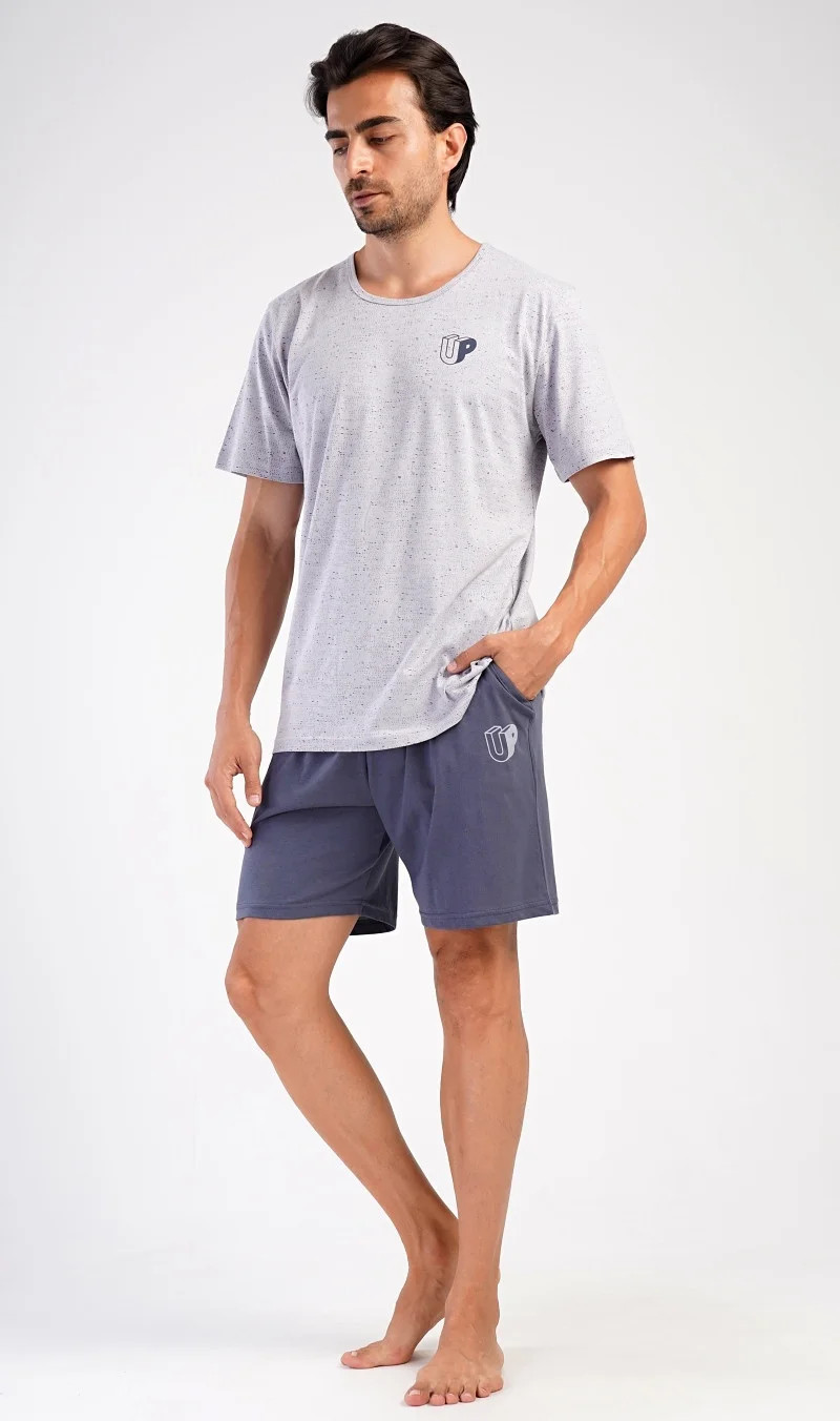 Pánské bavlněné šortkové pyžamo Pedro. Pánské pyžamo se skládá z trička s krátkým rukávem a krátkých šortkových kalhot. Tričko je zdobené nepravidelnými proužky a nápisem 'UP'. Drobný nápis najdete i na jednobarevných šortkách, které mají v pase gumu, šňůrku na stažení a praktické kapsy. Použitý materiál s obsahem bavlny 100% je poddajný a příjemný na dotek.