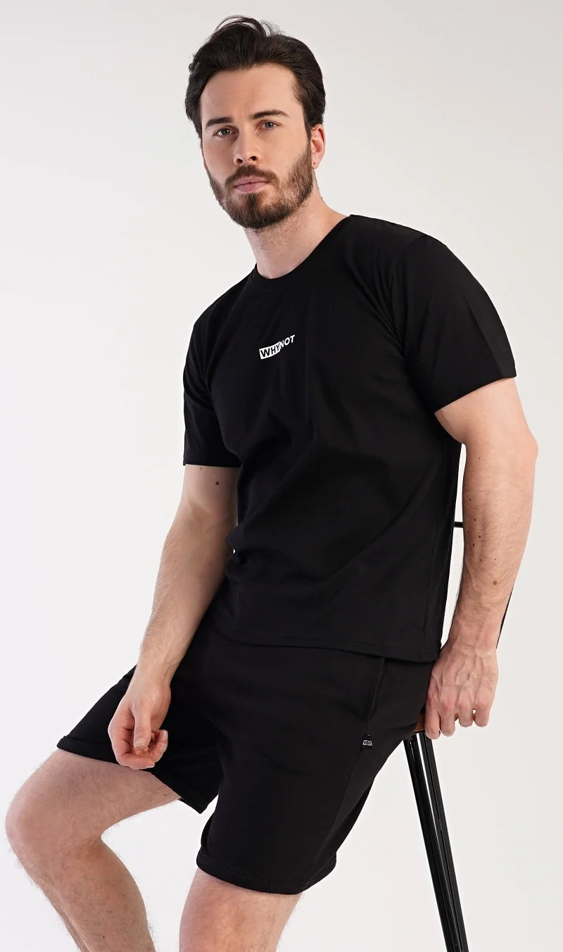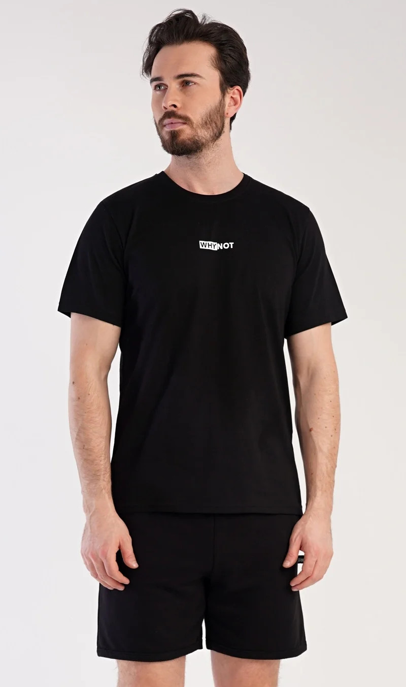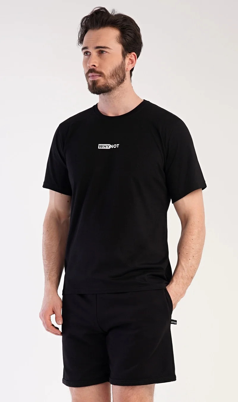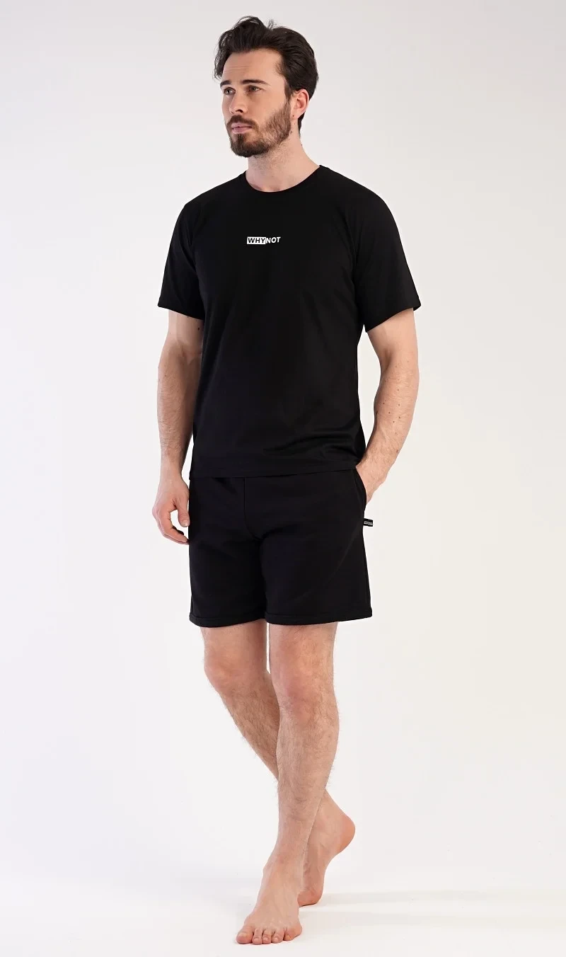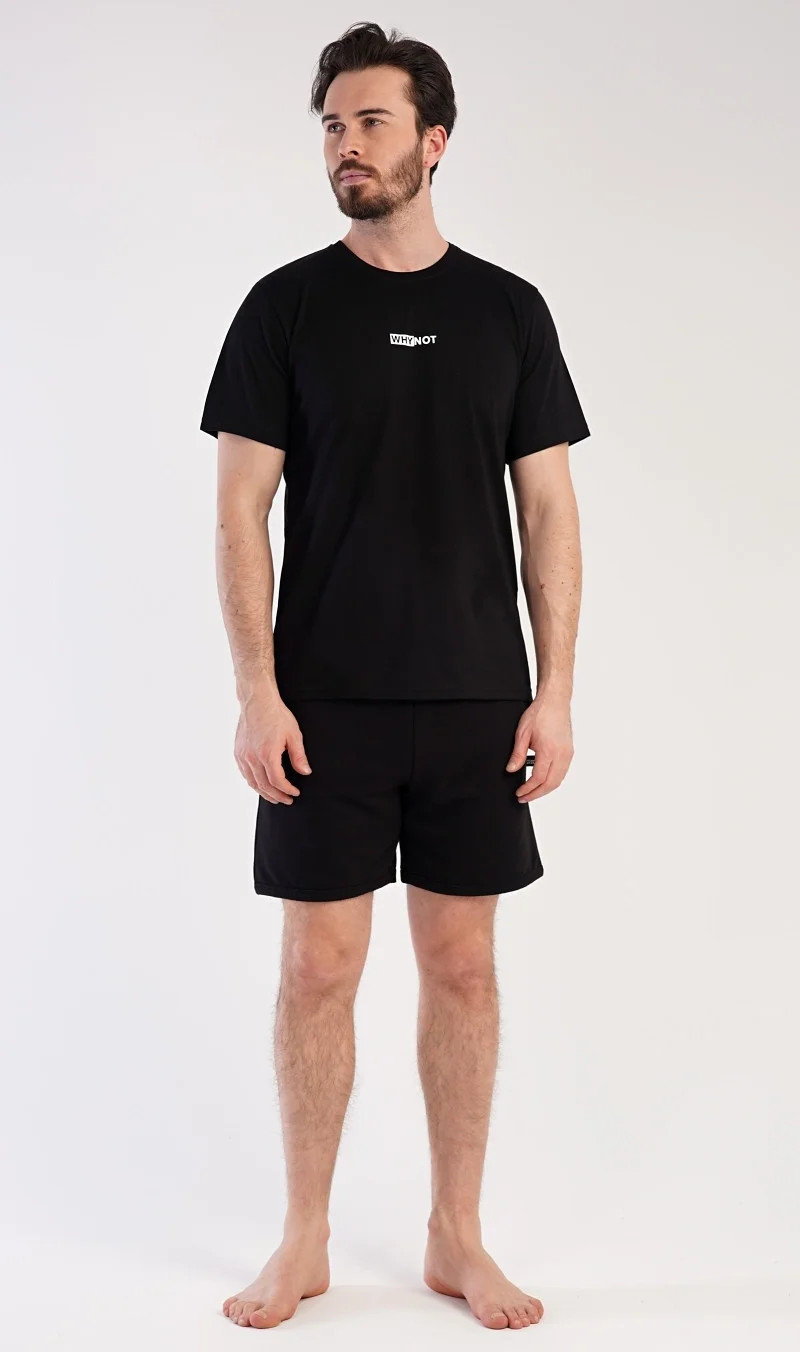 Pánské šortkové pyžamo Thomas. Pánská souprava se skládá z trička s krátkým rukávem a krátkých šortkových kalhot. Tričko s kulatým výstřihem zdobí drobný nápis. Jednobarevné šortky mají v pase gumu, šňůrku na stažení a praktické kapsy. Použitý materiál je příjemný a poddajný na dotek. Obsah bavlny u trička je 100% a u šortek 70%. Tato souprava je vhodná i na denní nošení.