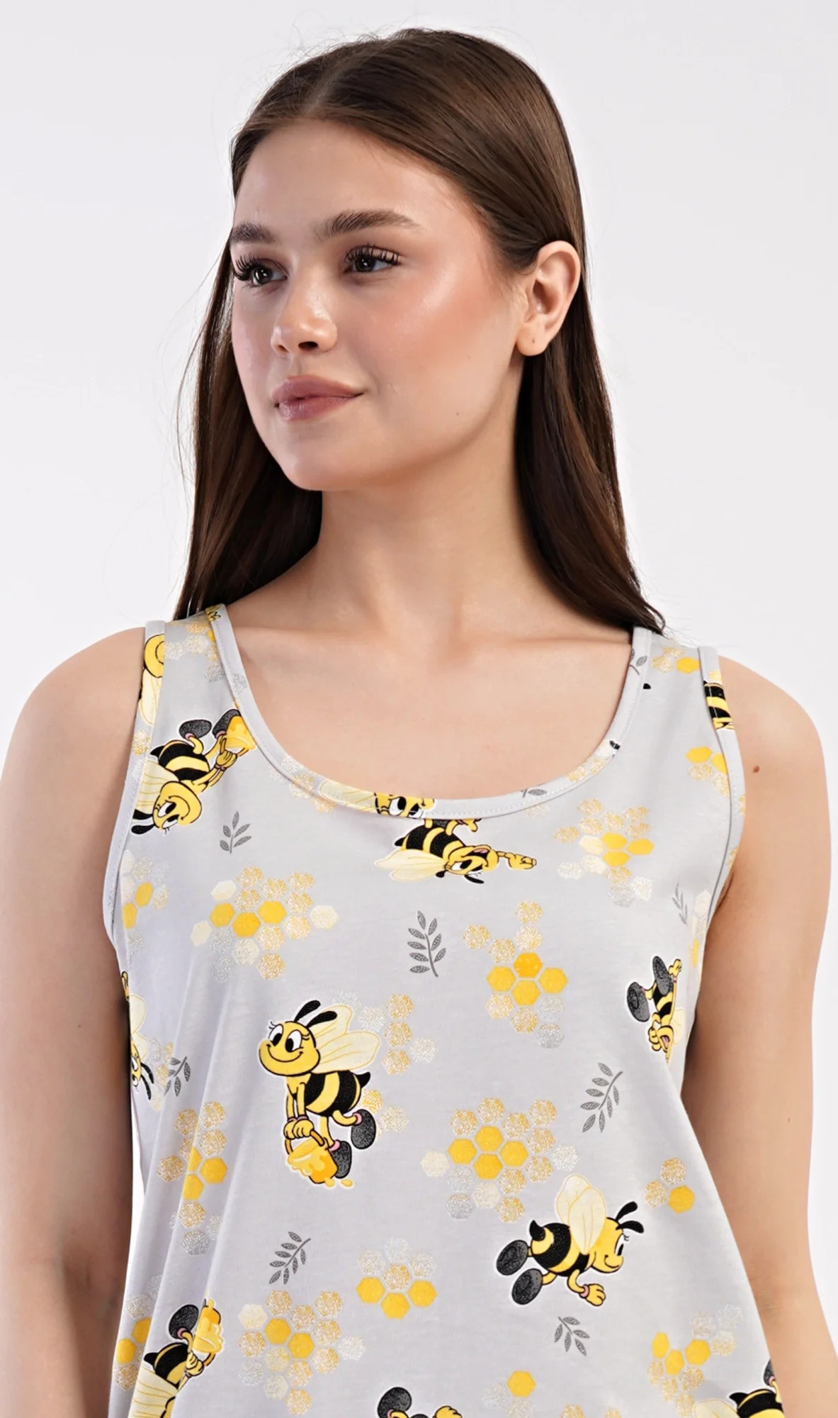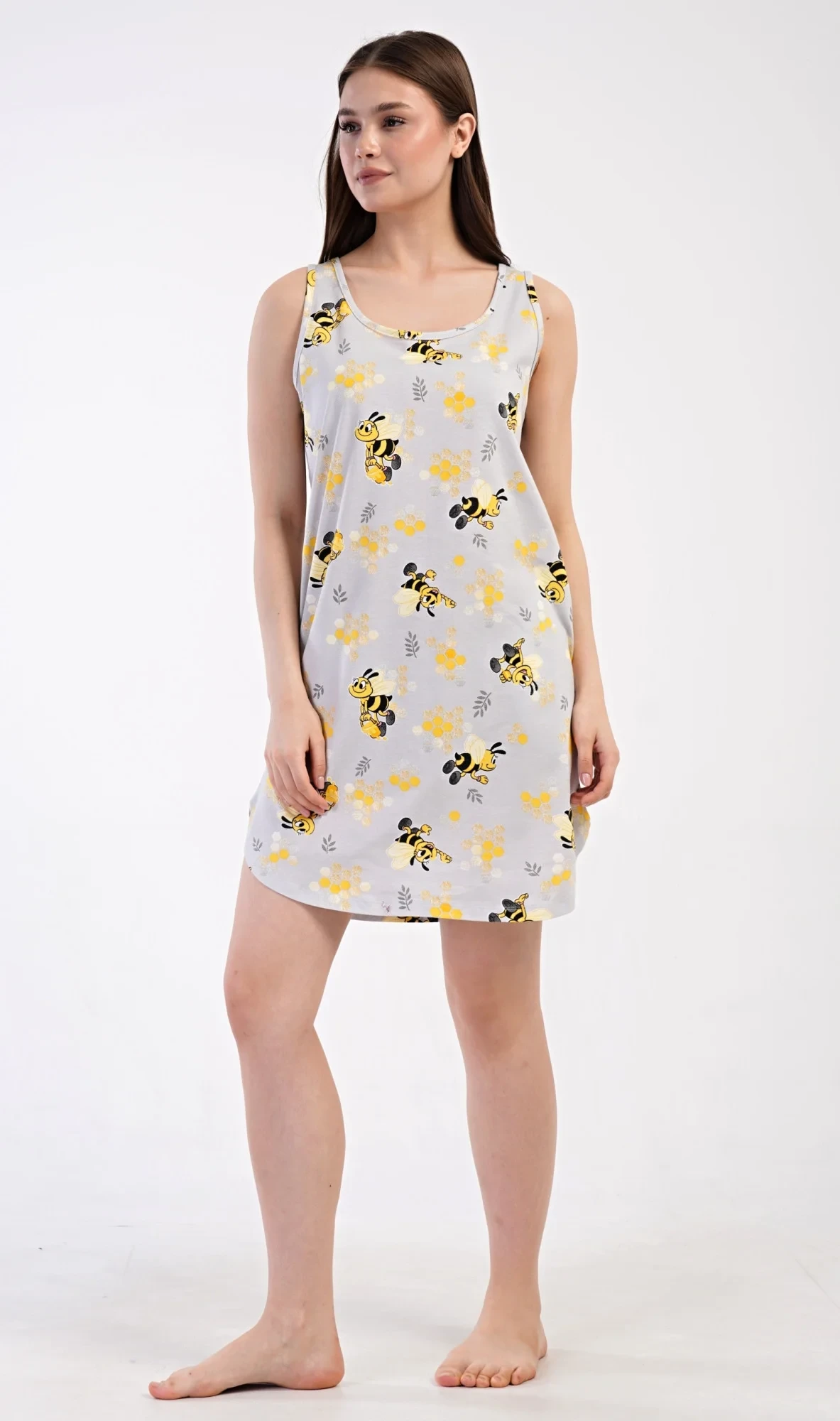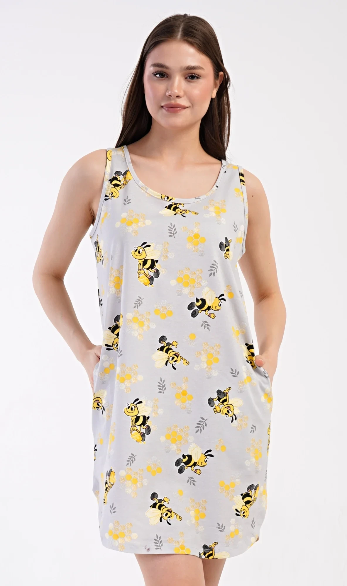 Dámská bavlněná noční košile na ramínka Včelky. Noční košile se širšími ramínky a kulatým výstřihem má praktické kapsy, je potištěna obrázky včelek. Použitý materiál s obsahem bavlny 100% je příjemný a poddajný na dotek. Košile je vhodná i na denní nošení, obvzlášť ji oceníte v horkých letních dnech.