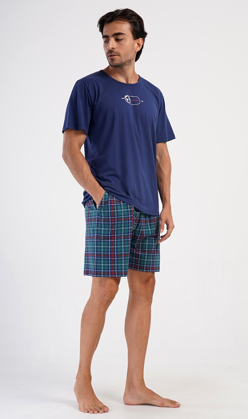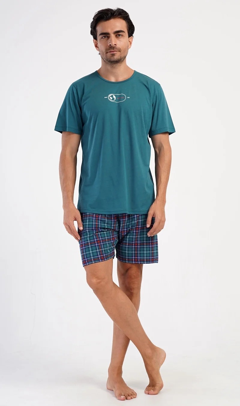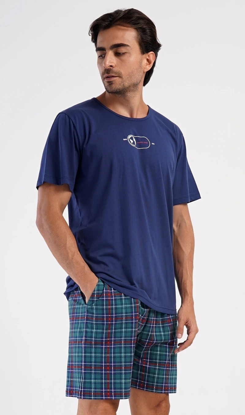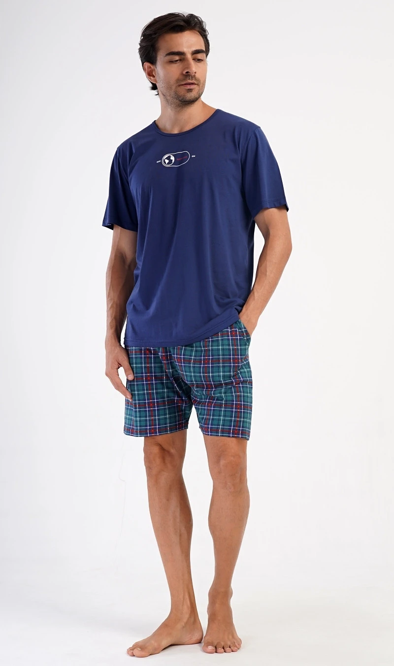 Pánské bavlněné šortkové pyžamo Tobias. Pánské pyžamo se skládá z trička s krátkým rukávem a krátkých šortkových kalhot. Tričko s kulatým výstřihem zdobí drobný obrázek zeměkoule. Tričko doplňují kárované šortky, které mají v pase gumu, šňůrku na stažení a praktické kapsy. Použitý materiál s obsahem bavlny 100% je příjemný a poddajný na dotek.