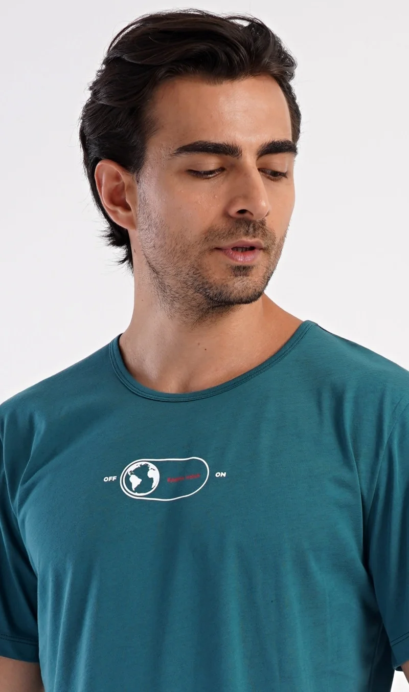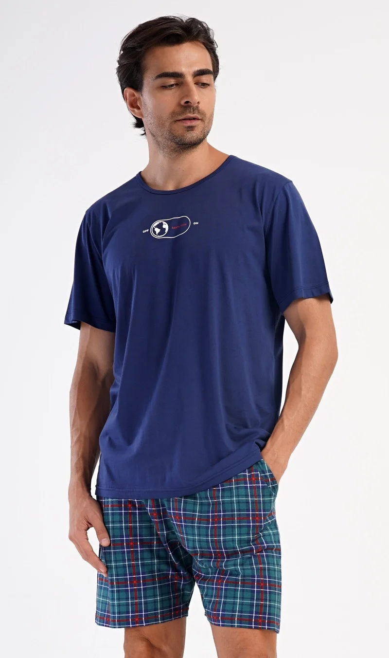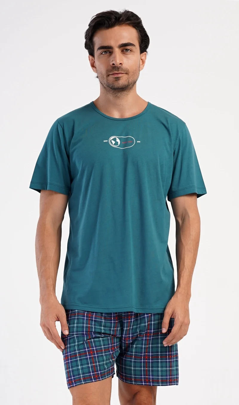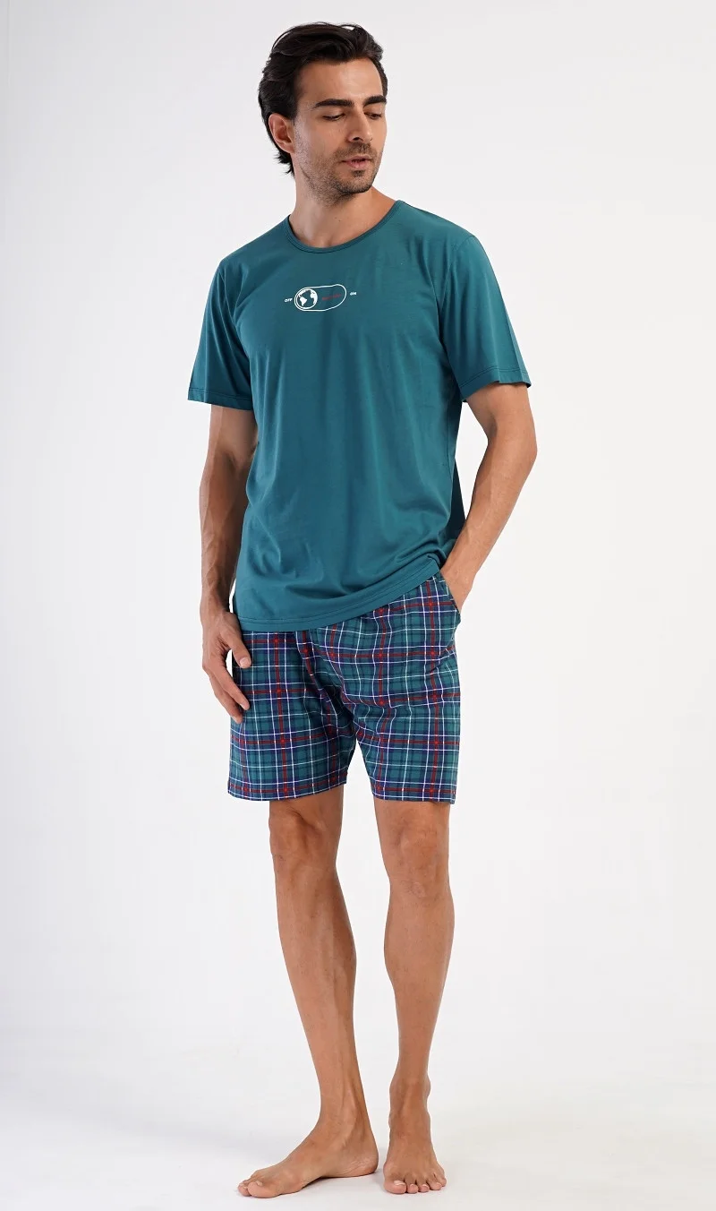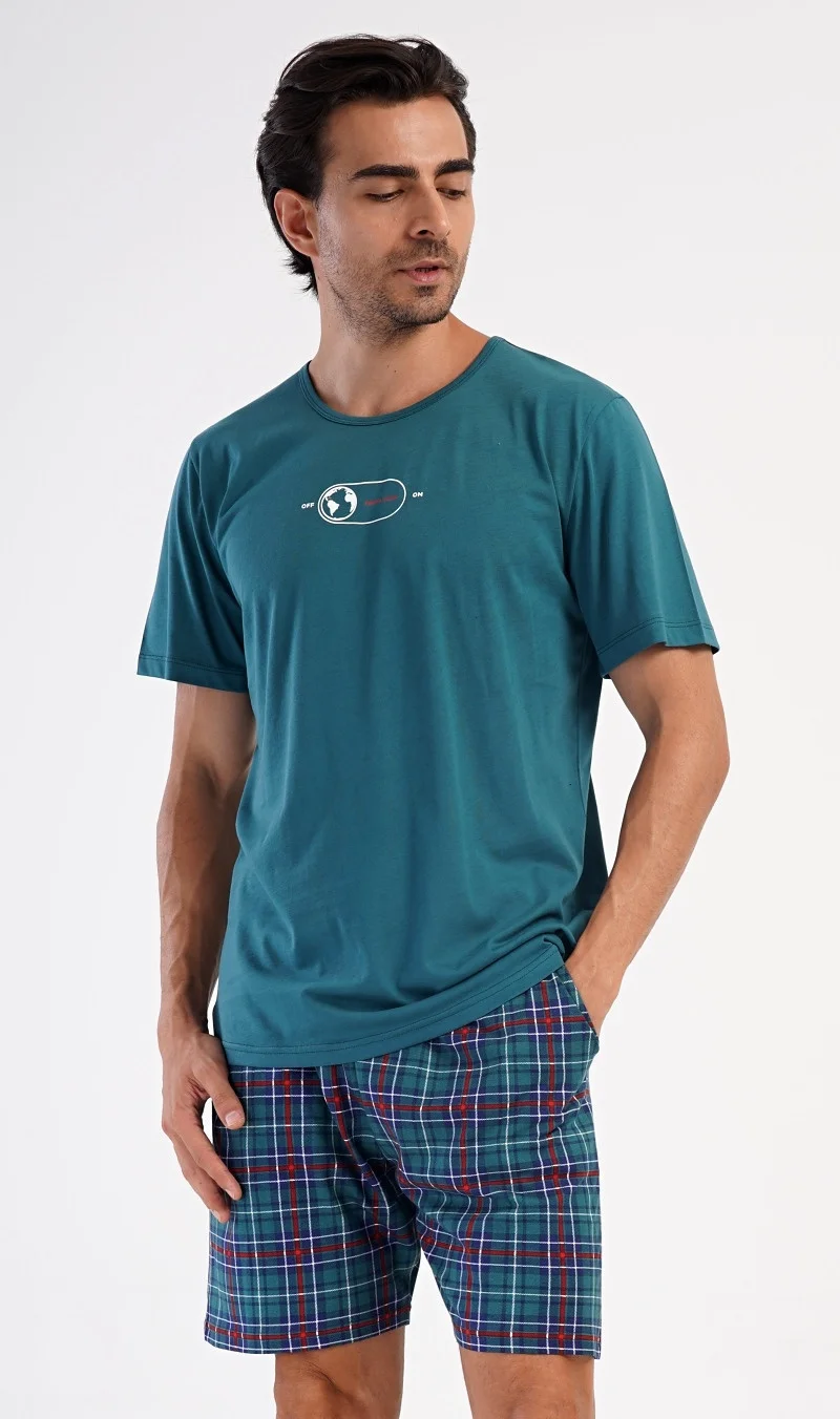 Pánské bavlněné šortkové pyžamo Tobias. Pánské pyžamo se skládá z trička s krátkým rukávem a krátkých šortkových kalhot. Tričko s kulatým výstřihem zdobí drobný obrázek zeměkoule. Tričko doplňují kárované šortky, které mají v pase gumu, šňůrku na stažení a praktické kapsy. Použitý materiál s obsahem bavlny 100% je příjemný a poddajný na dotek.