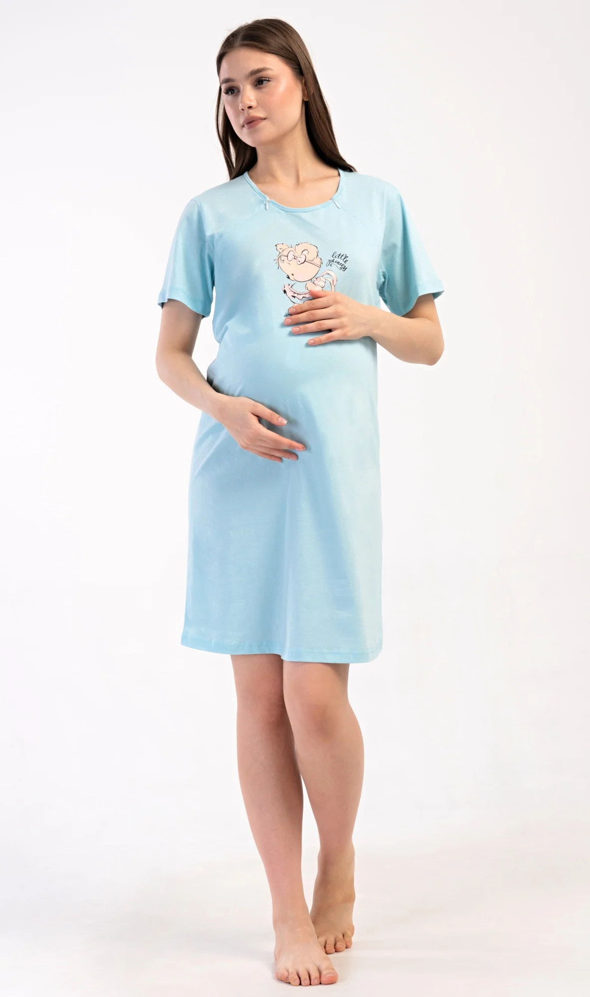 Dámská bavlněná mateřská noční košile Miláček. Noční košile je svým střihem určená na dobu těhotenství, do porodnice i ke kojení. Ke kojení slouží průstřihy po stranách košile, které jsou uzavíratelné na zip. Přední díl košile zdobí obrázek roztomilého medvídka. Použitý materiál s podílem bavlny 100% je příjemný a poddajný na dotek.