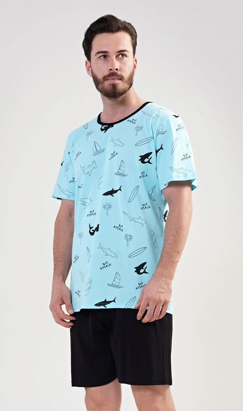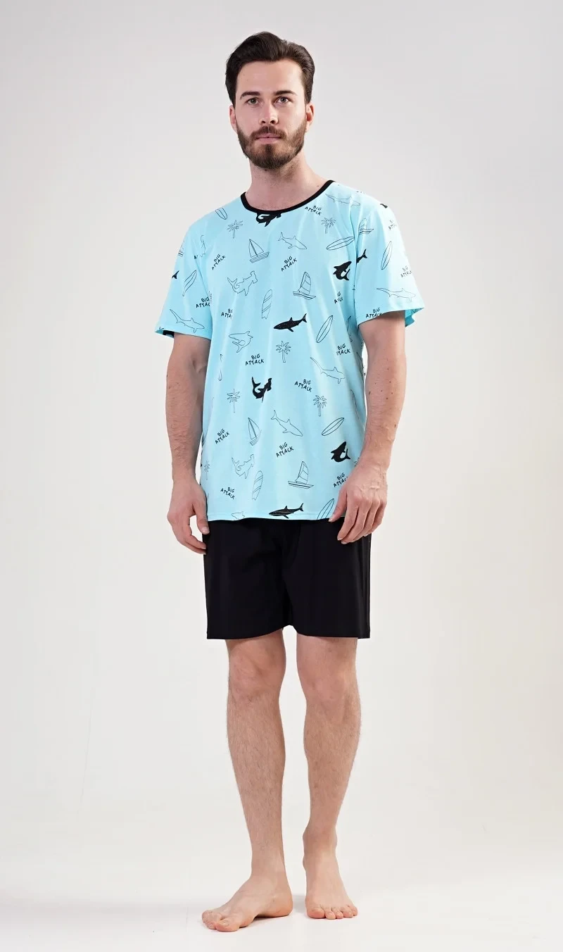 Pánské bavlněné pyžamo šortky Oceán. Pánské pyžamo šortky se skládá z trika s krátkým rukávem a krátkých šortkových kalhot. Tričko je potištěno loďkami, žraloky , palmami a nápisem Big Attack. Pestré tričko vhodně doplňují jednobarevné šortky. Šortky jsou bez kapes, mají gumu a šňůrku na stažení. Použitý materiál s podílem bavlny 100% je příjemný a poddajný na dotek. Pyžamo je vhodné i na denní nošení.