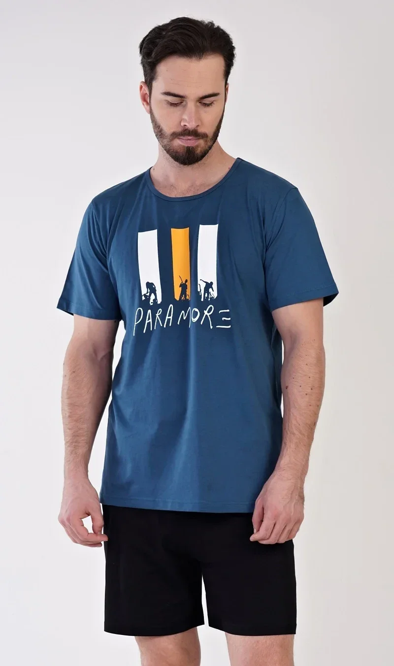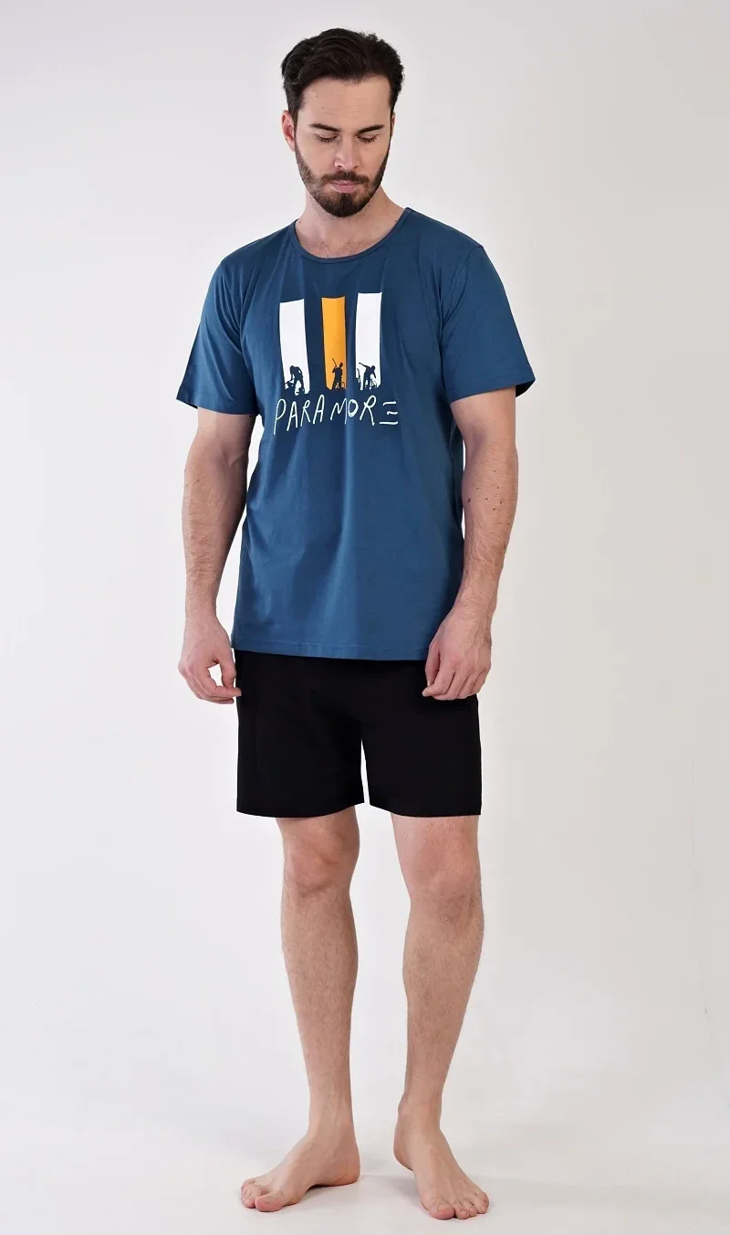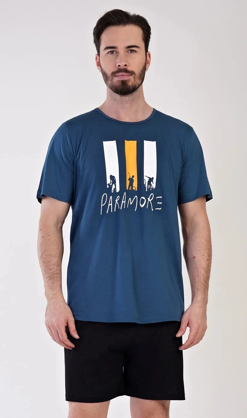 Pánské bavlněné pyžamo šortky Oliver. Pánské pyžamo se skládá z trička s krátkým rukávem a krátkých šortkových kalhot. Na jednobarevném tričku s kulatým výstřihem je nápis PARAMORE a obrázky rockové kapely. Tričko doplňují jednobarevné šortky, které mají v pase gumu a šňůrku ke stažení. Nemají kapsy. Použitý materiál je příjemný a poddajný na dotek. Podíl bavlny u trička a šortek je 100%. Pyžamo je vhodné i na denní nošení.