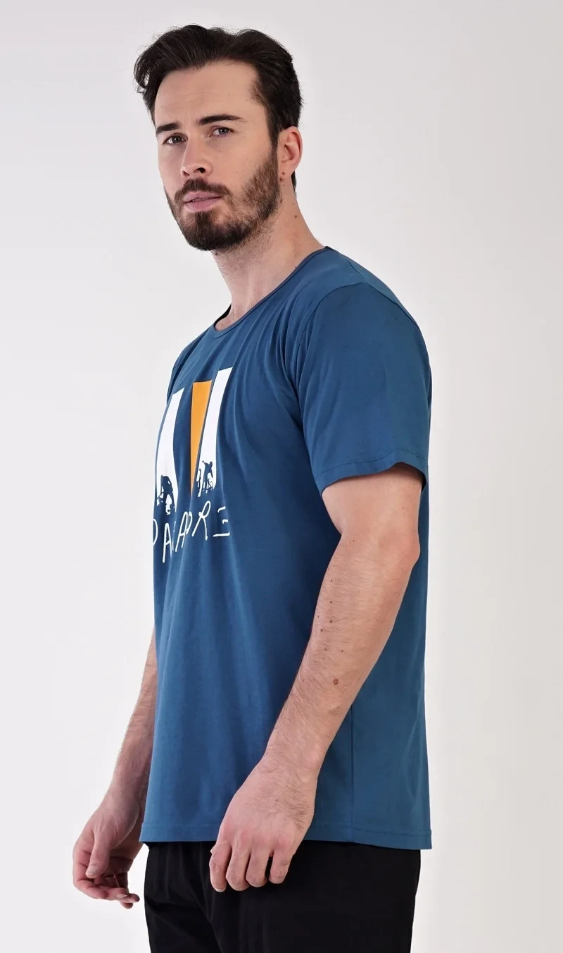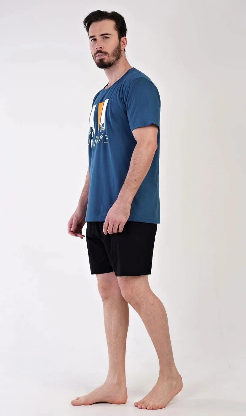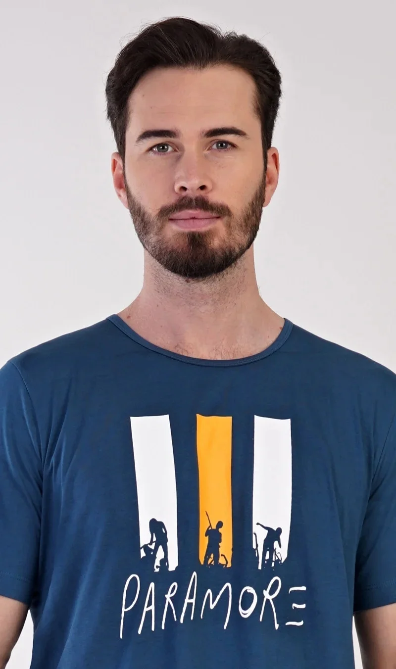 Pánské bavlněné pyžamo šortky Oliver. Pánské pyžamo se skládá z trička s krátkým rukávem a krátkých šortkových kalhot. Na jednobarevném tričku s kulatým výstřihem je nápis PARAMORE a obrázky rockové kapely. Tričko doplňují jednobarevné šortky, které mají v pase gumu a šňůrku ke stažení. Nemají kapsy. Použitý materiál je příjemný a poddajný na dotek. Podíl bavlny u trička a šortek je 100%. Pyžamo je vhodné i na denní nošení.