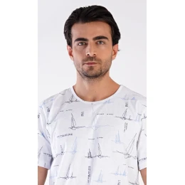 Pánské bavlněné pyžamo šortky Plachetnice. Pánské pyžamo se skládá z trička s krátkým rukávem a krátkých šortkových kalhot. Jednobarevné tričko je potištěno konturami plachetnic. Tričko vhodně doplňují jednobarevné krátké kalhoty, na kterých se opakuje potisk s námořnickým motivem. Šortky mají v pase gumu, šňůrku na stažení, nemají kapsy. Použitý materál s obsahem bavlny 100% je příjemný a poddajný na dotek.