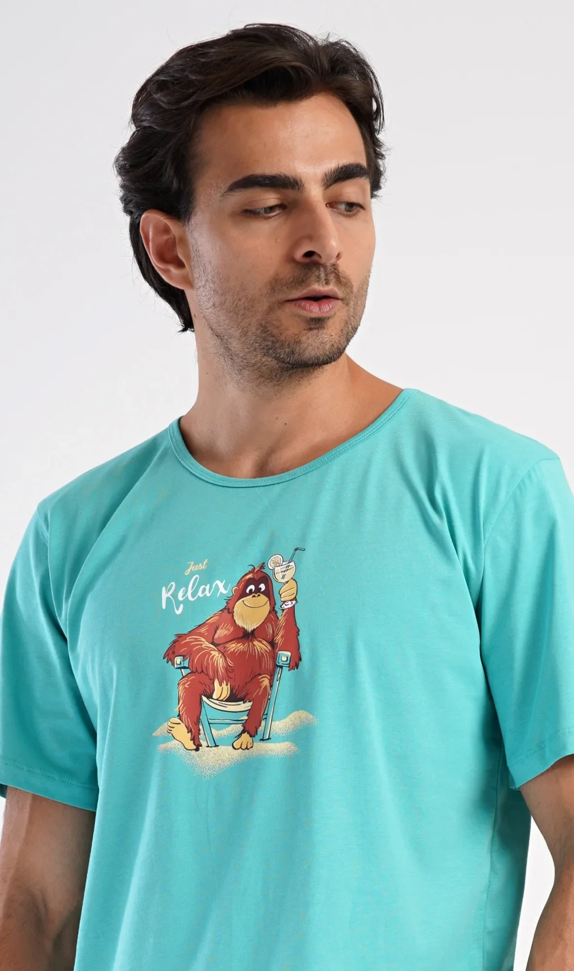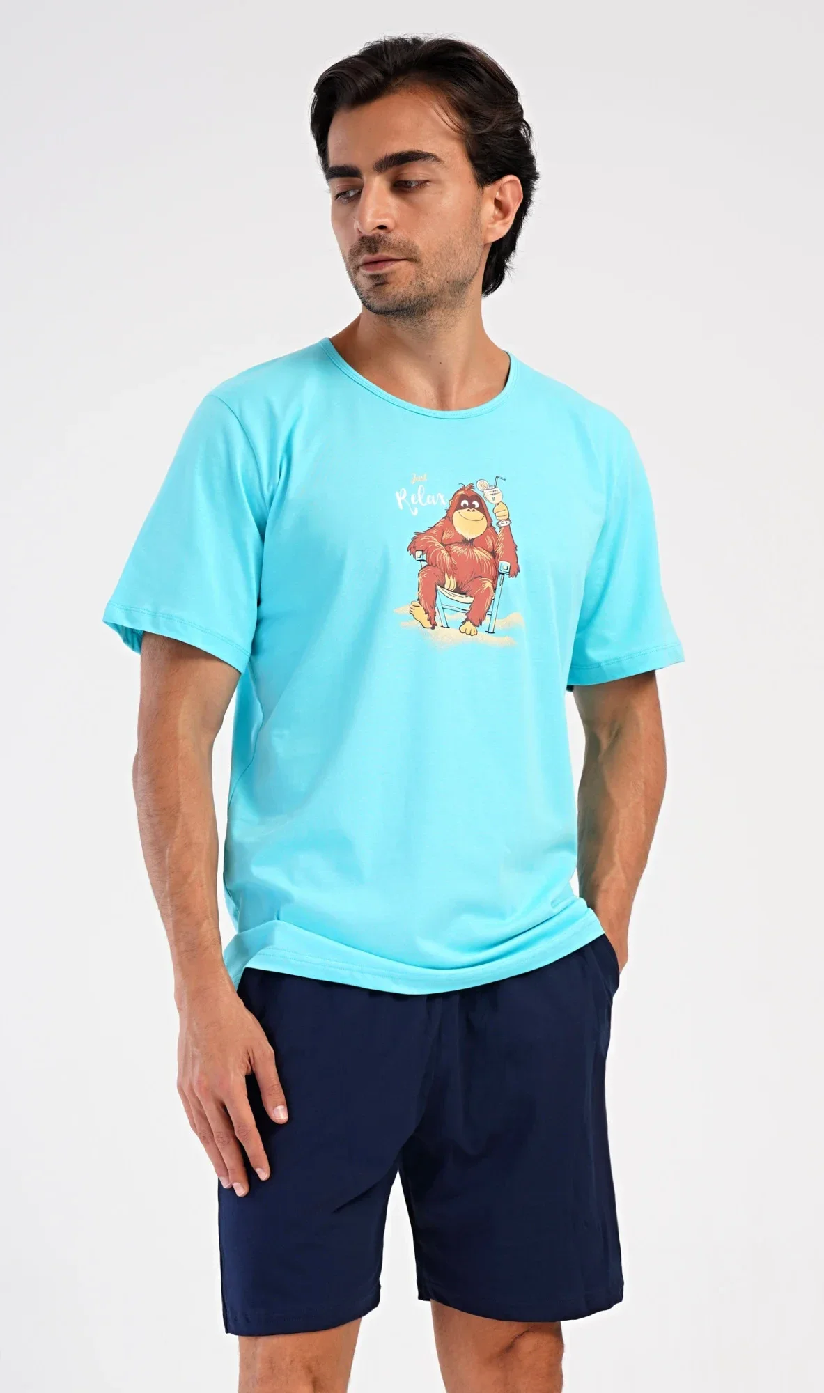 Pánské bavlněné šortkové pyžamo Relax. Pánské pyžamo se skládá z trička s krátkým rukávem a krátkých šortkových kalhot. Na jednobarevném tričku je obrázek opičáka, který relaxuje na pláži s drinkem. Šortky mají praktické kapsy, v pase gumu a šňůrku na stáhnutí. Použitý materiál s podílem bavlny 100% je příjemný a poddaný na dotek. Pyžamo je vhodné i na denní nošení a oceníte ho obzvlášť v horkých letních dnech.