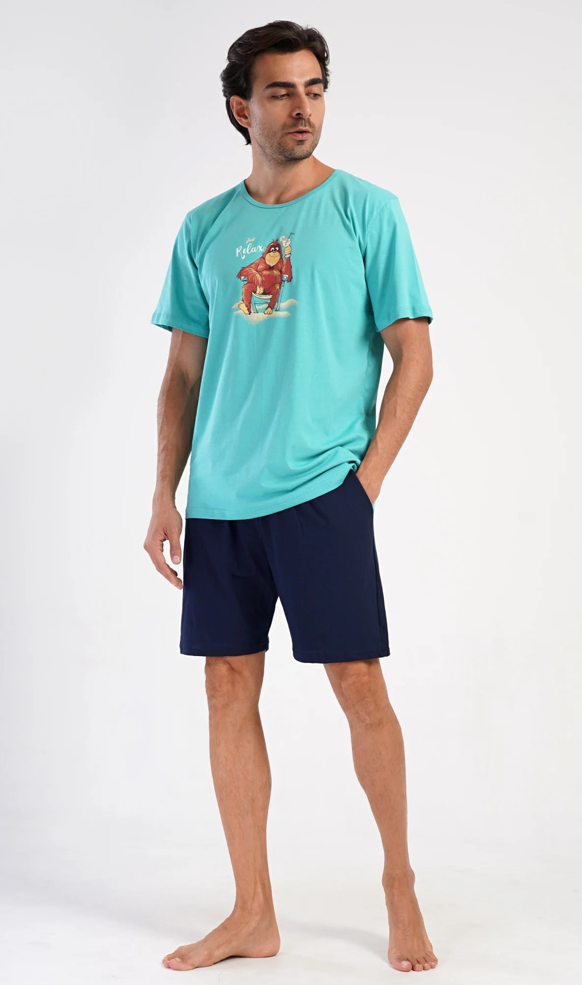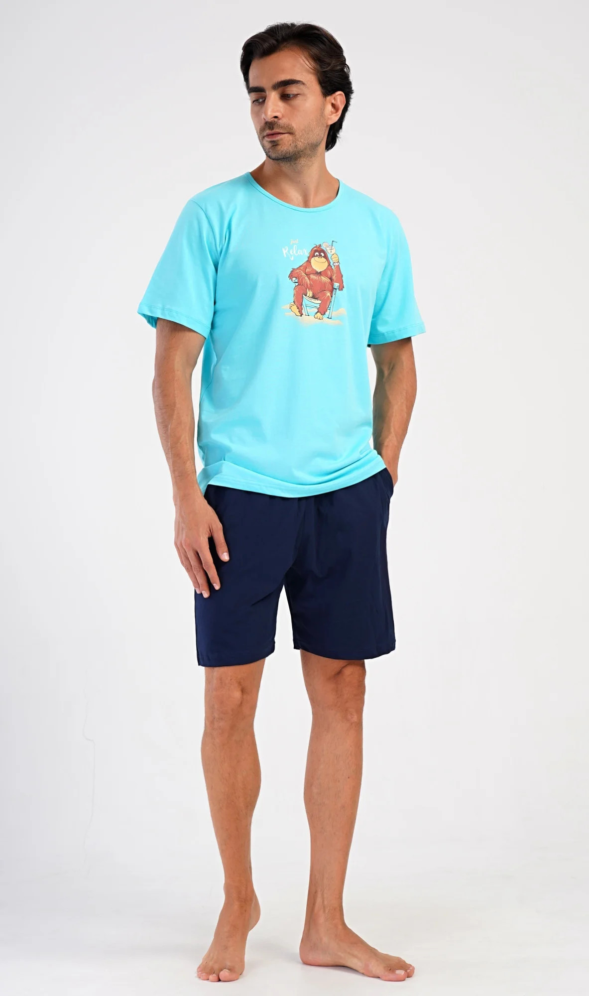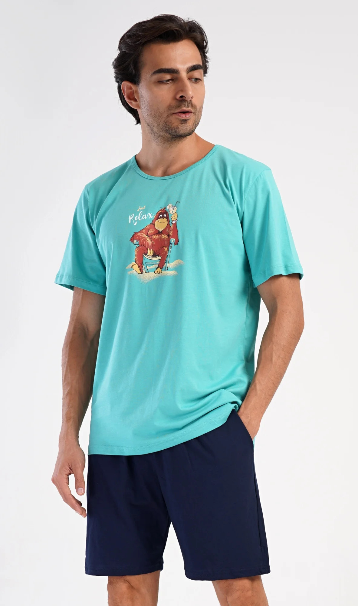 Pánské bavlněné šortkové pyžamo Relax. Pánské pyžamo se skládá z trička s krátkým rukávem a krátkých šortkových kalhot. Na jednobarevném tričku je obrázek opičáka, který relaxuje na pláži s drinkem. Šortky mají praktické kapsy, v pase gumu a šňůrku na stáhnutí. Použitý materiál s podílem bavlny 100% je příjemný a poddaný na dotek. Pyžamo je vhodné i na denní nošení a oceníte ho obzvlášť v horkých letních dnech.