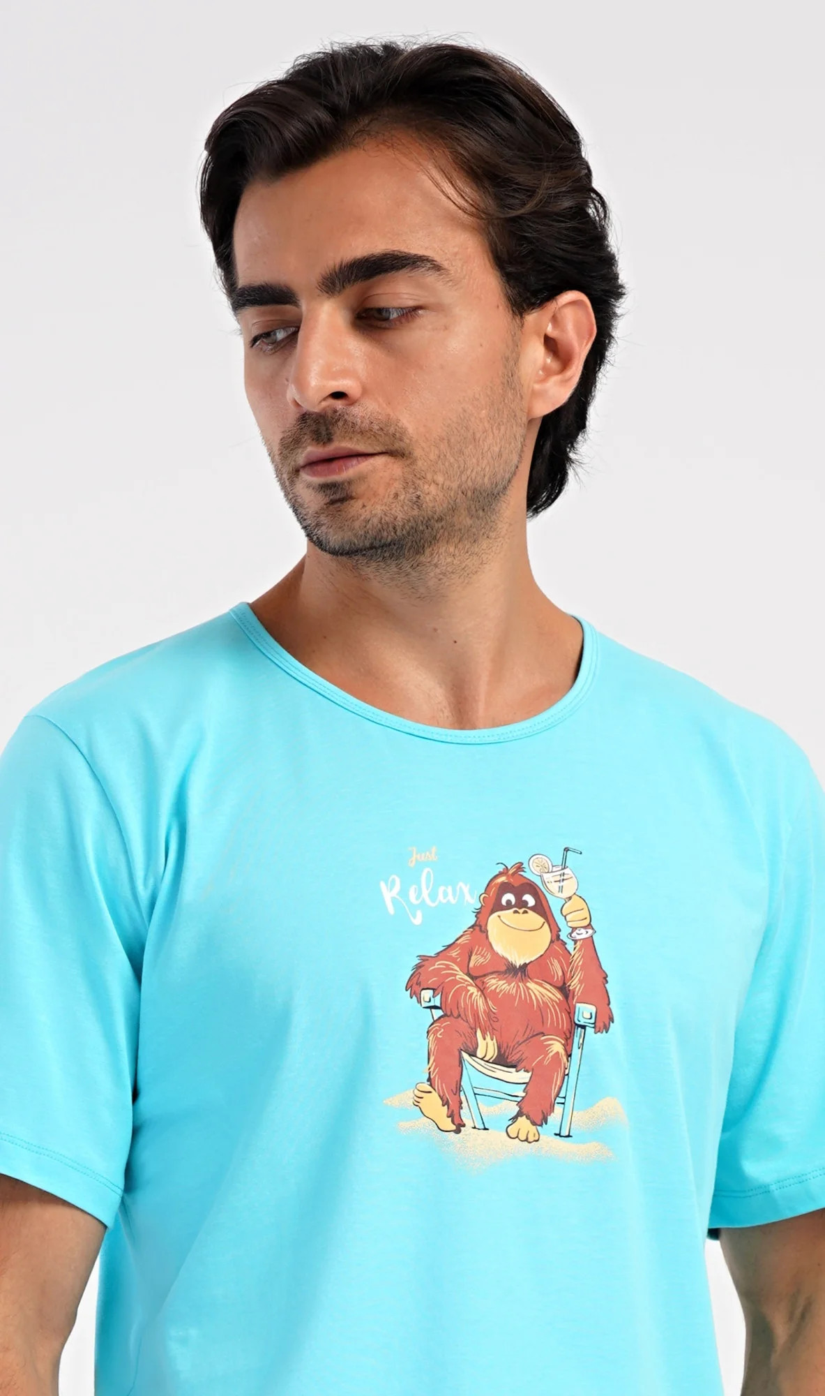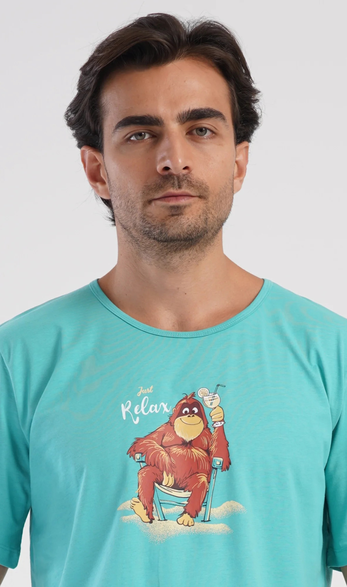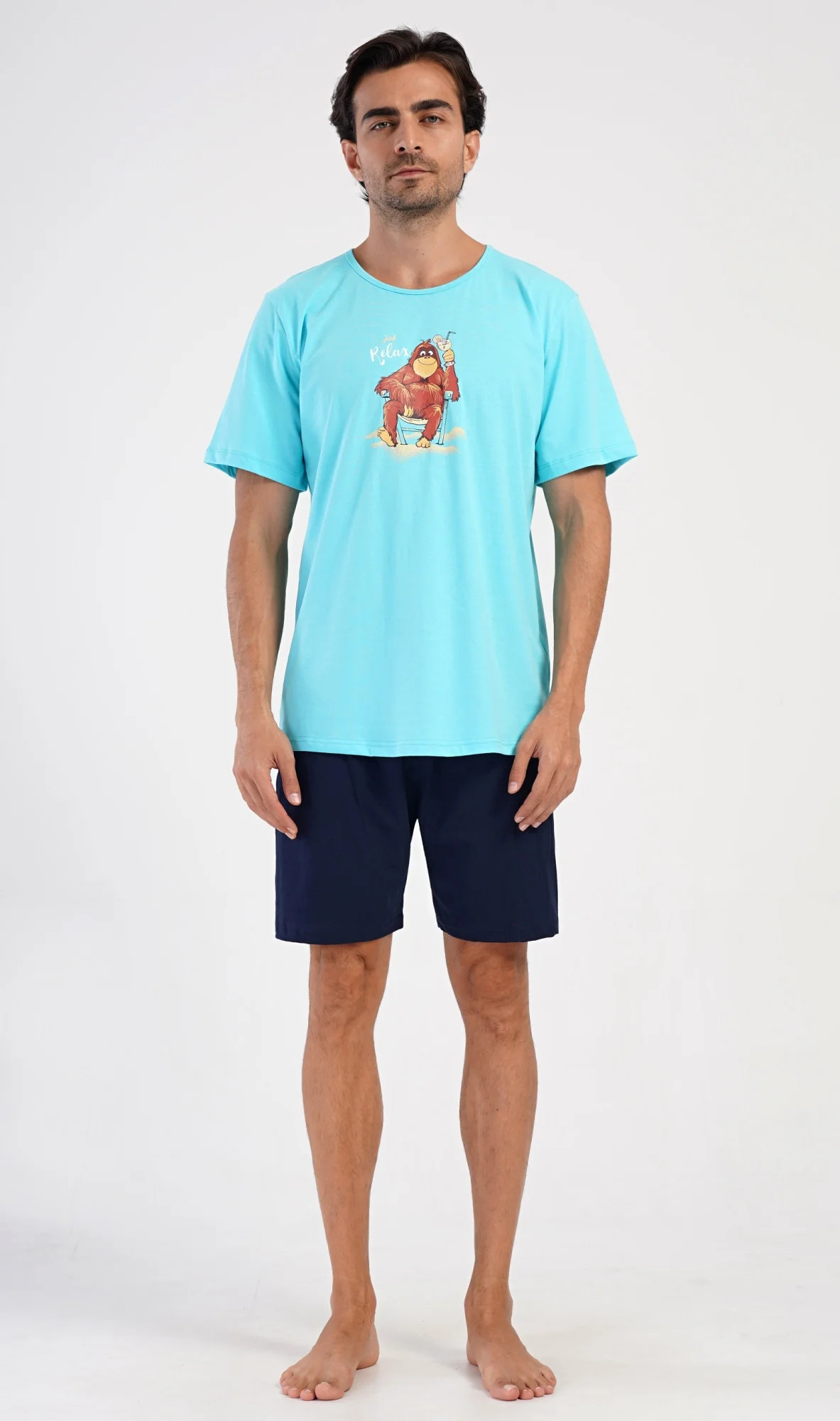 Pánské bavlněné šortkové pyžamo Relax. Pánské pyžamo se skládá z trička s krátkým rukávem a krátkých šortkových kalhot. Na jednobarevném tričku je obrázek opičáka, který relaxuje na pláži s drinkem. Šortky mají praktické kapsy, v pase gumu a šňůrku na stáhnutí. Použitý materiál s podílem bavlny 100% je příjemný a poddaný na dotek. Pyžamo je vhodné i na denní nošení a oceníte ho obzvlášť v horkých letních dnech.