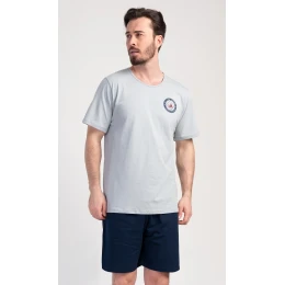 Pánské bavlněné pyžamo šortky Sea. Pánské pyžamo se skládá z trička s kulatým výstřihem a krátkých šortkových kalhot. Tričko s krátkým rukávem má na hrudi decentní obrázek s námořnickým motivem. Doplňují jej jednobarevé krátké kalhoty, které mají v pase gumu a šňůrku na stažení, nemají kapsy. Použitý bavlněný materiál je příjemný a poddajný na dotek. Pyžamo je vhodné i na denní nošení.