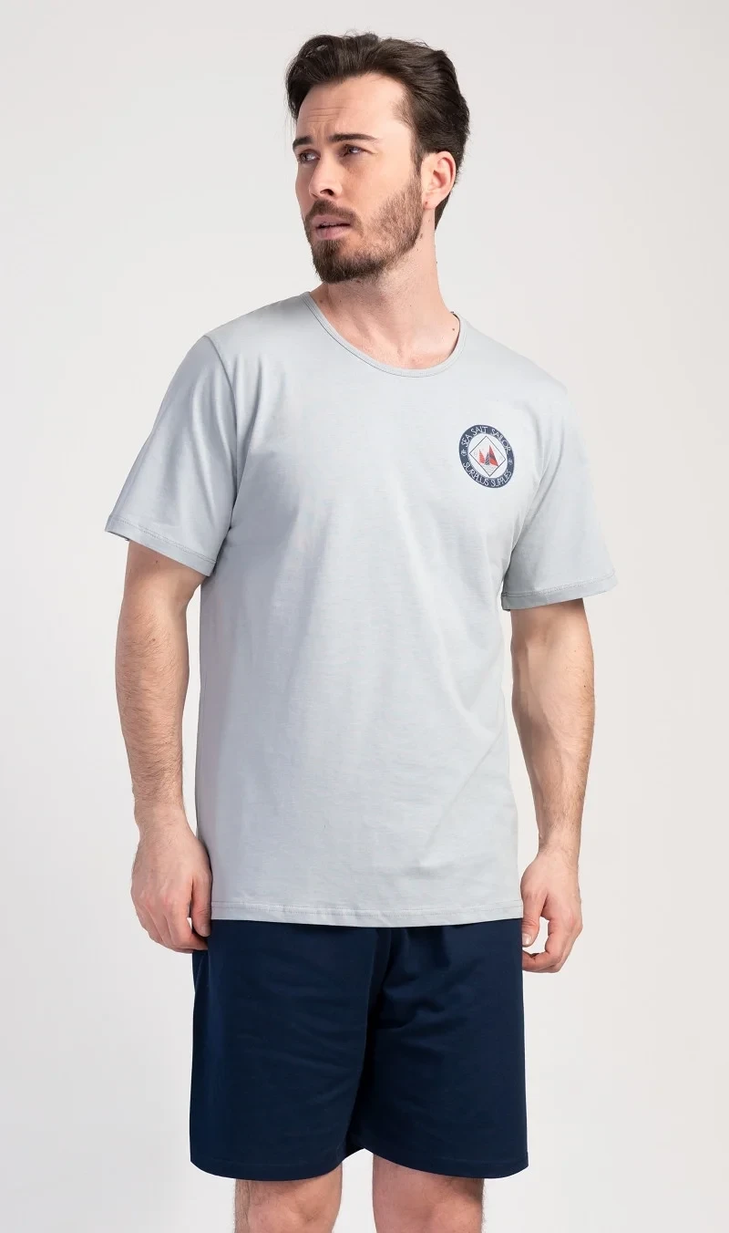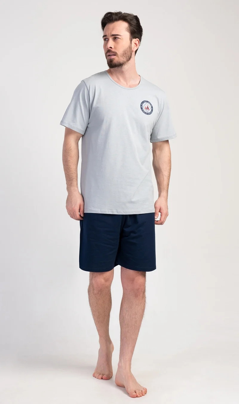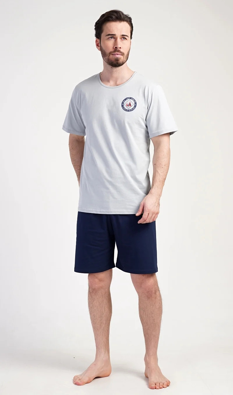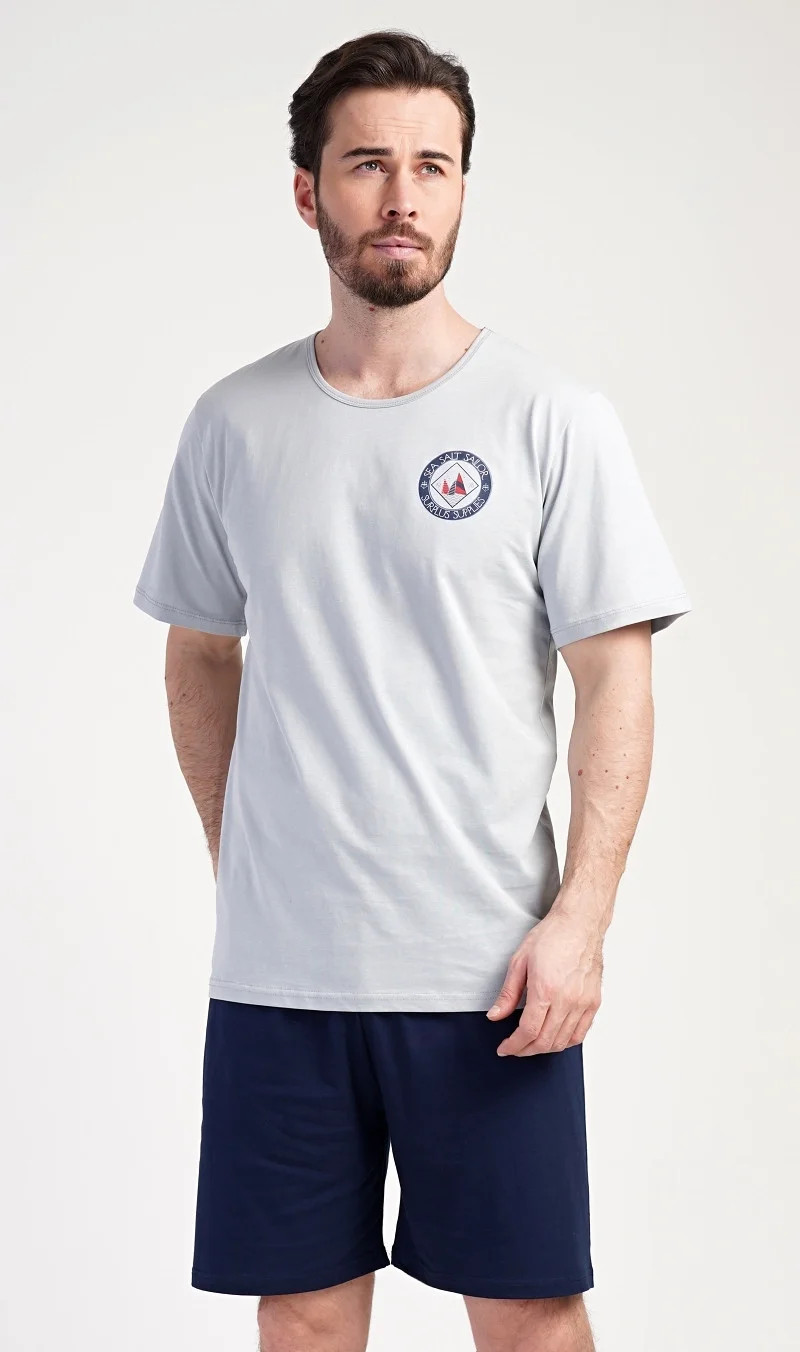 Pánské bavlněné pyžamo šortky Sea. Pánské pyžamo se skládá z trička s kulatým výstřihem a krátkých šortkových kalhot. Tričko s krátkým rukávem má na hrudi decentní obrázek s námořnickým motivem. Doplňují jej jednobarevé krátké kalhoty, které mají v pase gumu a šňůrku na stažení.Šortky jsou bez kapes.. Použitý bavlněný materiál je příjemný a poddajný na dotek. Pyžamo je vhodné i na denní nošení.