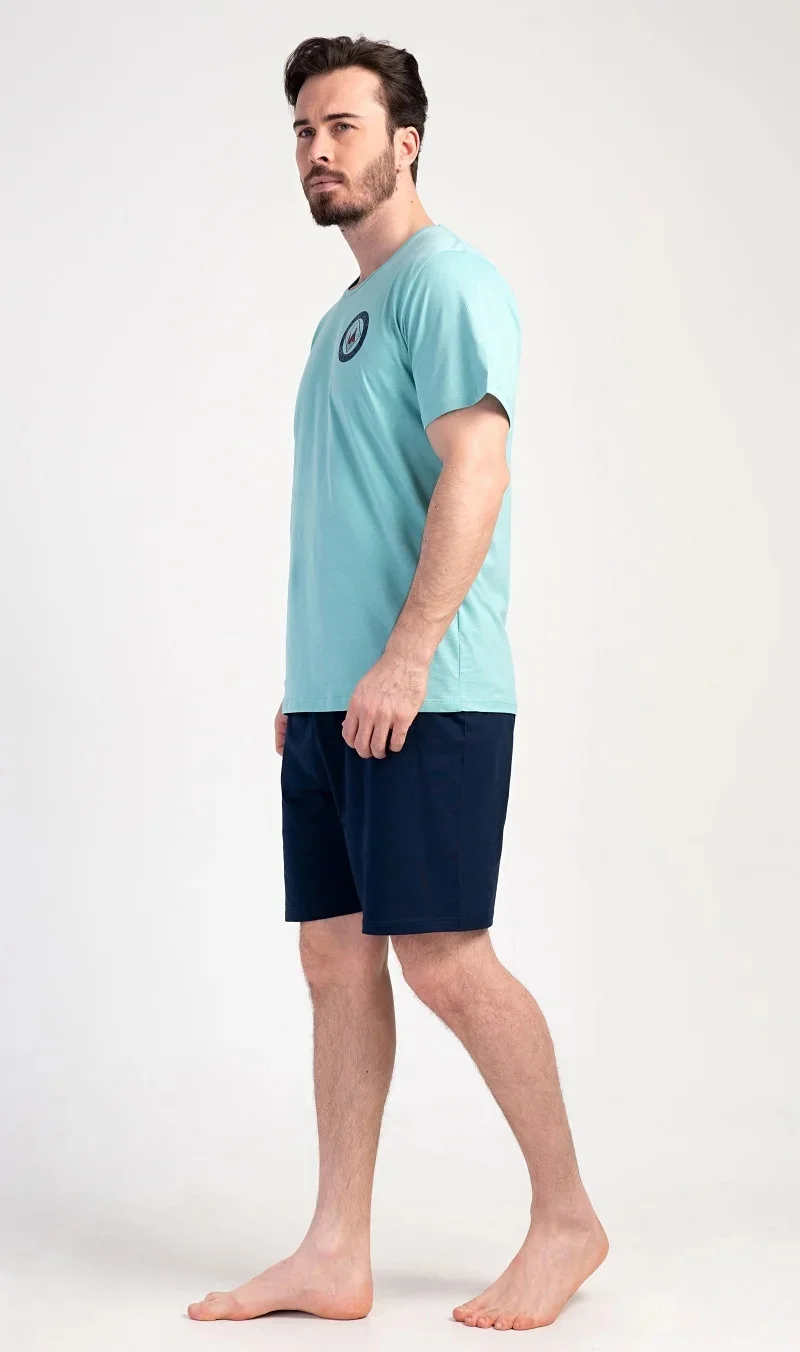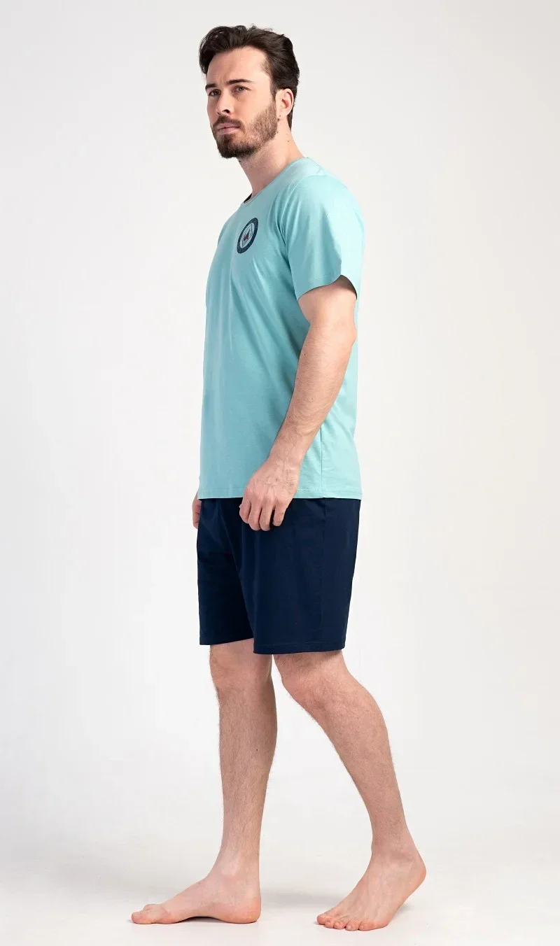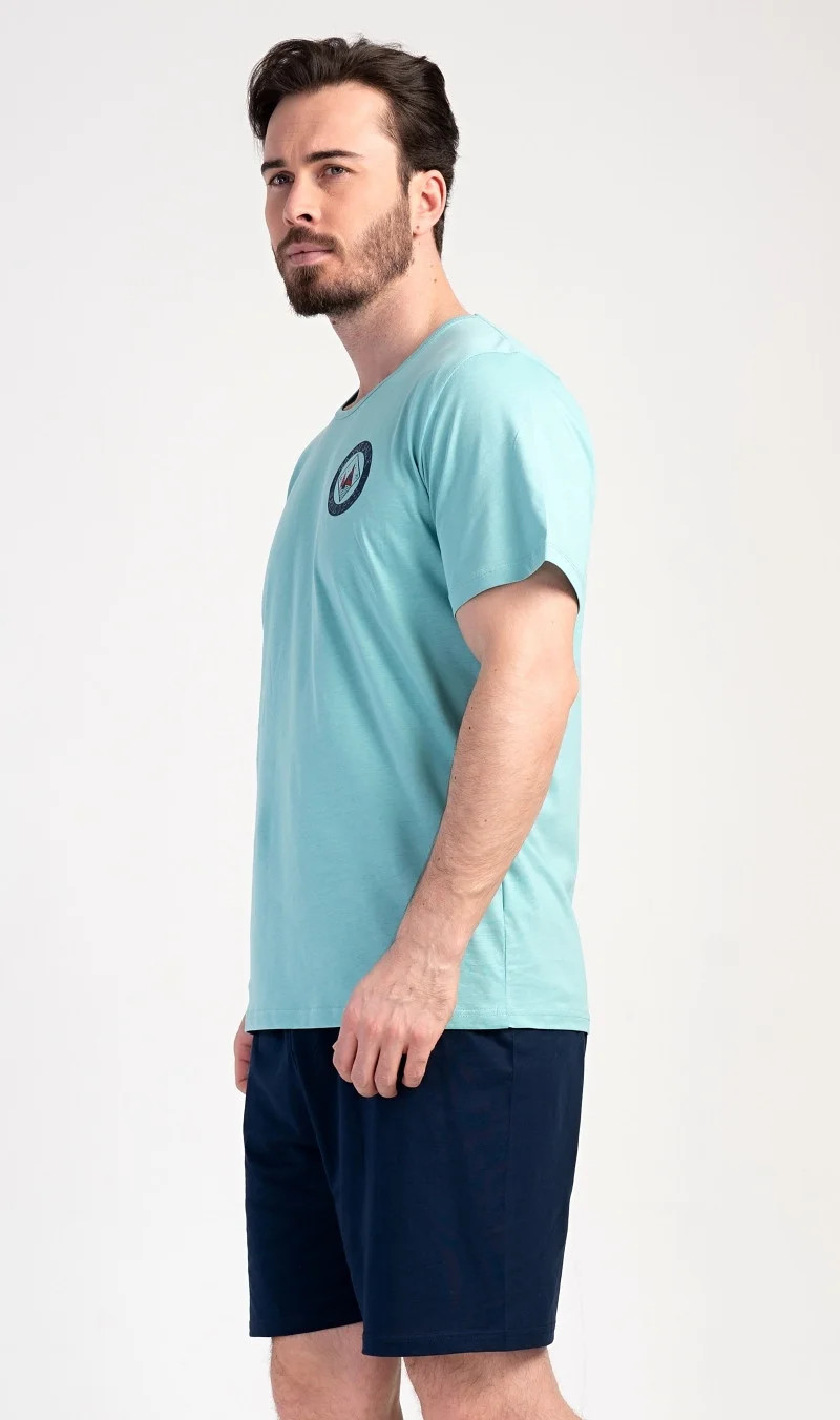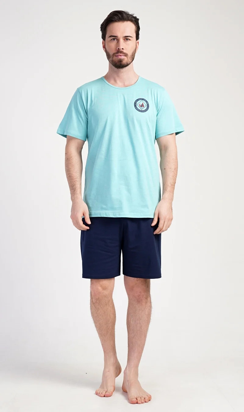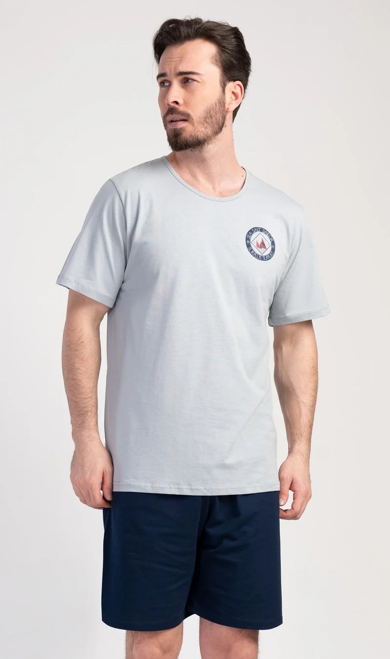 Pánské bavlněné pyžamo šortky Sea. Pánské pyžamo se skládá z trička s kulatým výstřihem a krátkých šortkových kalhot. Tričko s krátkým rukávem má na hrudi decentní obrázek s námořnickým motivem. Doplňují jej jednobarevé krátké kalhoty, které mají v pase gumu a šňůrku na stažení.Šortky jsou bez kapes.. Použitý bavlněný materiál je příjemný a poddajný na dotek. Pyžamo je vhodné i na denní nošení.
