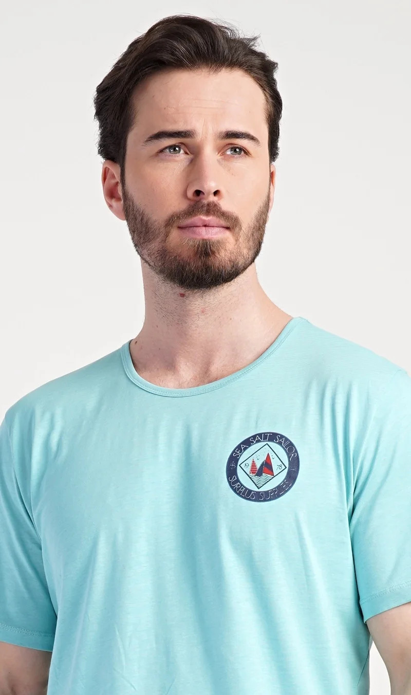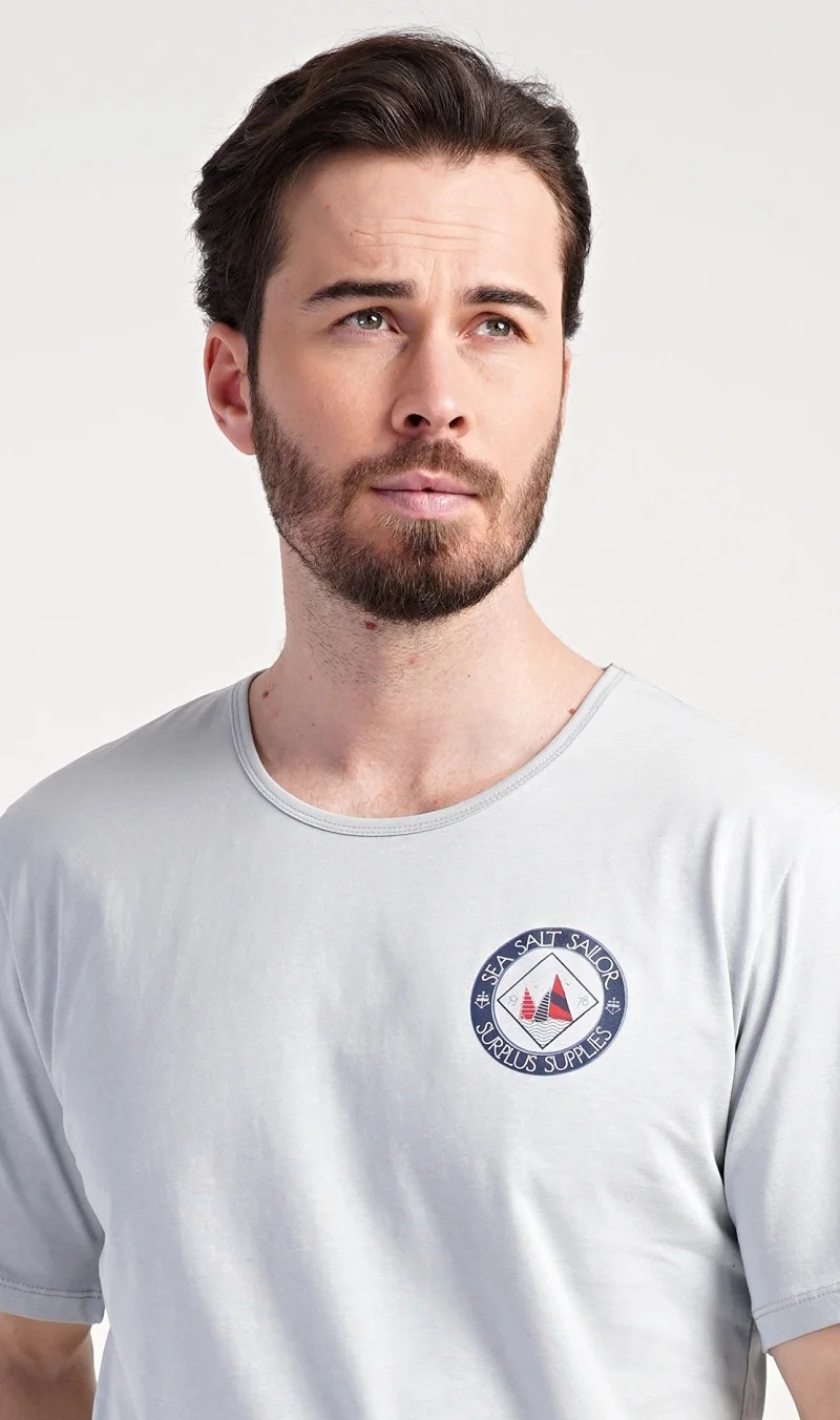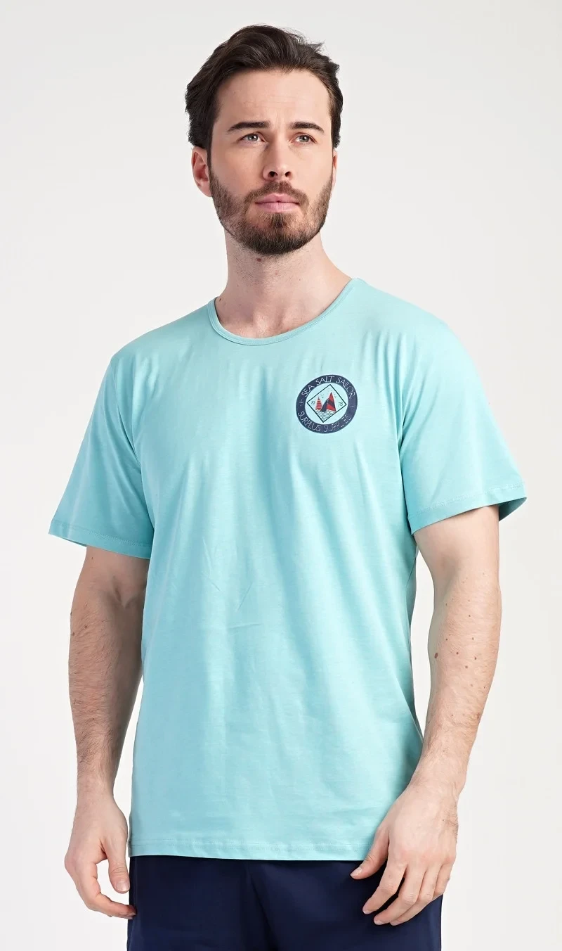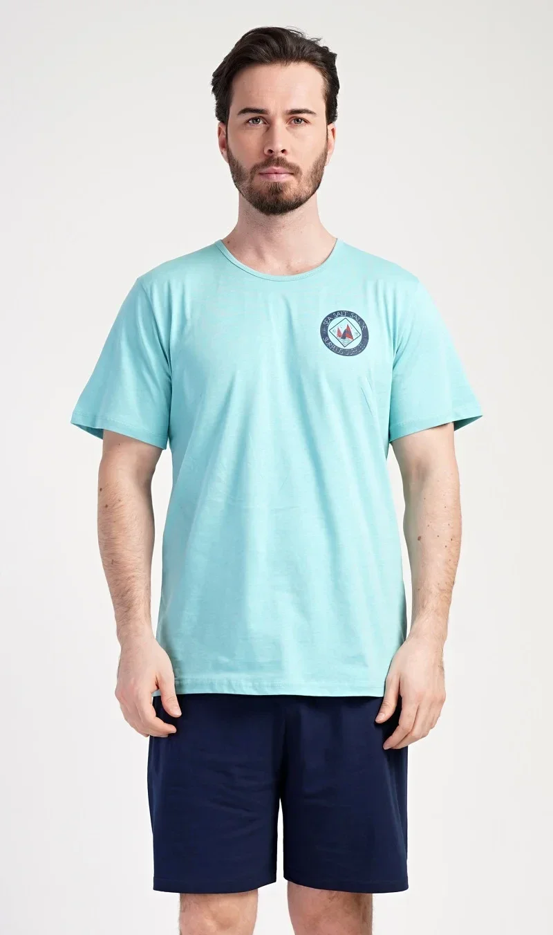 Pánské bavlněné pyžamo šortky Sea. Pánské pyžamo se skládá z trička s kulatým výstřihem a krátkých šortkových kalhot. Tričko s krátkým rukávem má na hrudi decentní obrázek s námořnickým motivem. Doplňují jej jednobarevé krátké kalhoty, které mají v pase gumu a šňůrku na stažení.Šortky jsou bez kapes.. Použitý bavlněný materiál je příjemný a poddajný na dotek. Pyžamo je vhodné i na denní nošení.