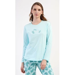Dámské bavlněné dlouhé pyžamo Denisa. Dámské pyžamo se skládá z trika s dlouhým rukávem a dlouhých kalhot. Triko je jednobarevné, zdobené na hrudi drobným obrázkem větviček a nápis 'You are beautiful'. Motiv větviček se opakuje i na kalhotách, které mají v pase gumu a šňůrku na stažení, nemají kapsy. Použitý bavlněný materiál je poddajný a příjemný na dotek.