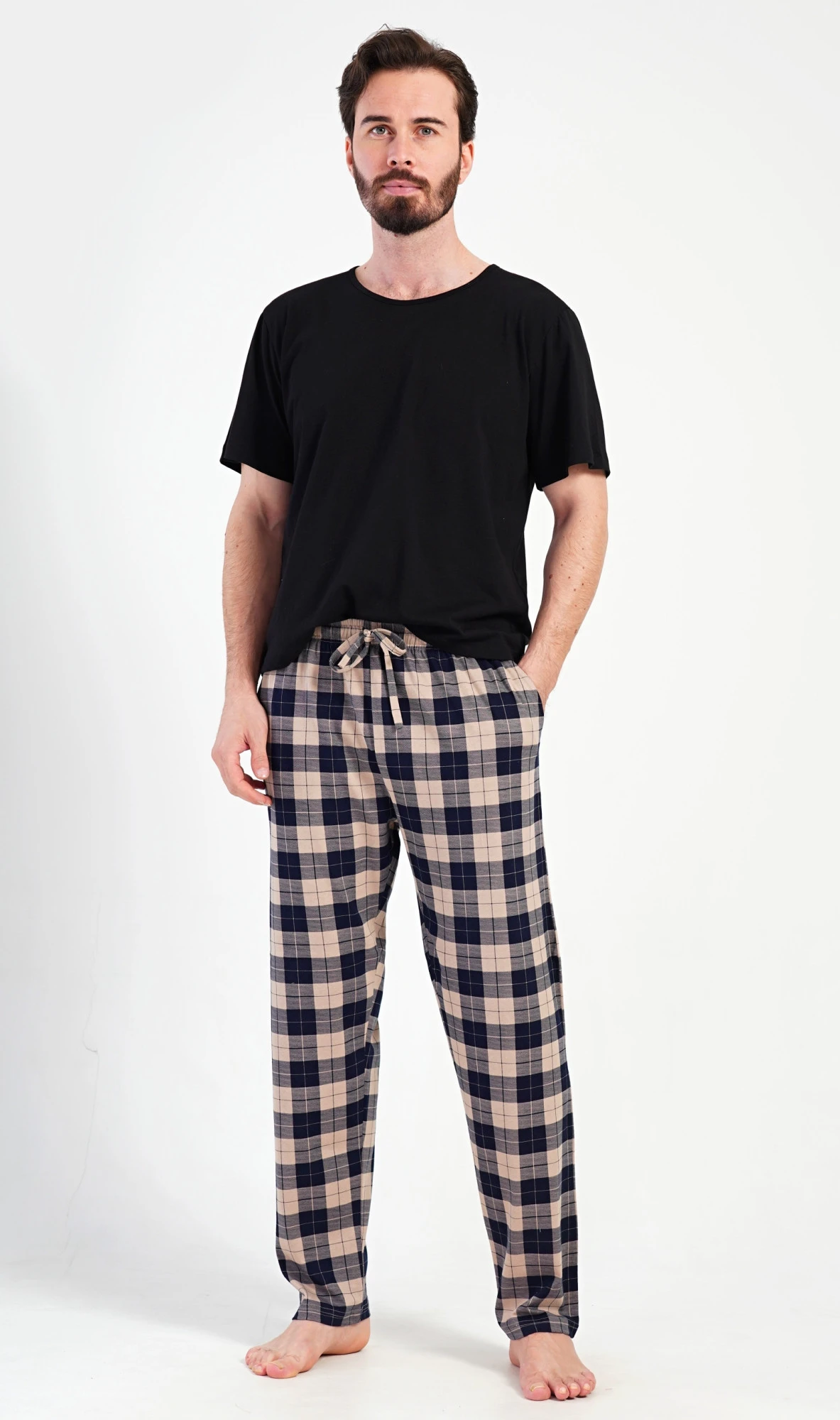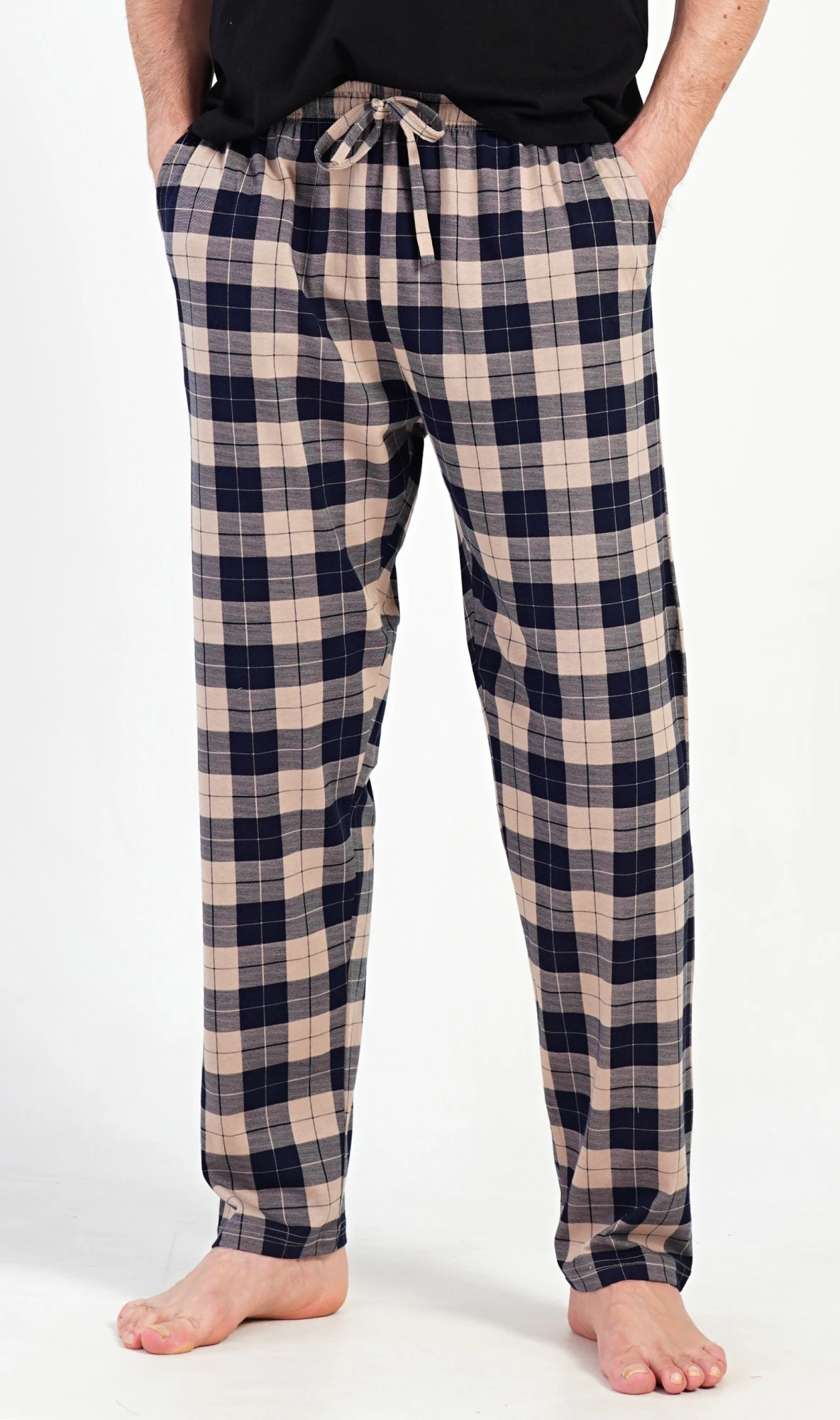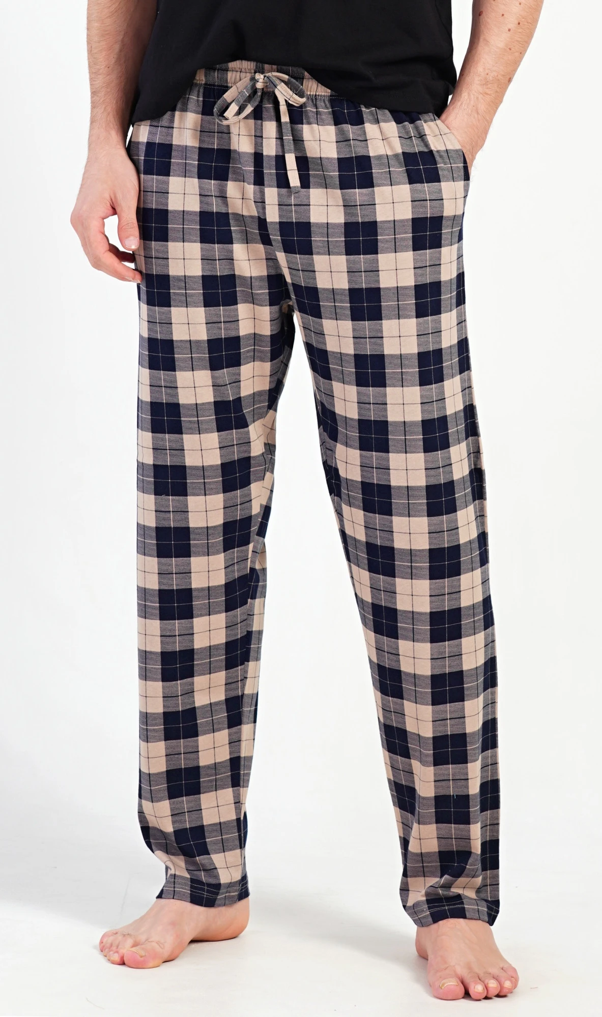 Pánské bavlněné pyžamové kalhoty Marian. Kostkované kalhoty mají v pase gumu, šňůrku na stažení a praktické kapsy. Mateiriál s podílem bavlny 100% je příjemný a poddajný na dotek.