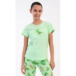 Dětské bavlněné pyžamo kapri Ella. Dětské pyžamo se skládá z trička s krátkým rukávem a tříčtvrtečních kalhot. Na jednobarevném tričku je obrázek veselé ještěrky. Tento motiv se opakuje i na kalhotách, které mají délku pod kolena. Použitý bavlněný materiál je příjemný a poddajný na dotek.