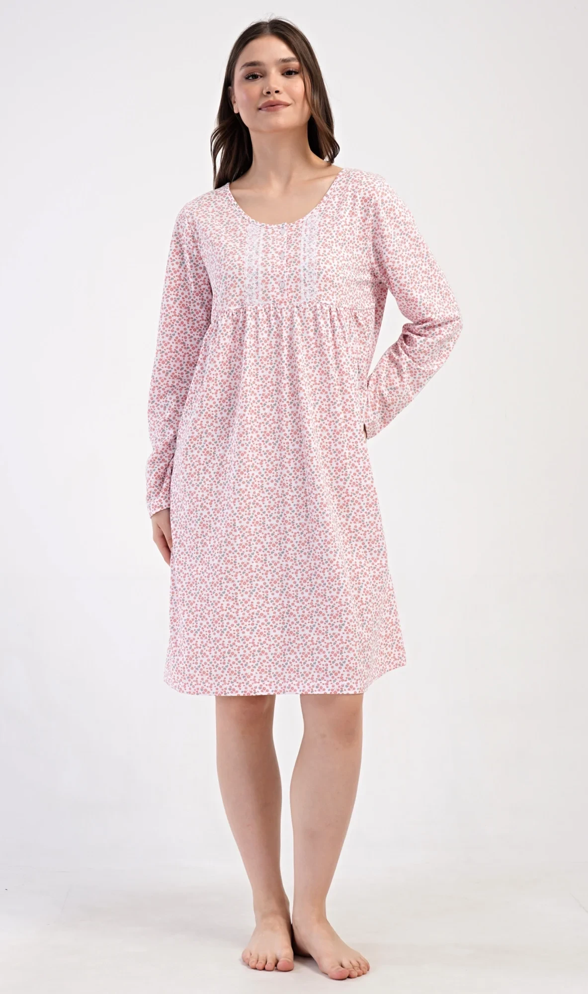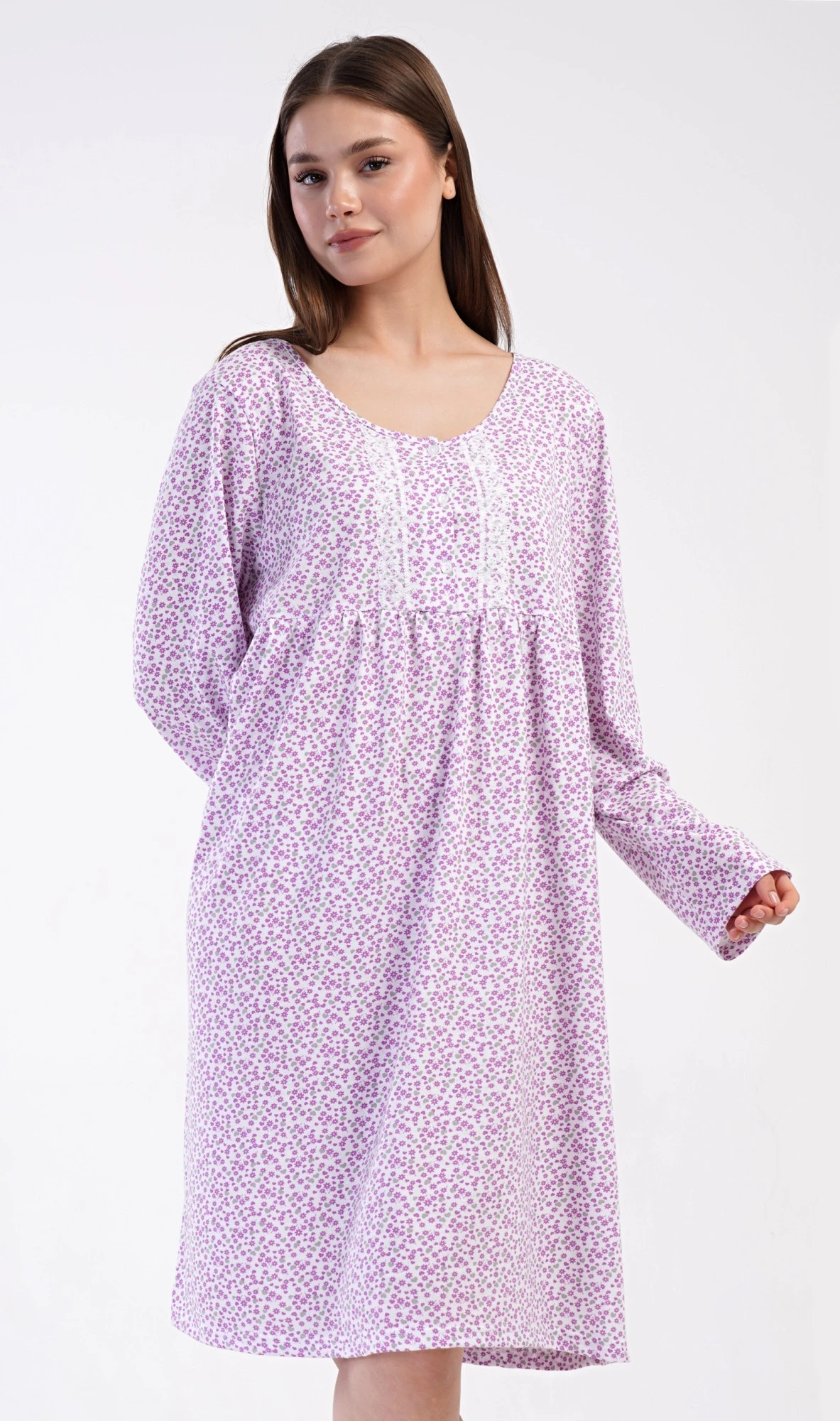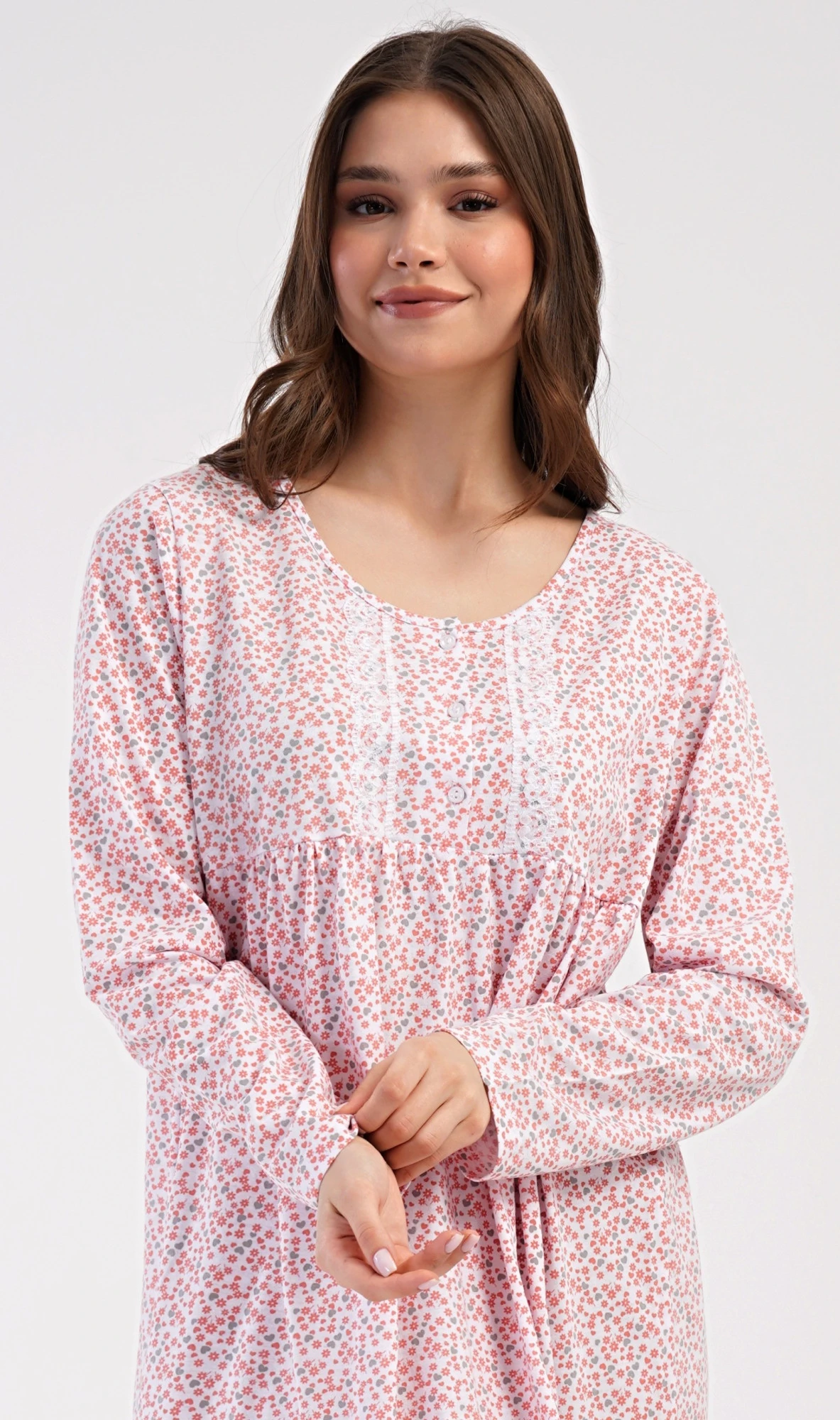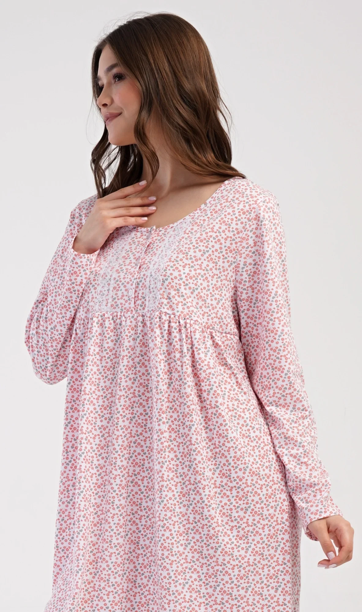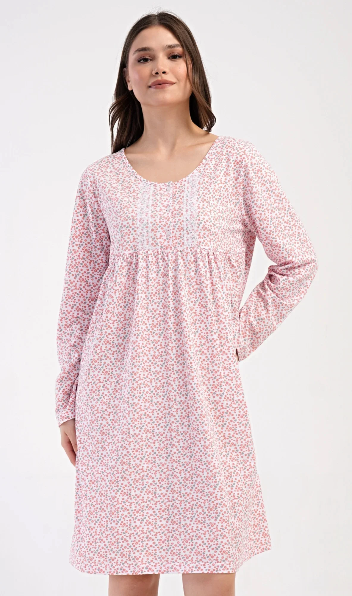 Dámská bavlněná noční košile s dlouhým rukávem Julie. Klasická dámská noční košile pro všechny milovnice starých časů a pohodlí v příjemné délce do půli lýtek. Látka košile je potištěna drobnými květy, ozvláštněna krajkou a krátkou légou se třemi knoflíčky. Použitý materiál s podílem bavlny 100% je příjemný a poddajný na dotek.