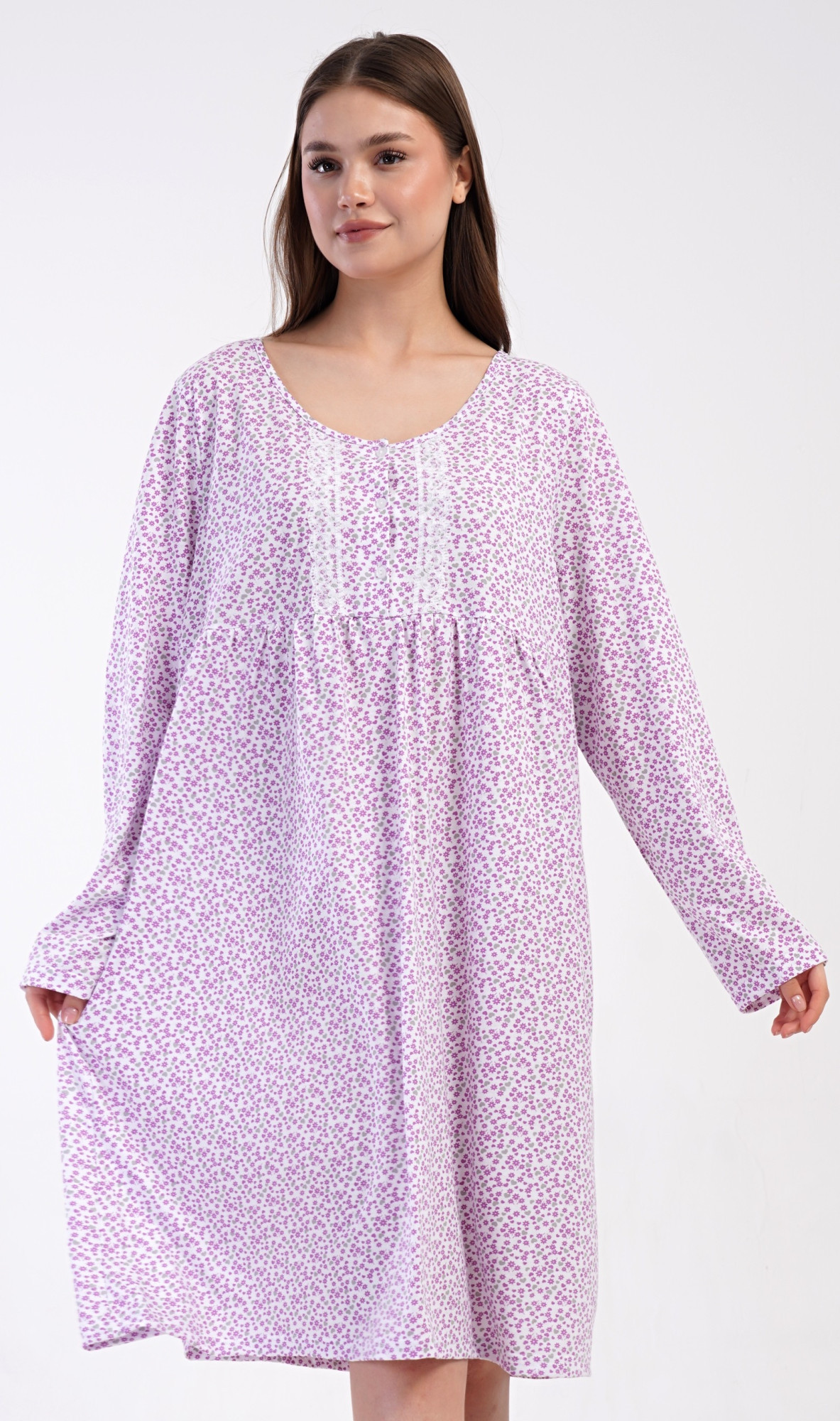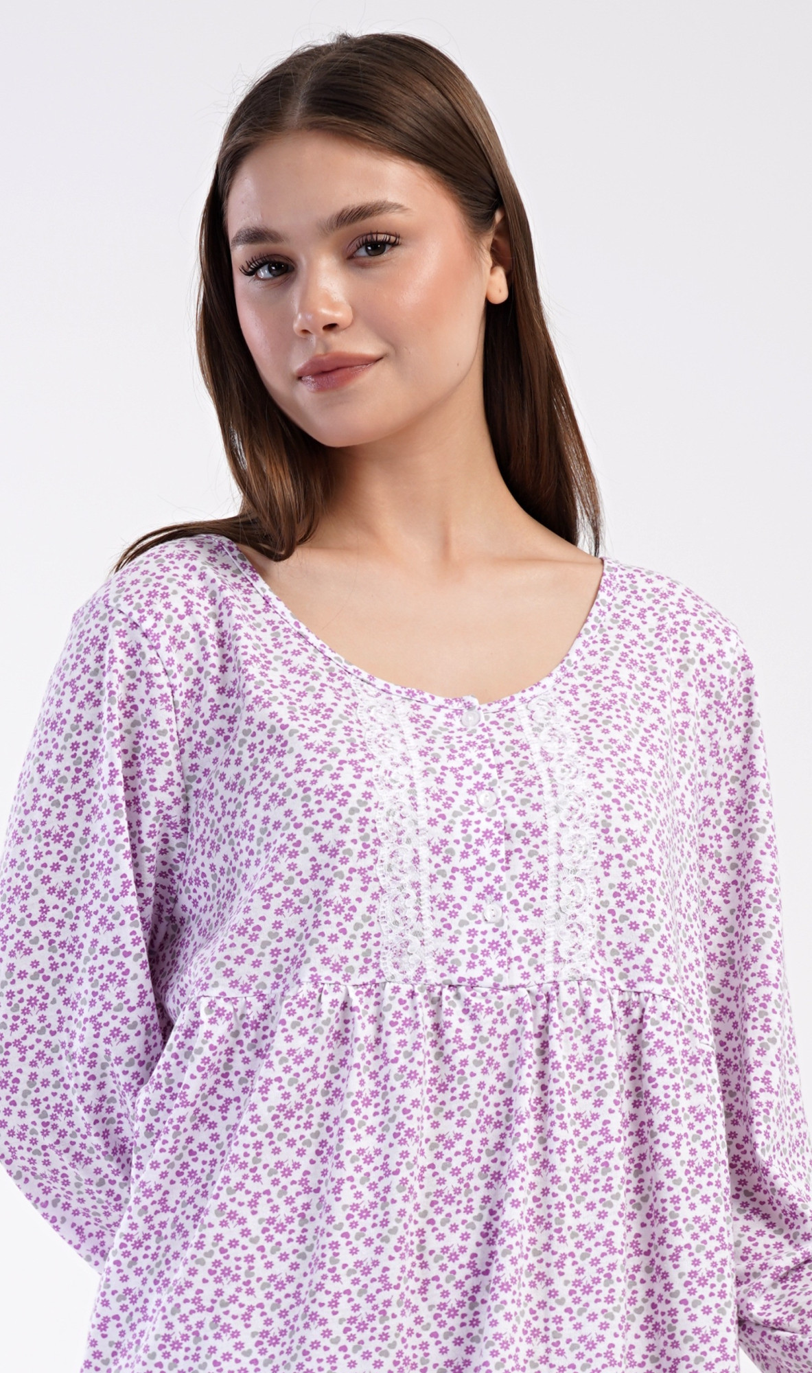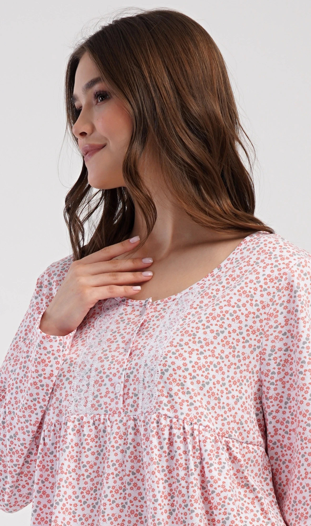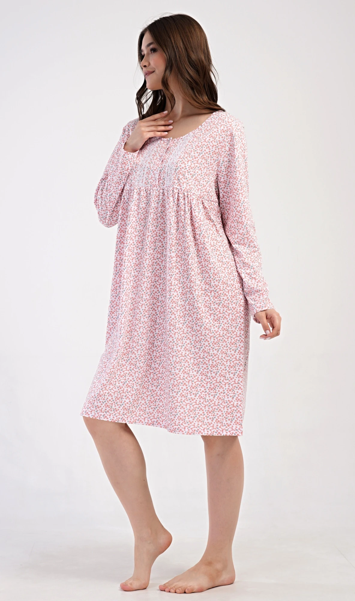 Dámská bavlněná noční košile s dlouhým rukávem Julie. Klasická dámská noční košile pro všechny milovnice starých časů a pohodlí v příjemné délce do půli lýtek. Látka košile je potištěna drobnými květy, ozvláštněna krajkou a krátkou légou se třemi knoflíčky. Použitý materiál s podílem bavlny 100% je příjemný a poddajný na dotek.