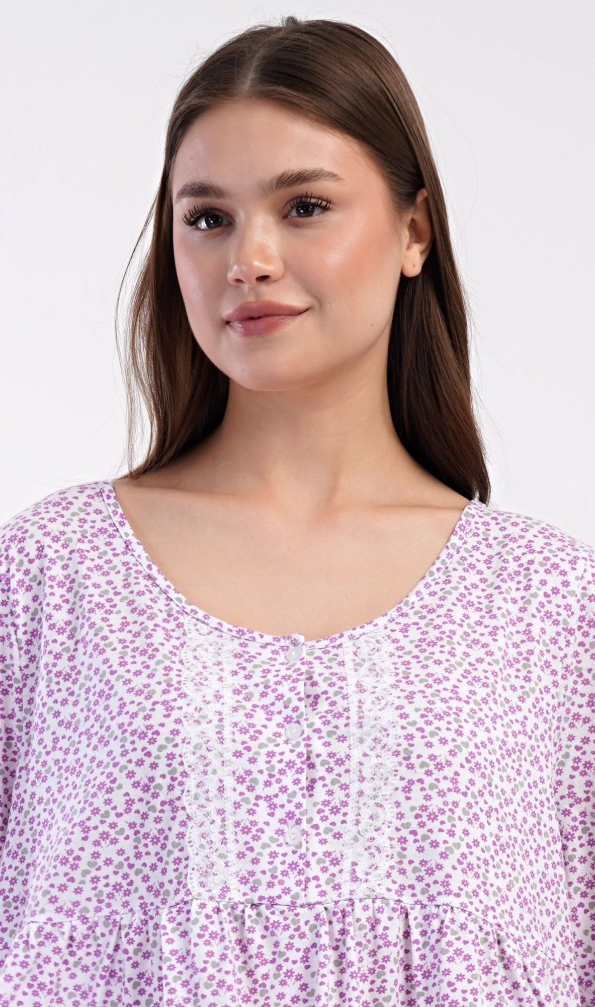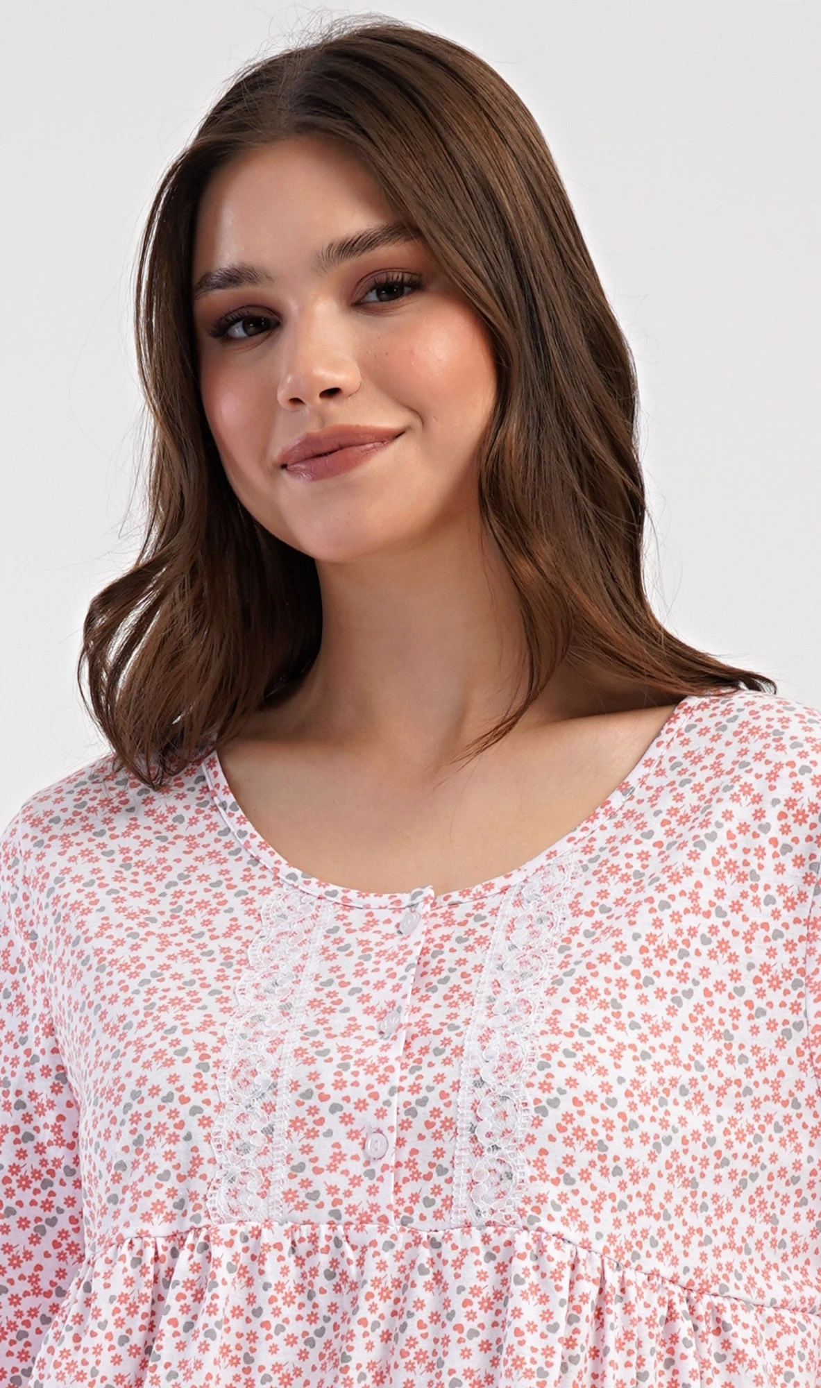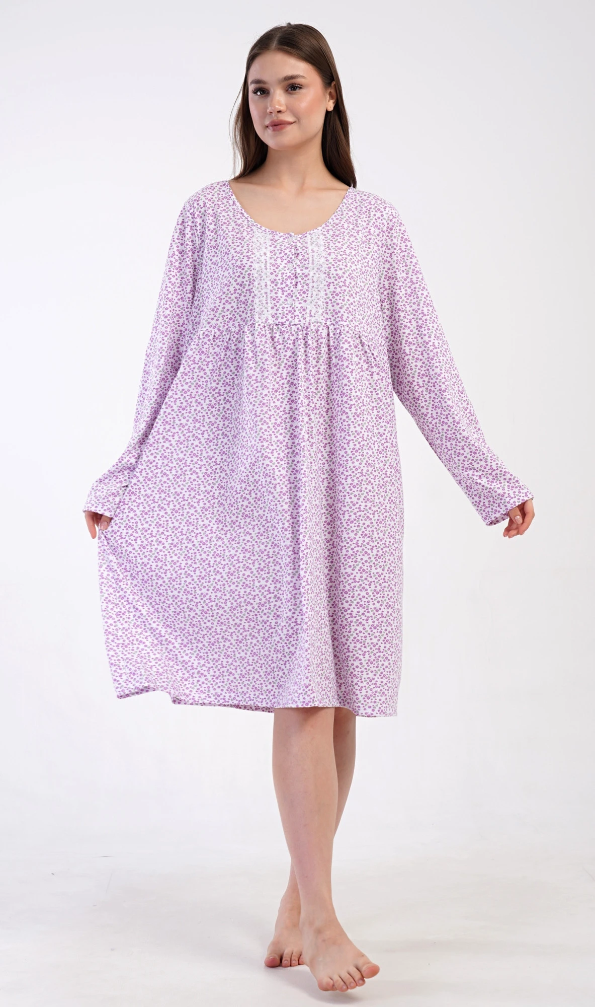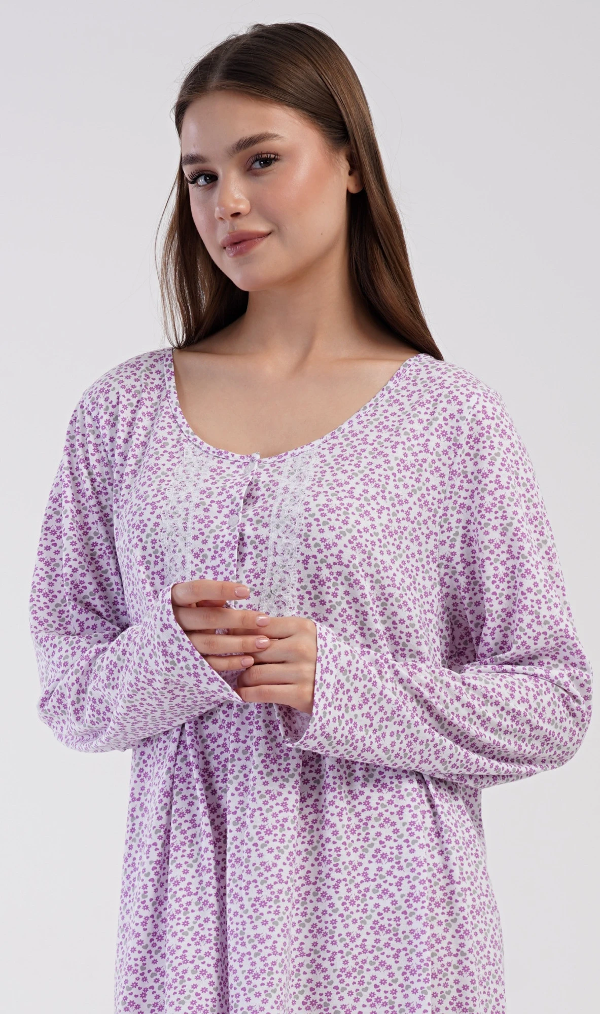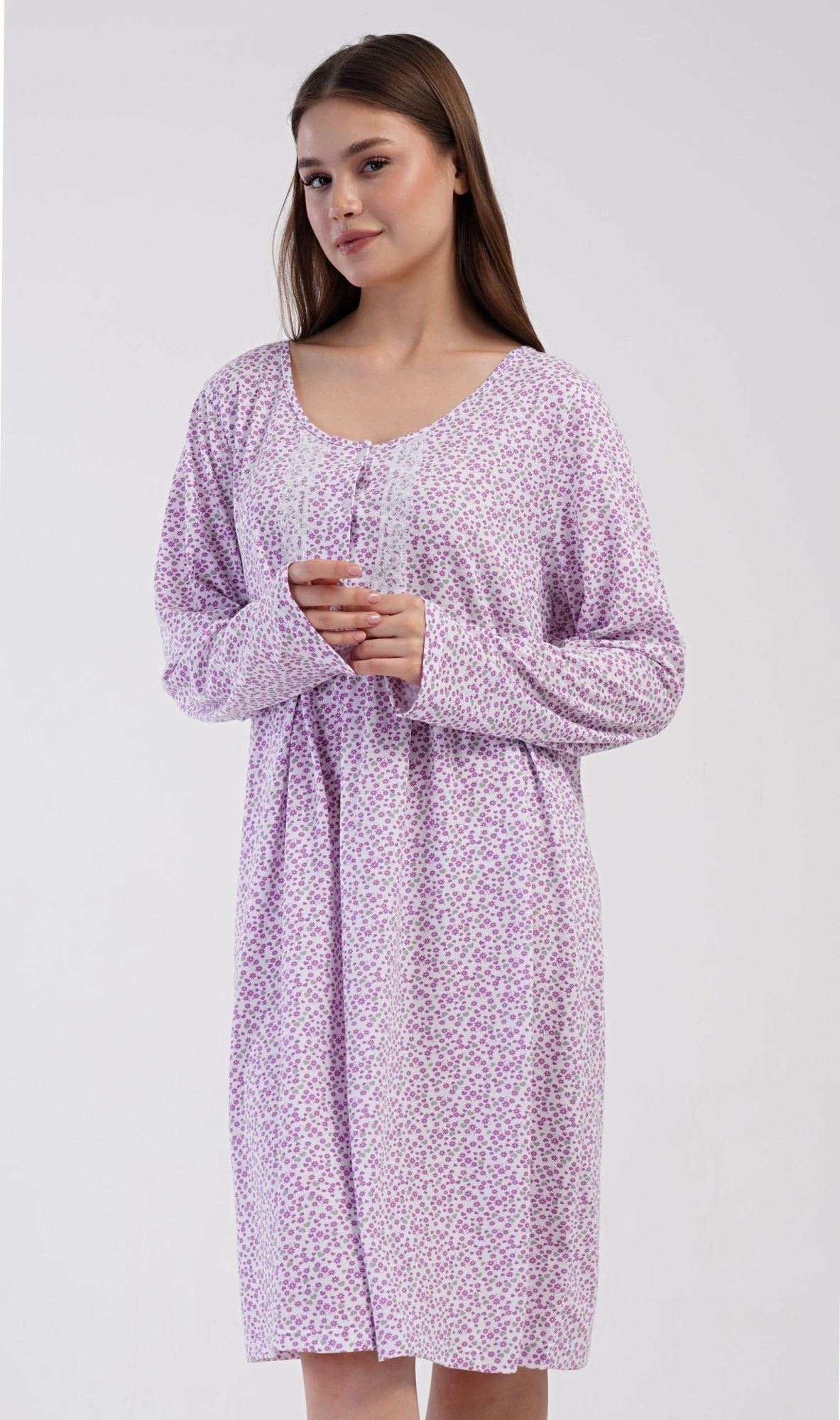 Dámská bavlněná noční košile s dlouhým rukávem Julie. Klasická dámská noční košile pro všechny milovnice starých časů a pohodlí v příjemné délce do půli lýtek. Látka košile je potištěna drobnými květy, ozvláštněna krajkou a krátkou légou se třemi knoflíčky. Použitý materiál s podílem bavlny 100% je příjemný a poddajný na dotek.