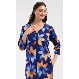 Dámské bavlněné domácí šaty s tříčtvrtečním rukávem Sára. Pohodlné rozepínací šaty v příjemné délce pod kolena využijete téměř při všech volnočasových aktivitách. Mají praktické kapsy a zapínání na zip. Šaty jsou potištěny květy. Použitý bavlněný materiál je příjemný a poddajný na dotek.