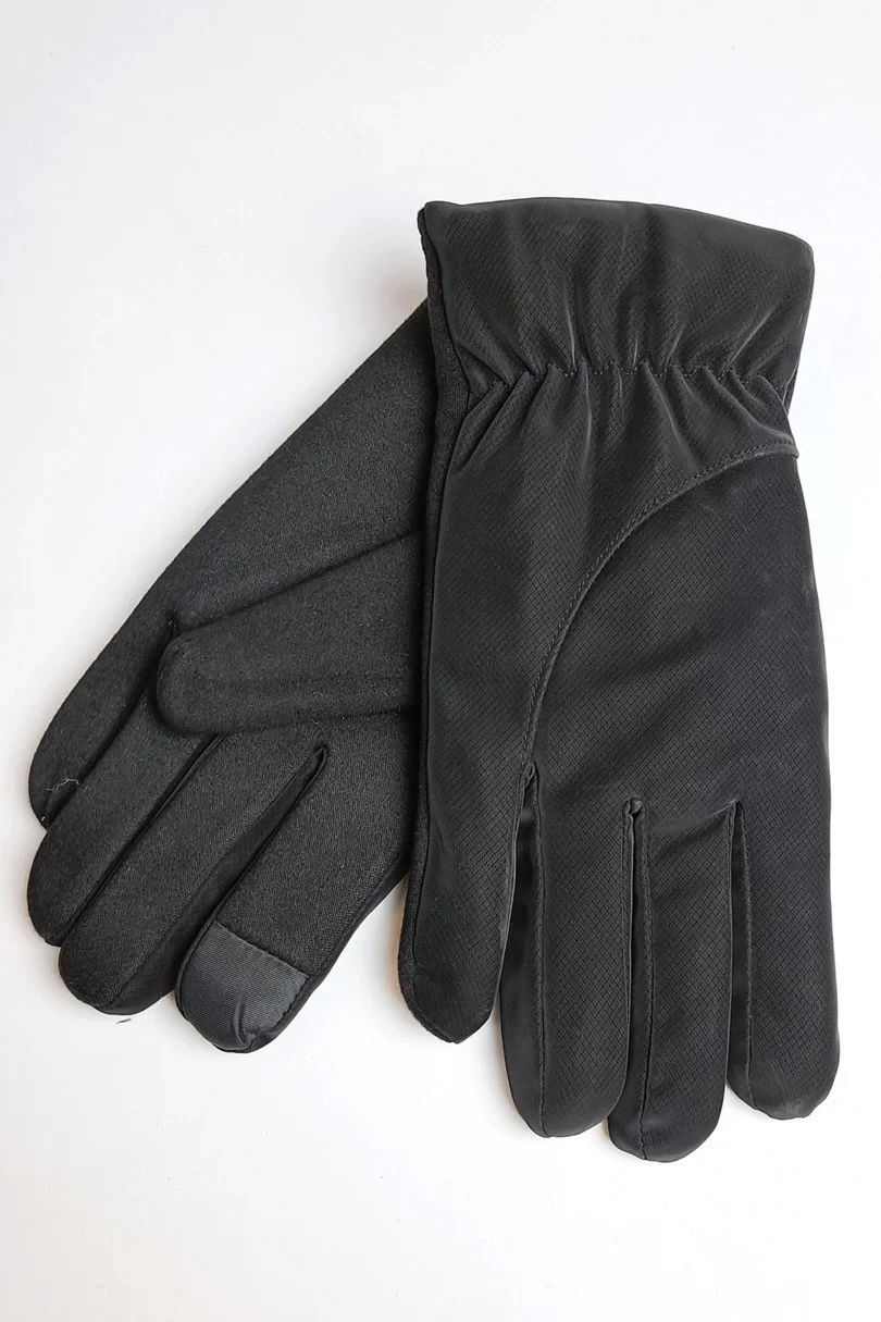 Pánské hřejivé rukavice, spodní část z úpletu, vrchní část z ortalionu, vnitřní strana vrchní části rukavic podšitá hřejivou vrstvou látky. Ukazováček má speciální materiál, který umožňuje ovládat telefon bez nutnosti sundání rukavice.